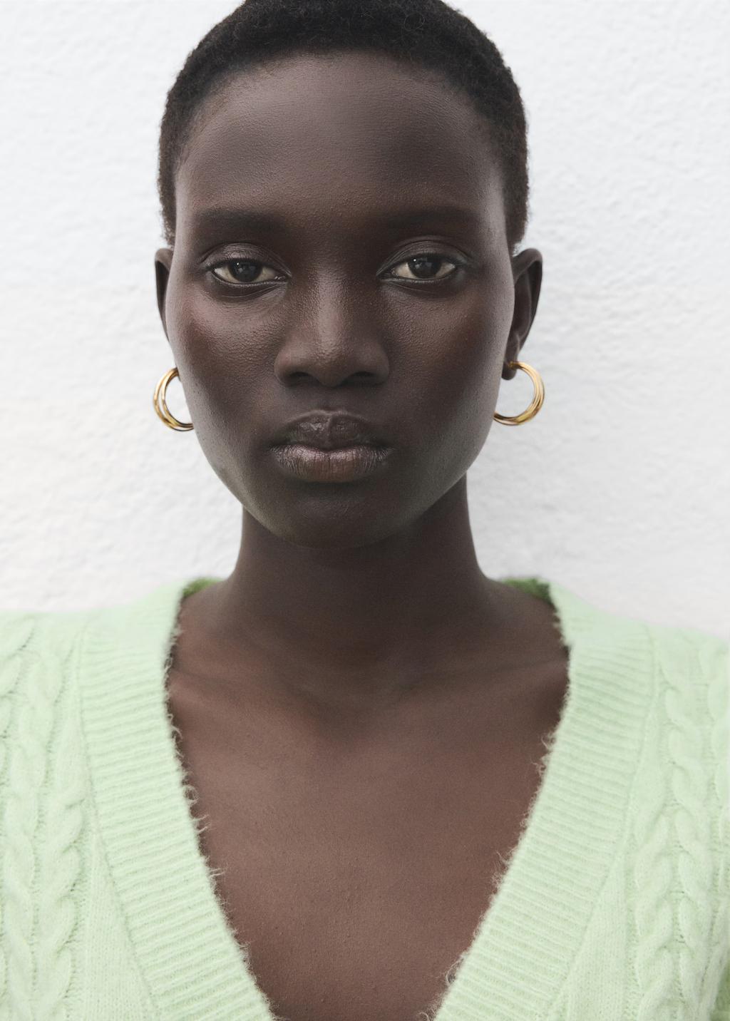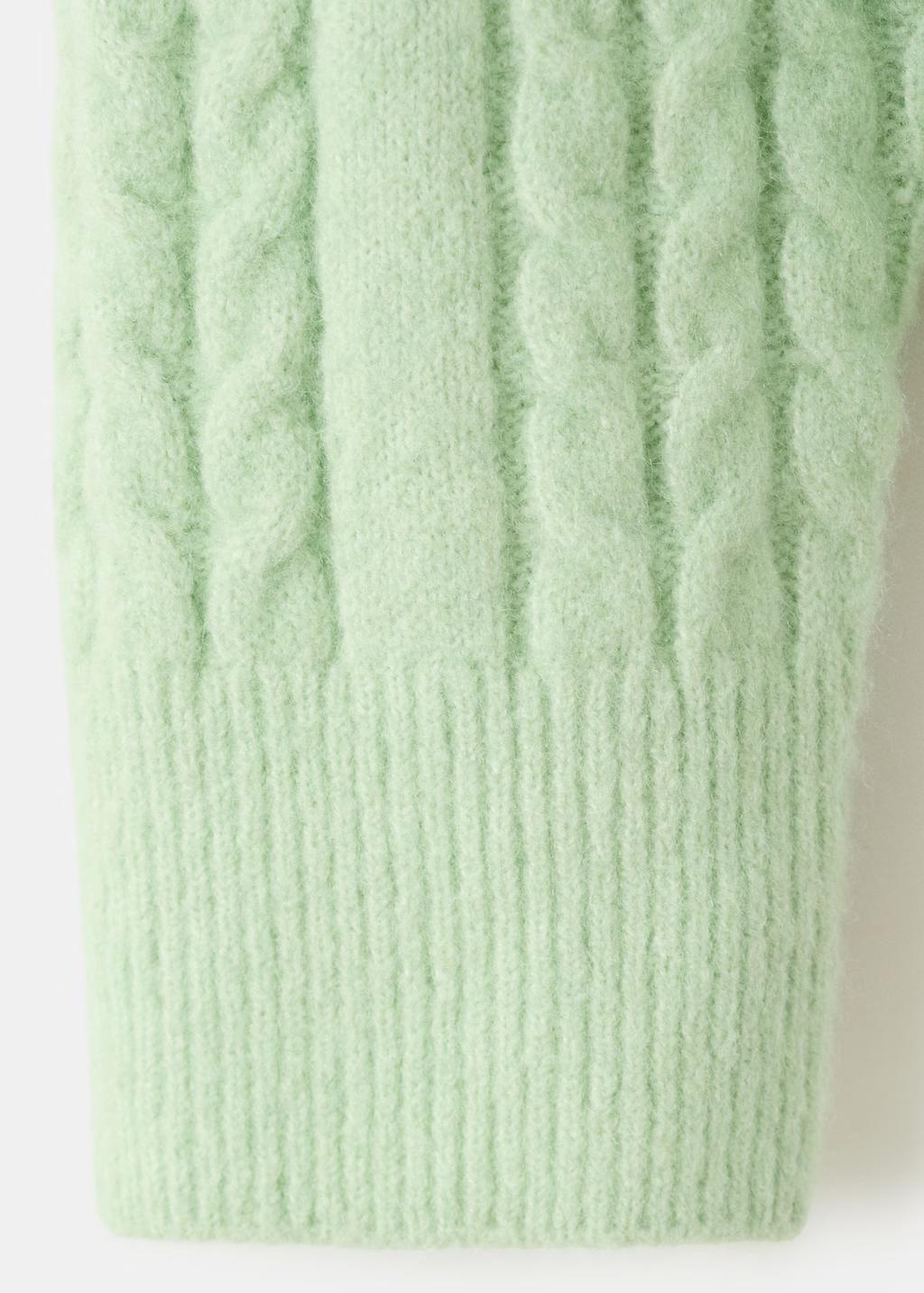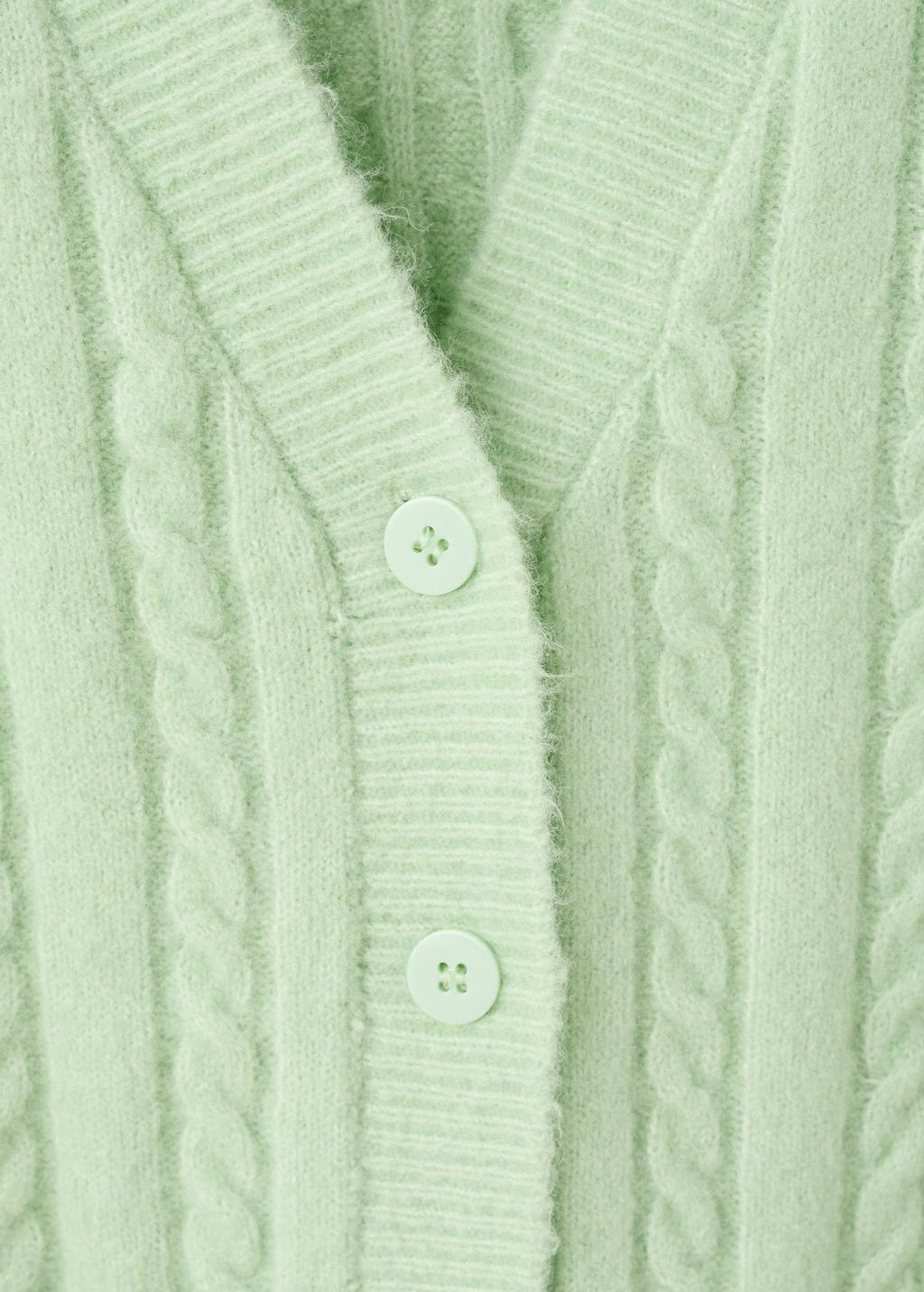 Confeccionado en tejido de punto grueso trenzado, este modelo presenta un diseño recto con cuello pico y manga larga. El cierre delantero con botones añade funcionalidad. Disponible en talla Plus