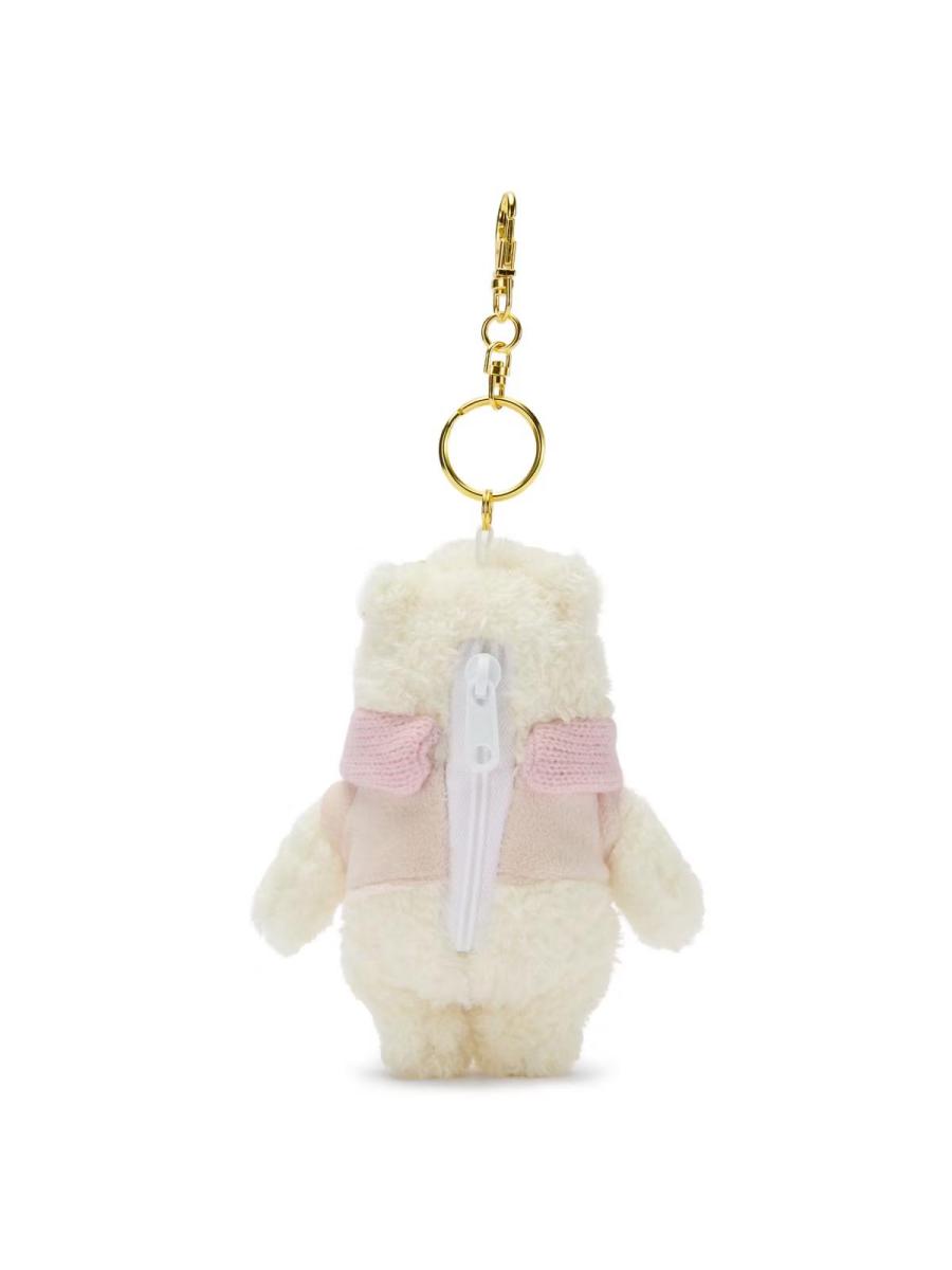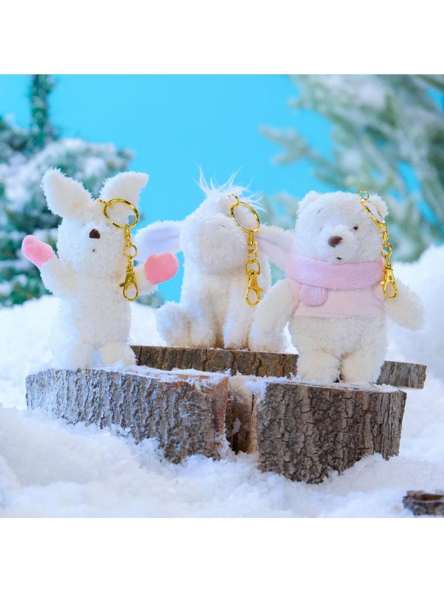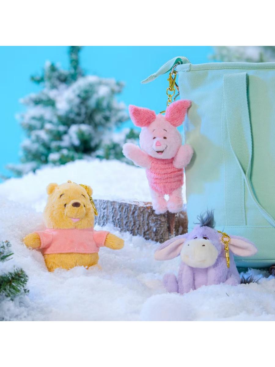 Small soft toy keyring featuring Winnie the Pooh in a snowy white covering with pink scarf