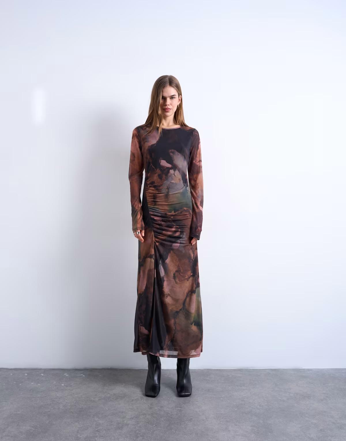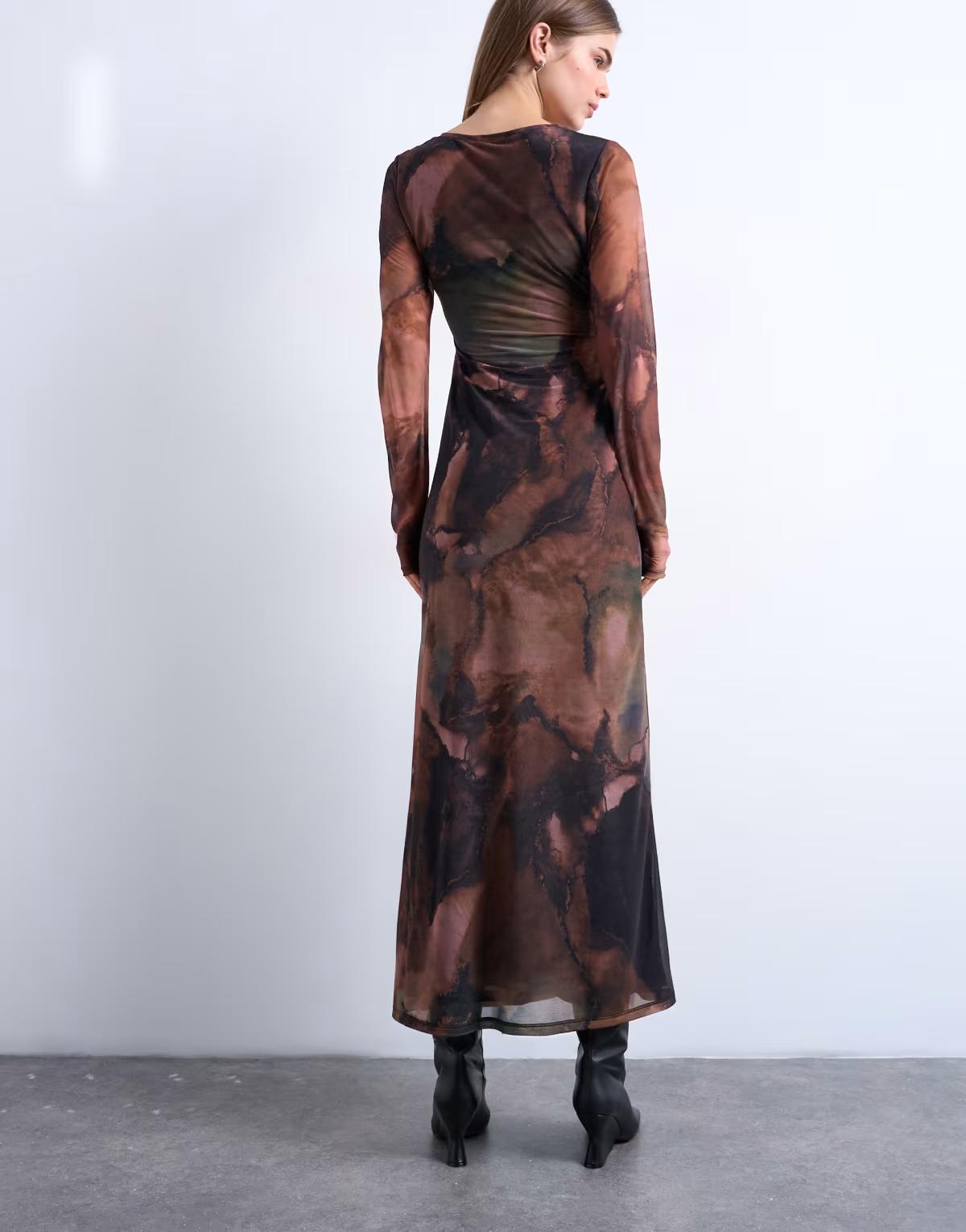 Topshop mesh maxi blurred abstract print long sleeve dress in multi