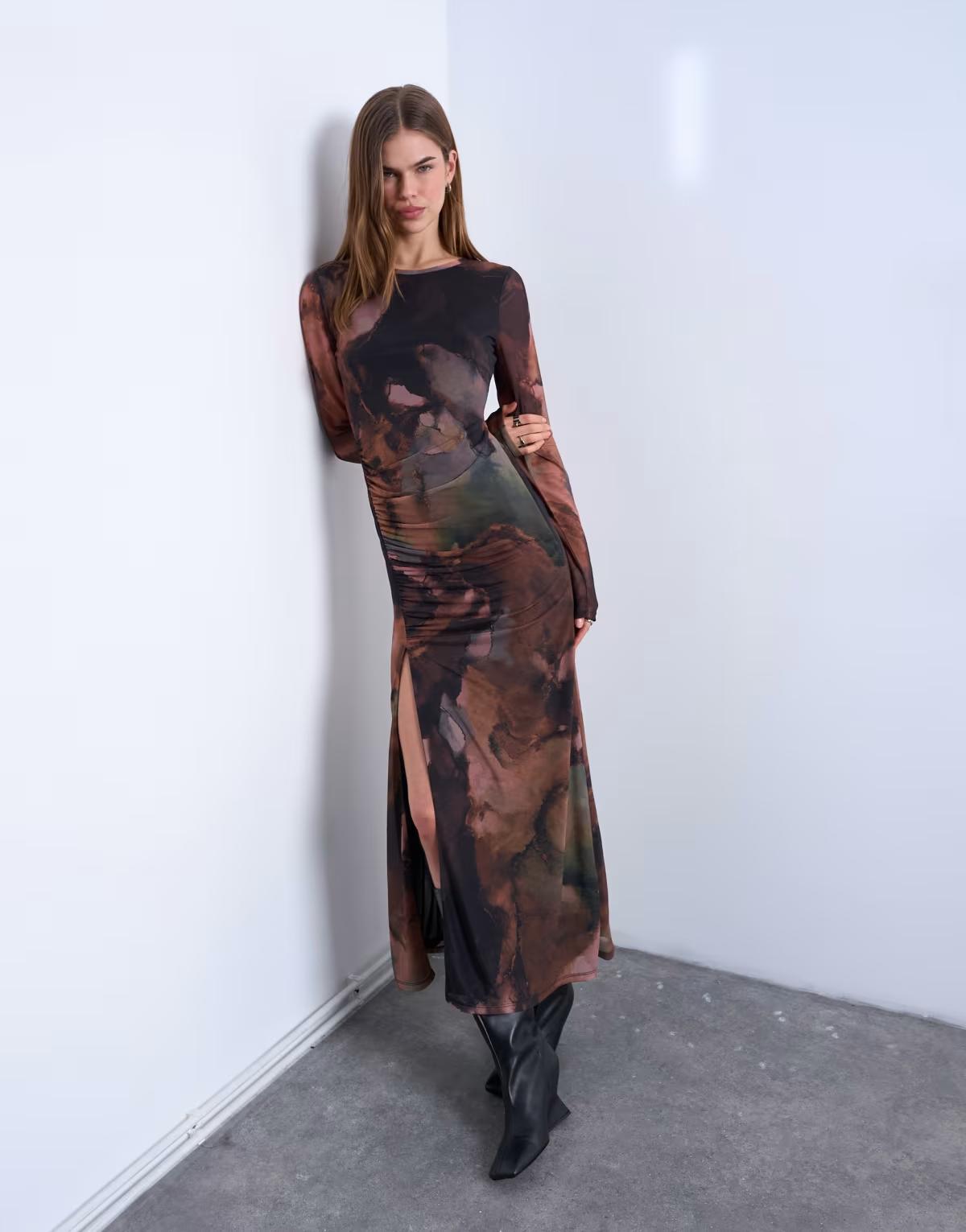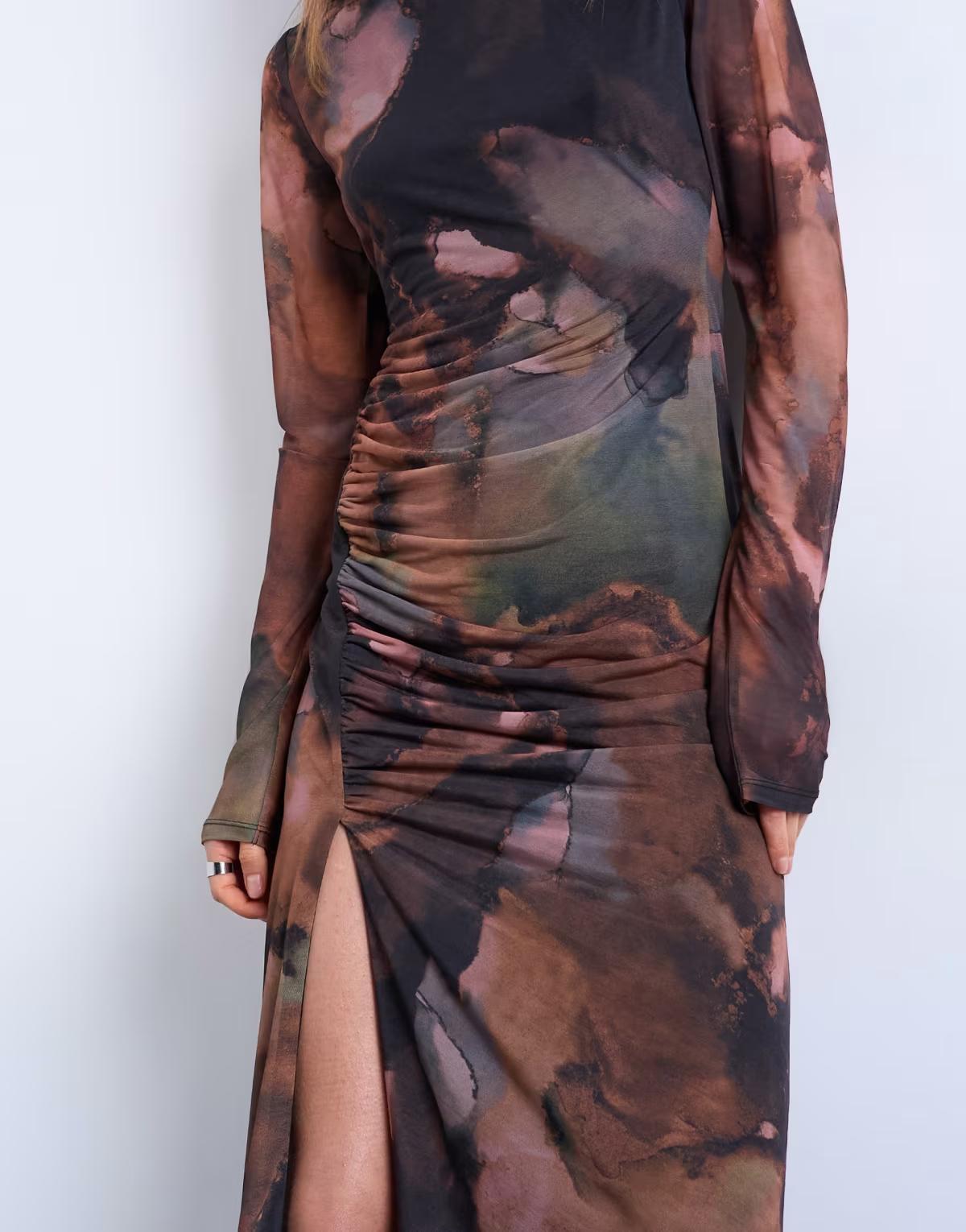 This dress is crafted from soft, stretchy mesh with an abstract print. Featuring a round neck and long sleeves, this piece is complete with a thigh-high split and ruching to the front. It is cut to a slim fit for a tailored feel.