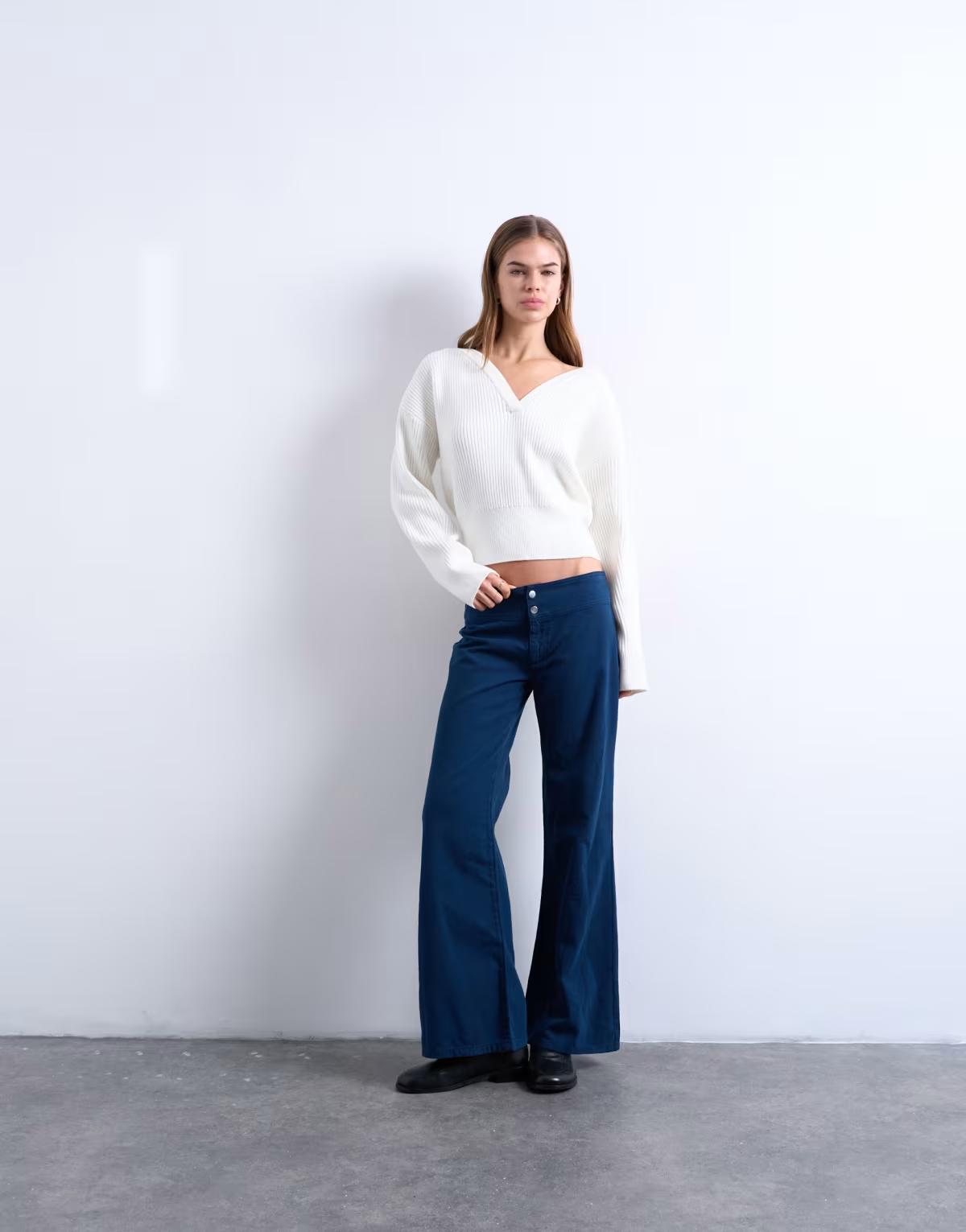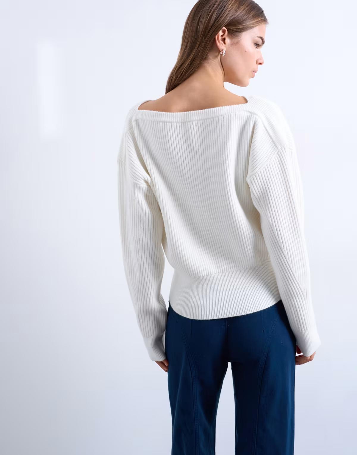 This jumper is crafted from a ribbed knit in an ivory shade. Featuring a V-neck, drop shoulders and a fitted waist, this style is ideal for those who want to stay comfy and chic.