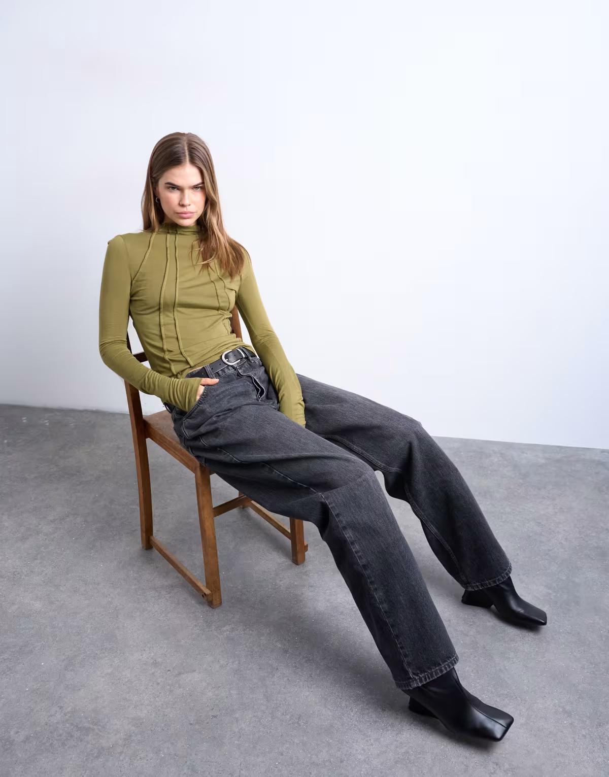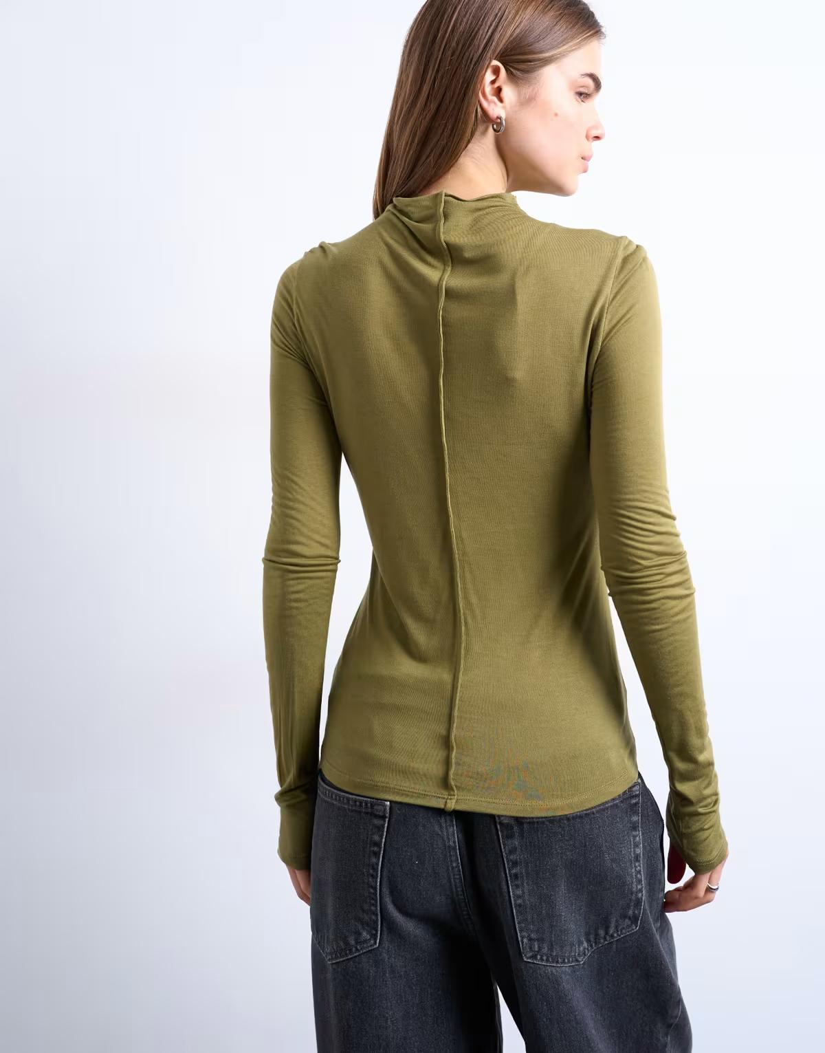 This top is crafted from jersey in a khaki shade. Featuring a high neck and seam detailing, this style is complete with long sleeves and is cut to a slim fit.