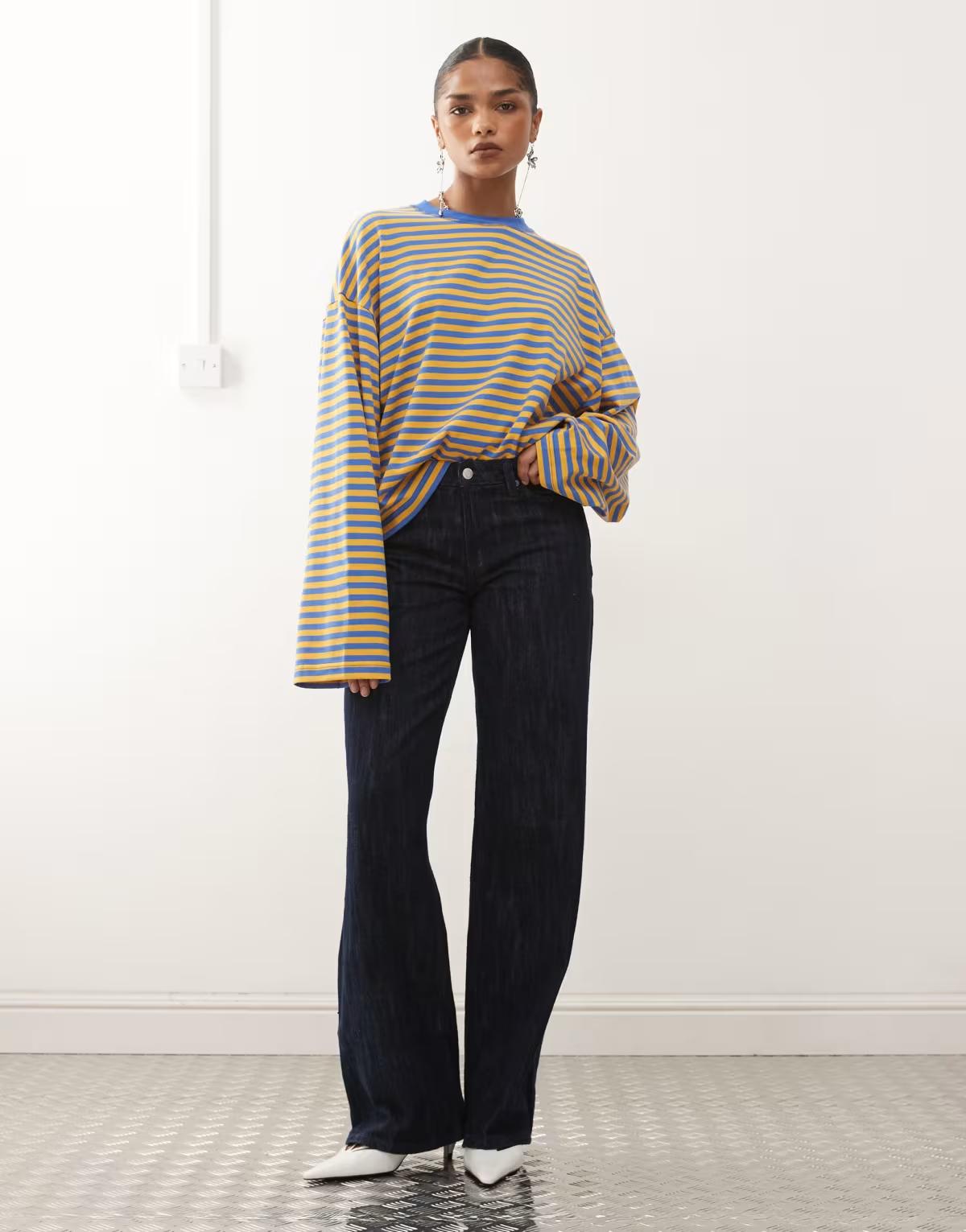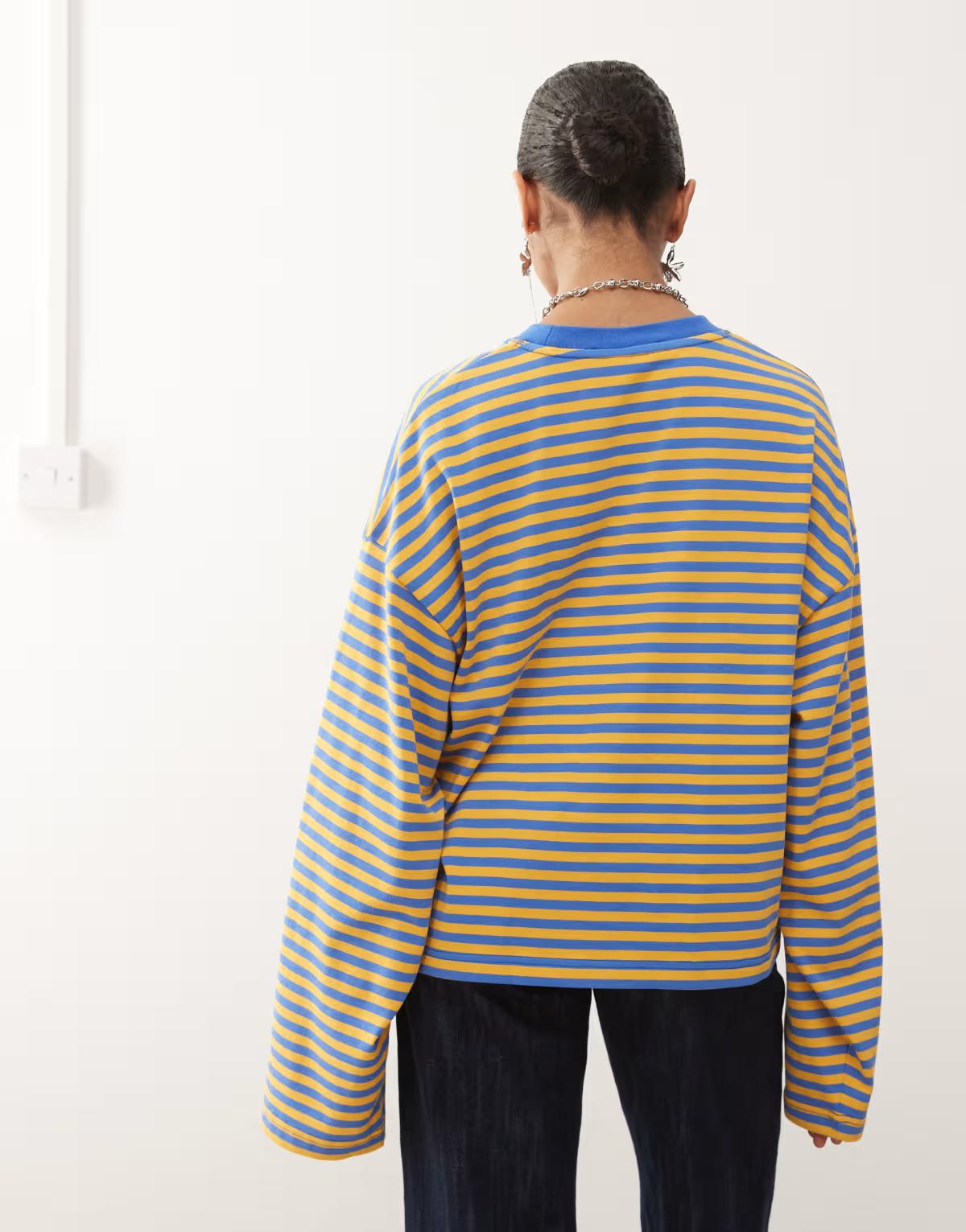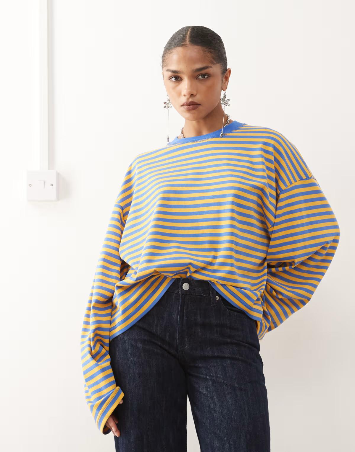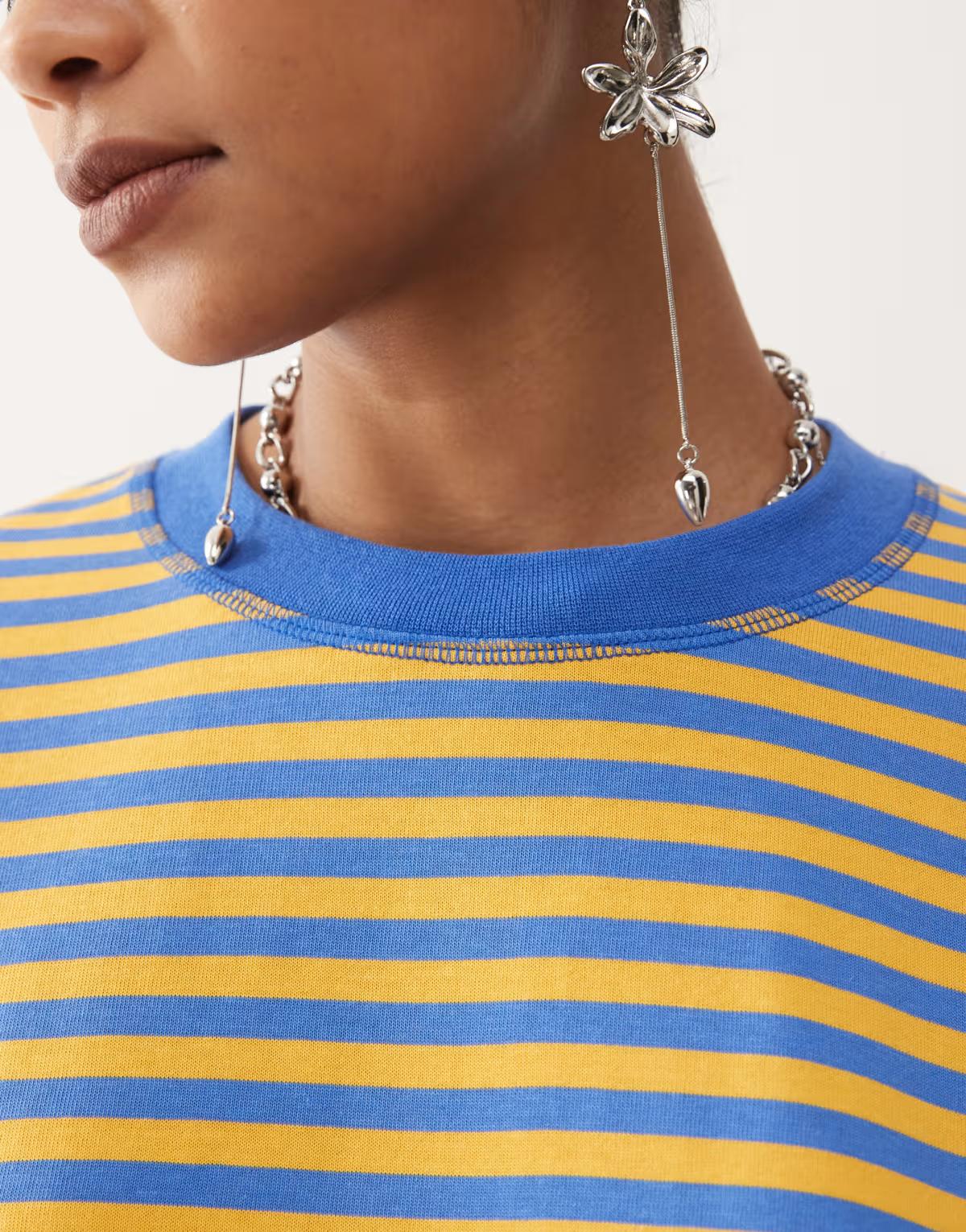 Lioness Bloom cotton blend long sleeve crew neck boxy t-shirt in blue and yellow stripe