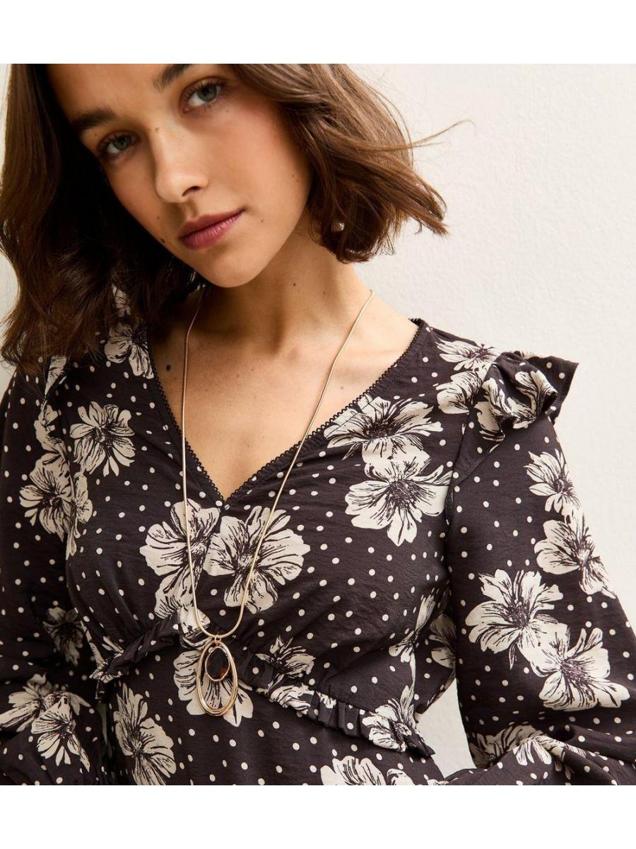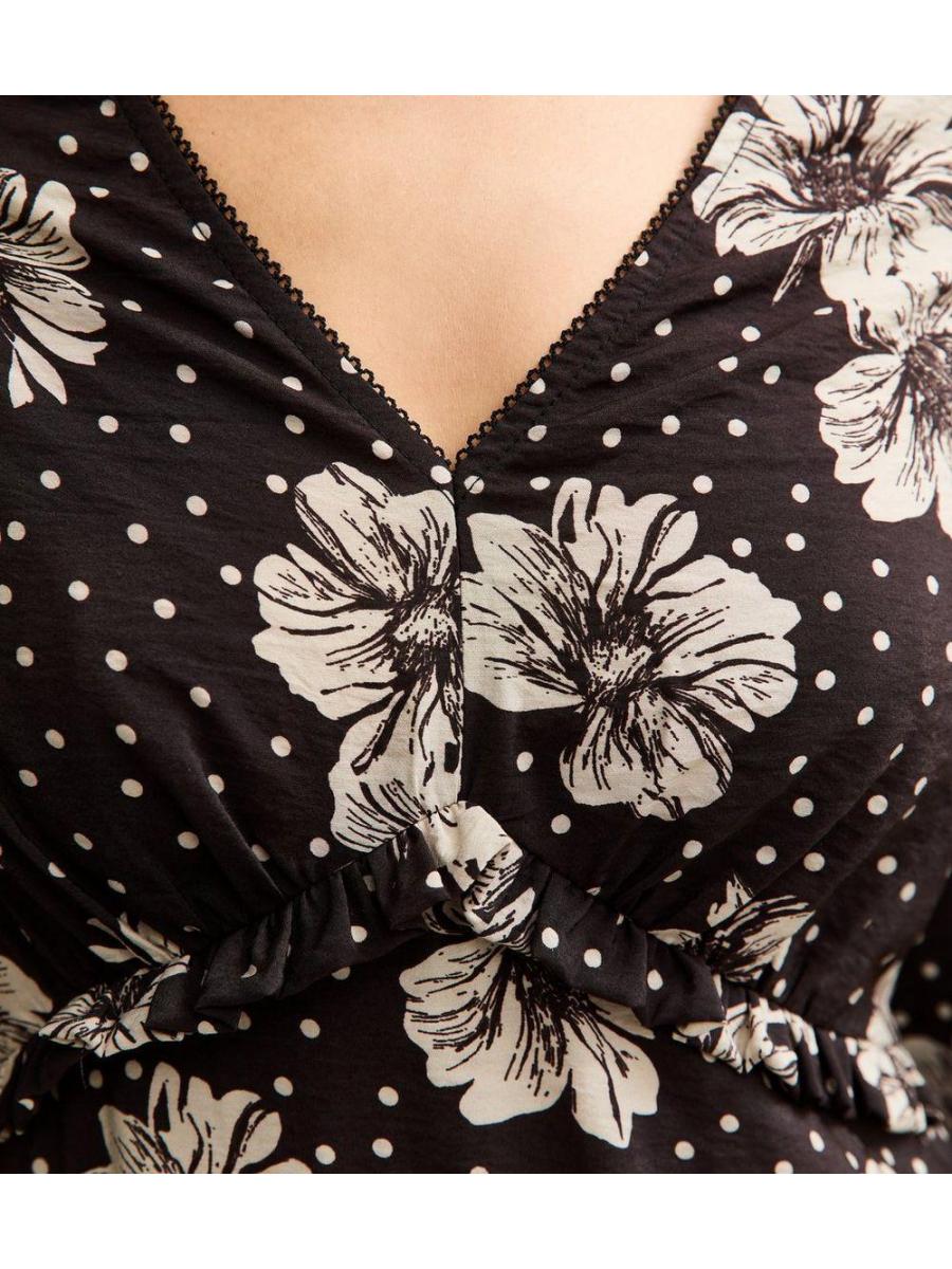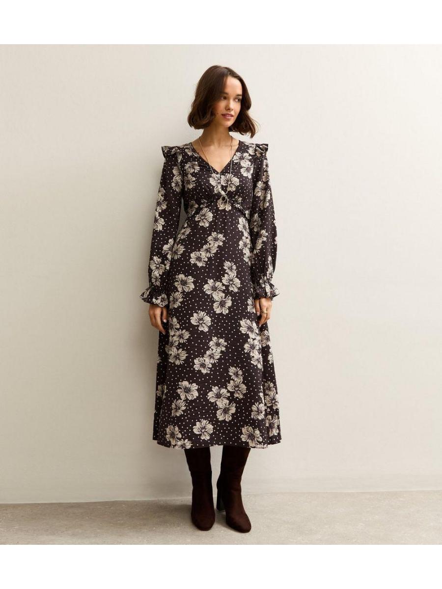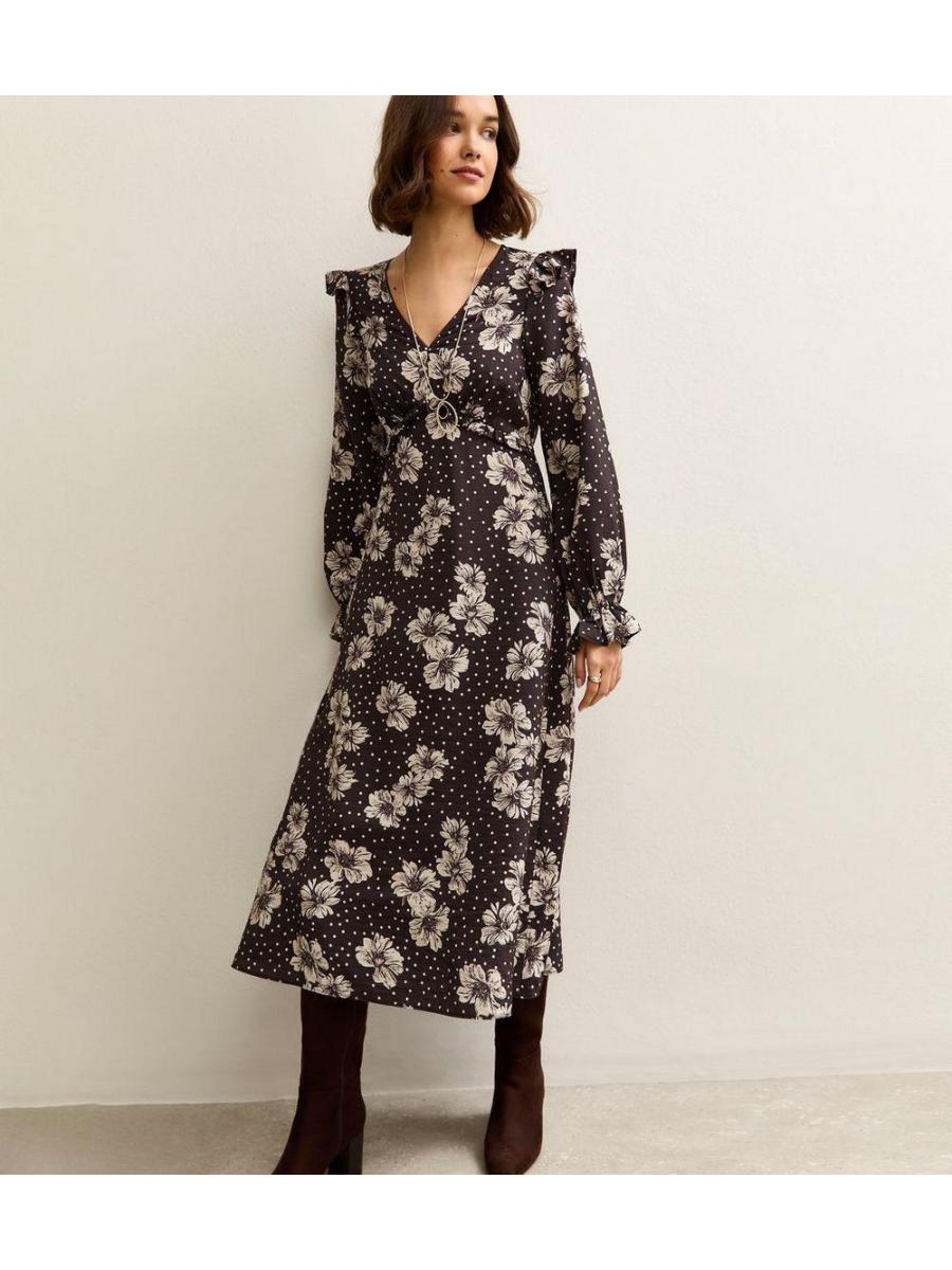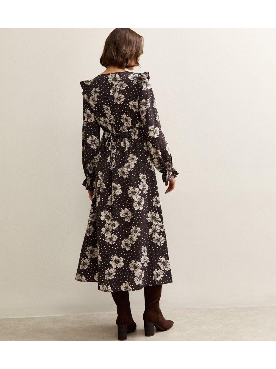 Black Floral Frill Shoulder Midi Dress