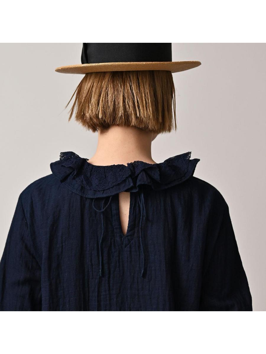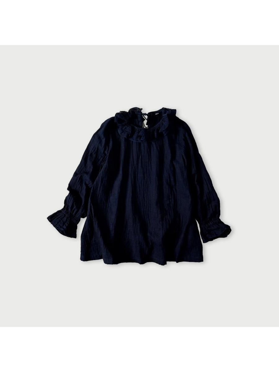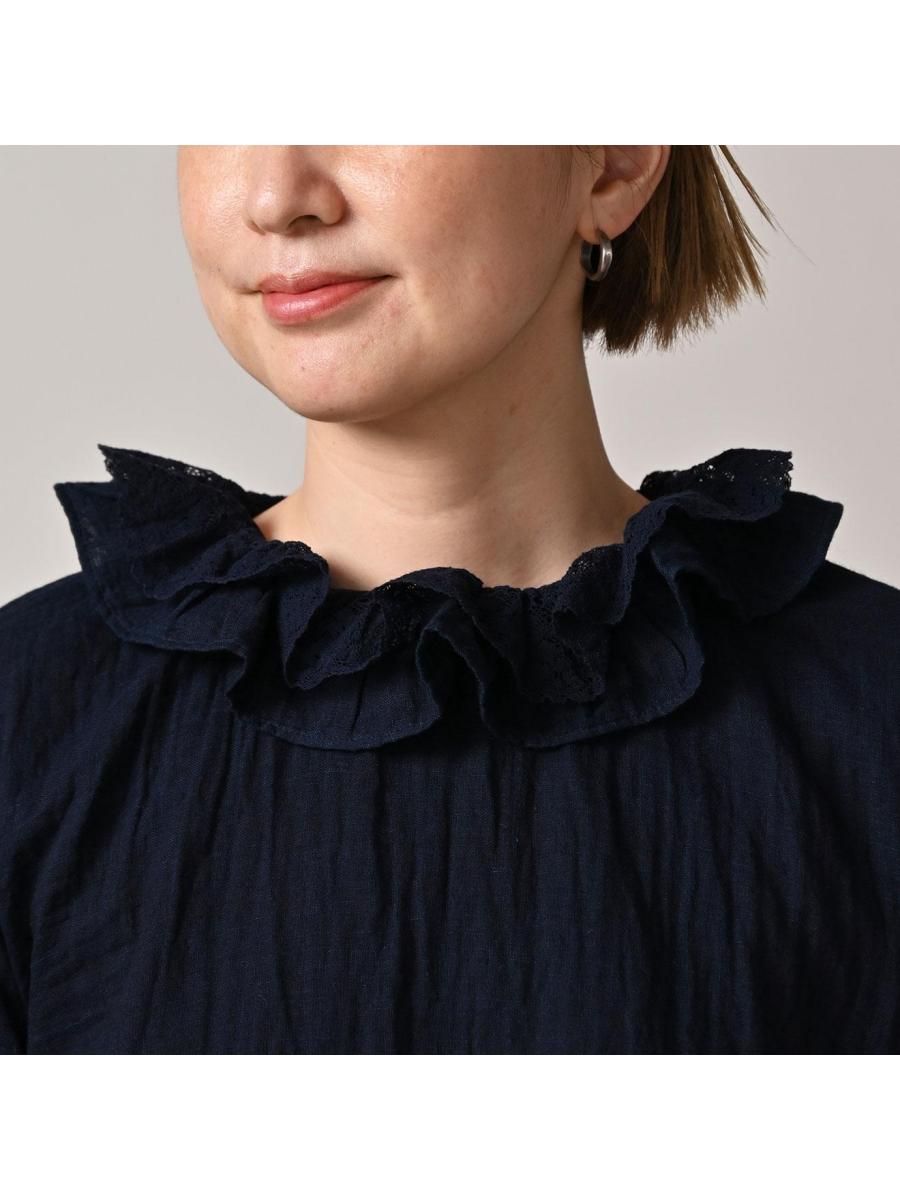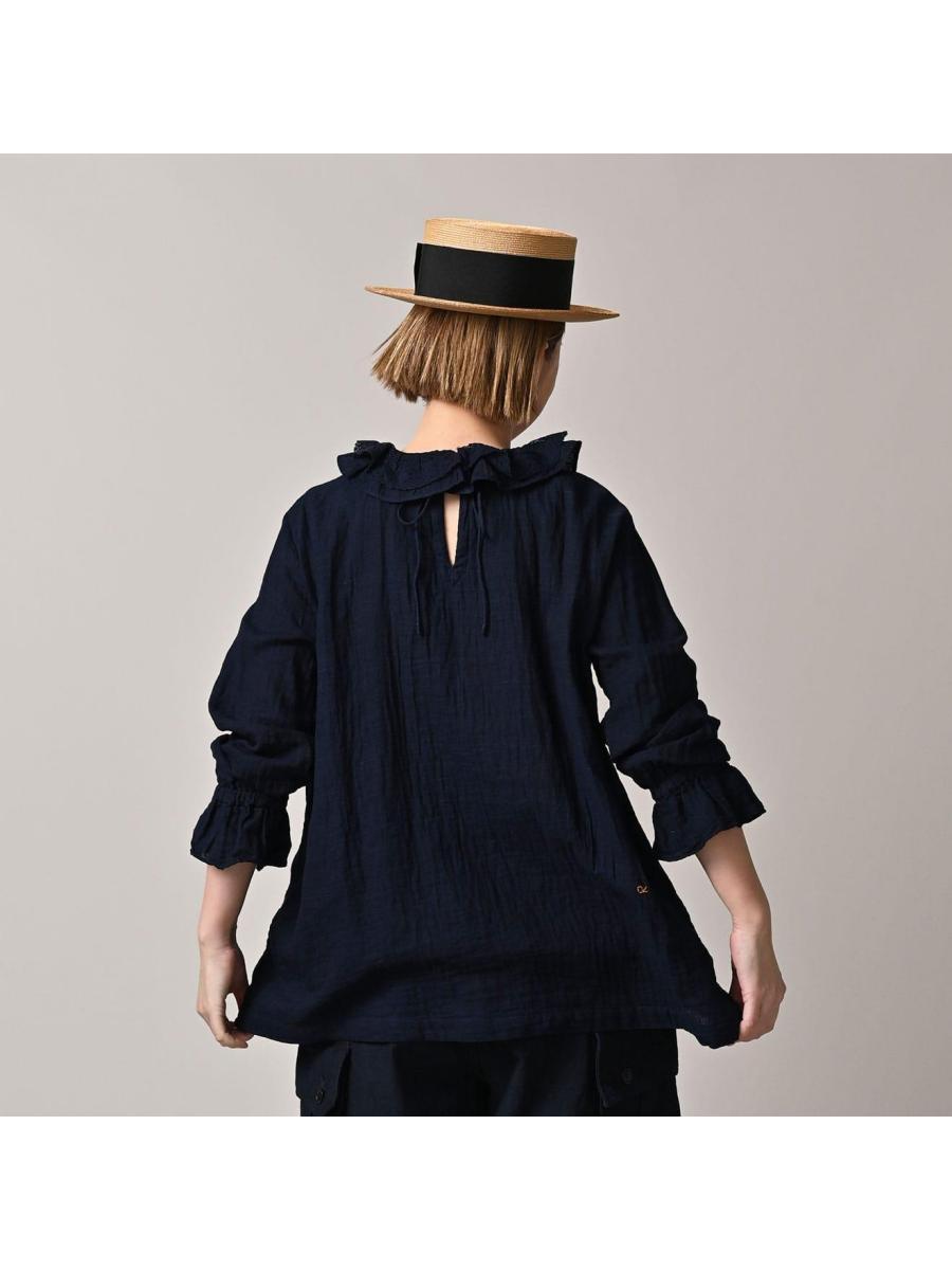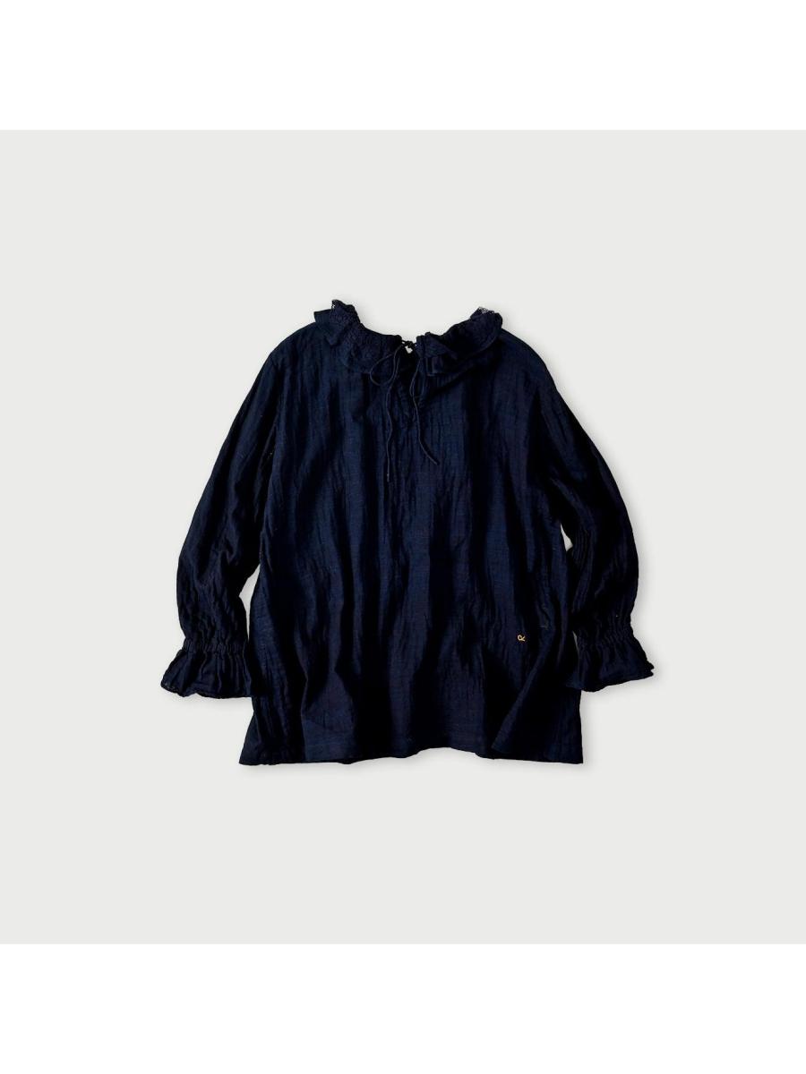 ガーゼ二重織のフリルカラーブラウス(インディゴ)
