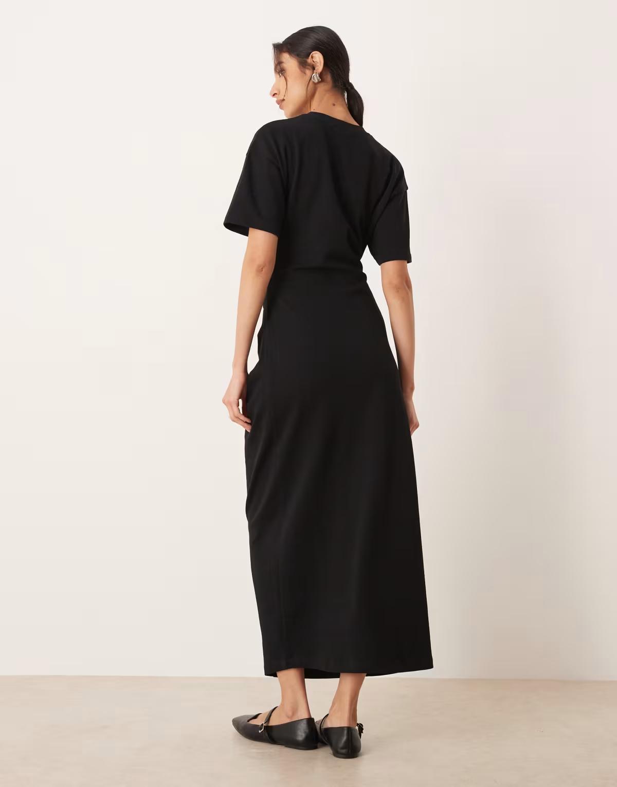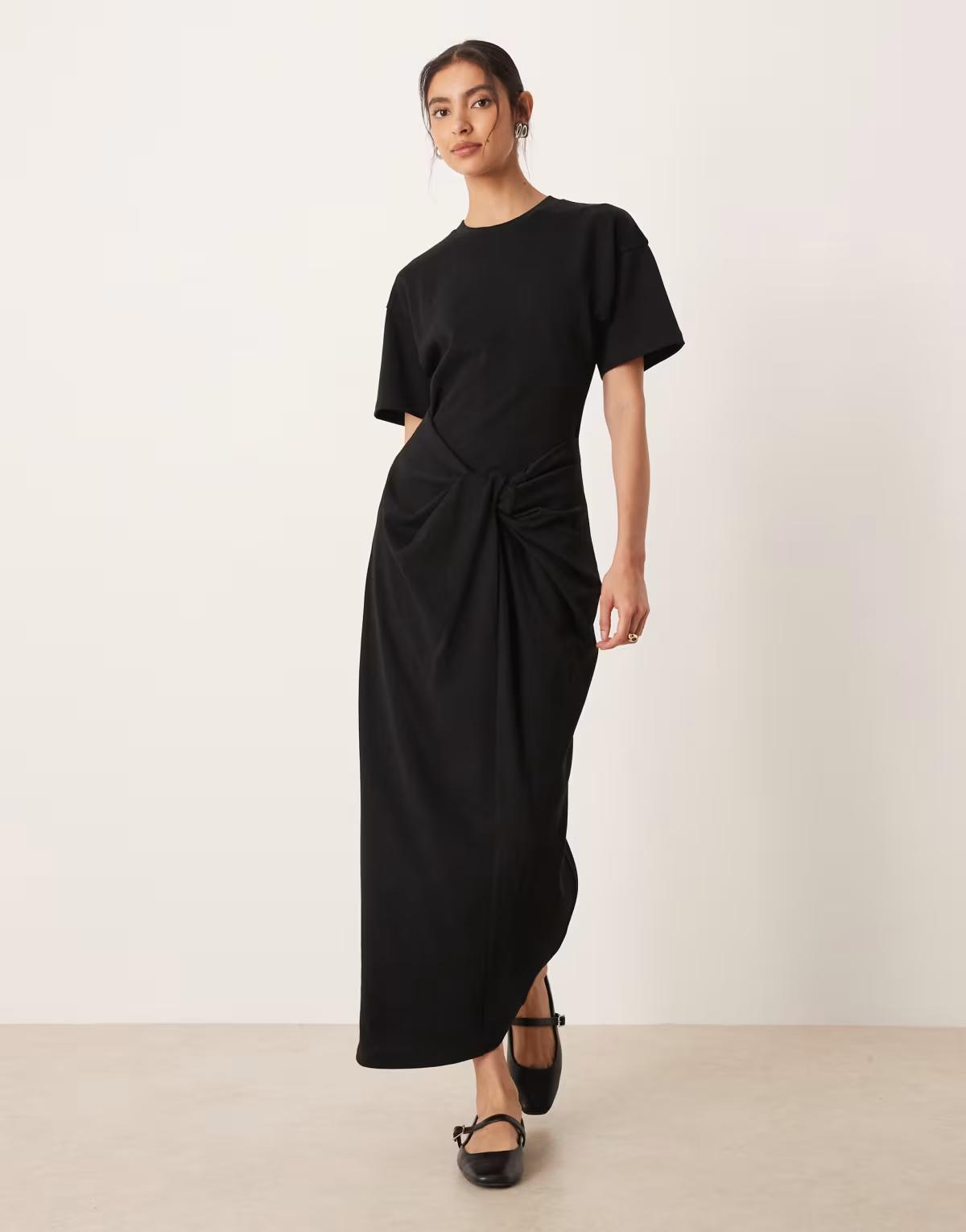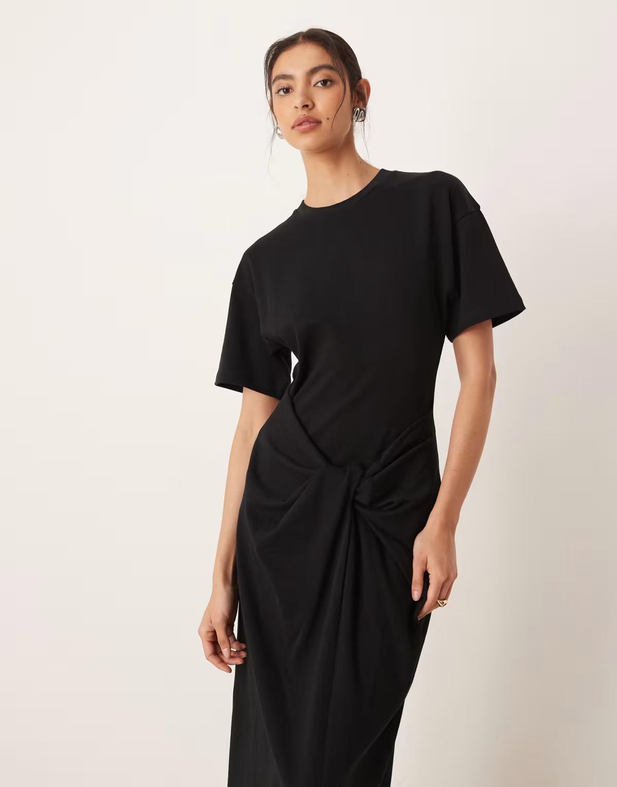 This product, ASOS DESIGN Circular Design Collection single jersey twist t-shirt midi dress in black, meets ASOS’ Silver Standard
