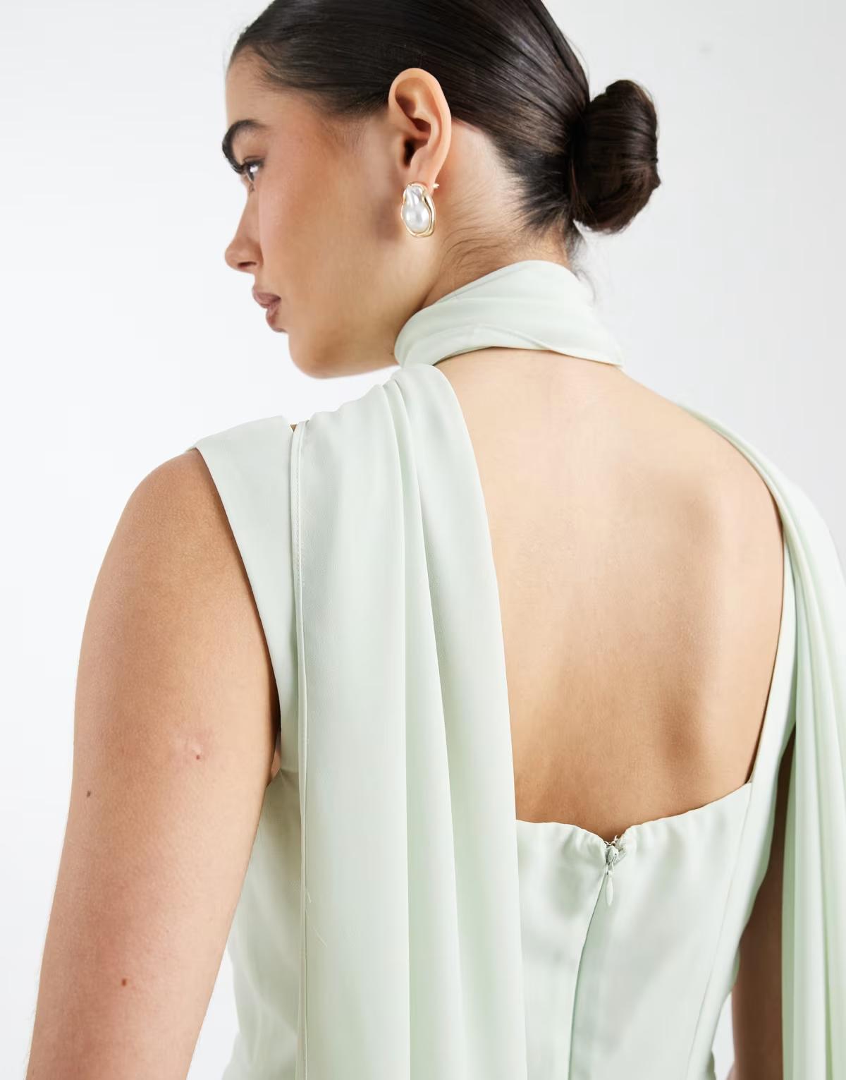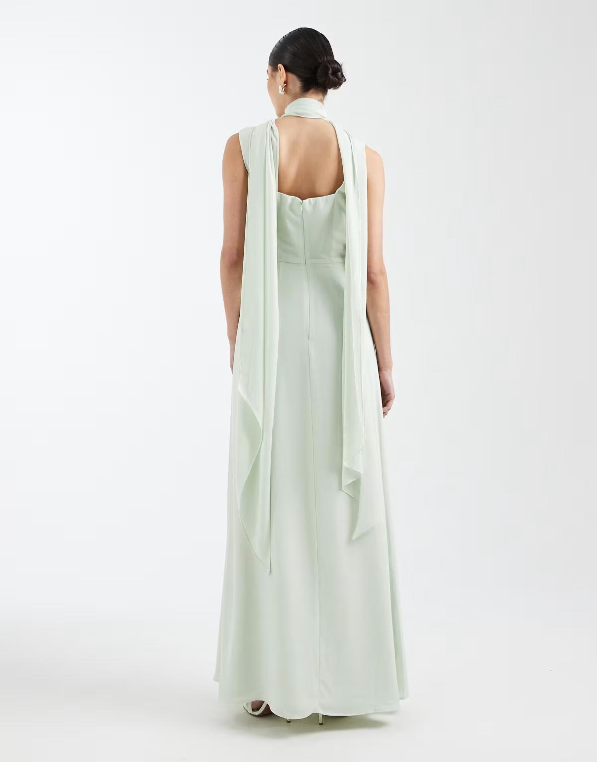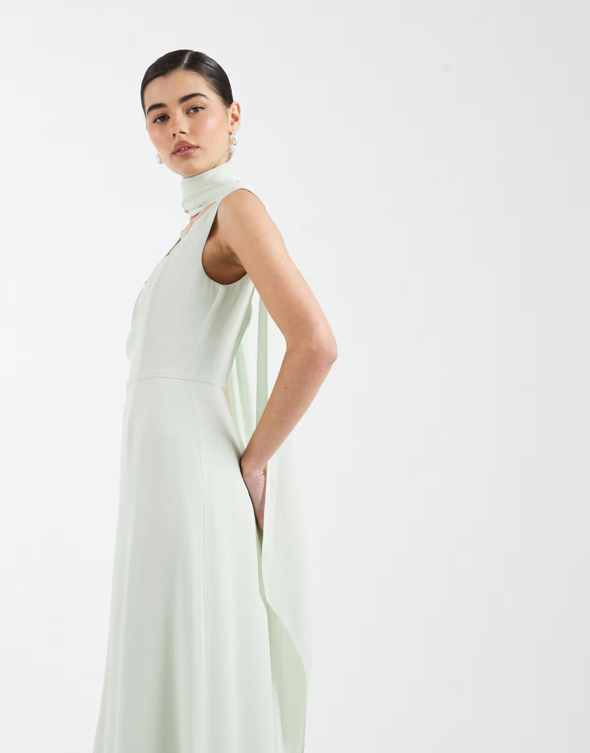 Six Stories Bridesmaid crepe square neck maxi dress with scarf neck in mint green