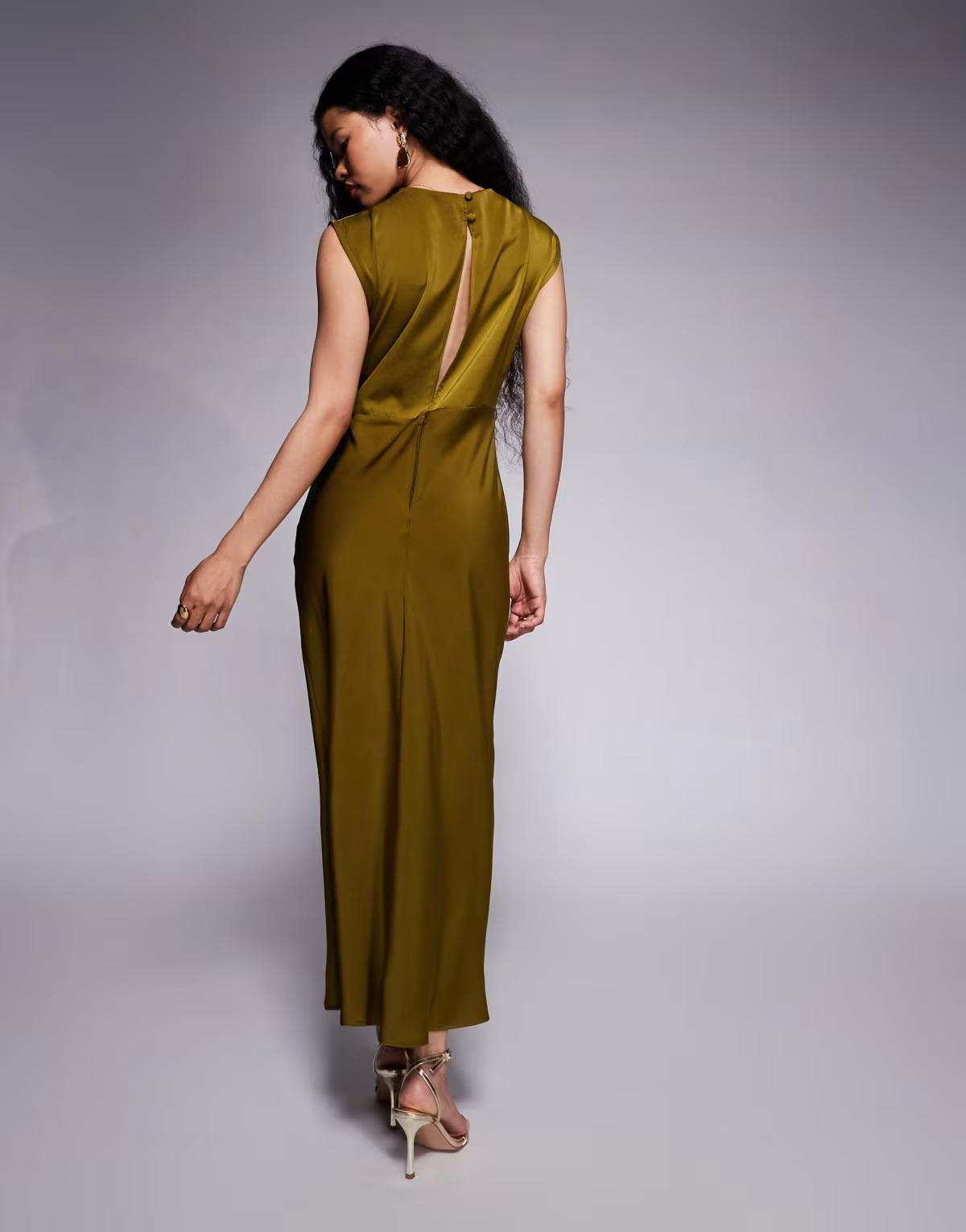 ASOS DESIGN Petite satin high neck pleated bodice midi dress in green