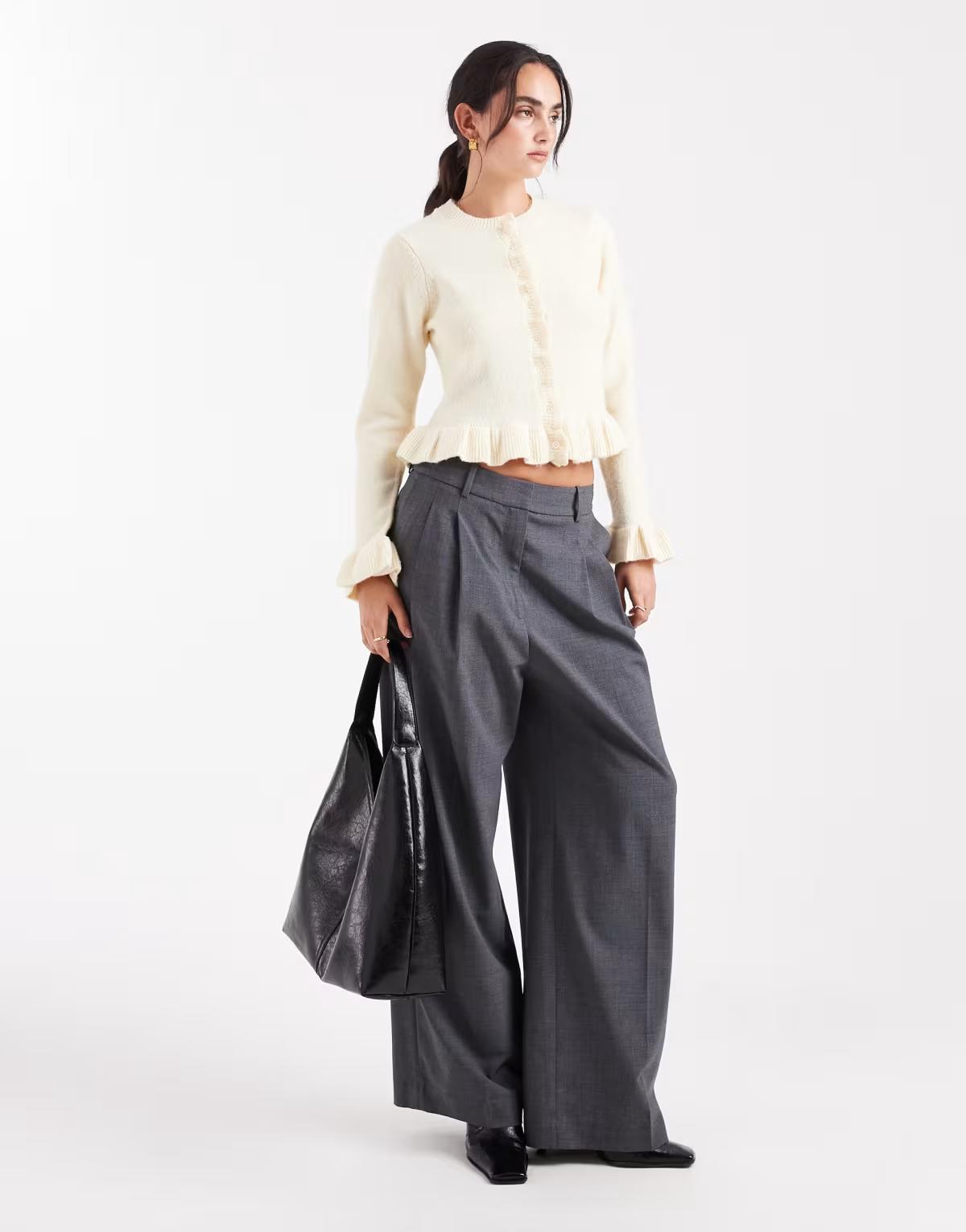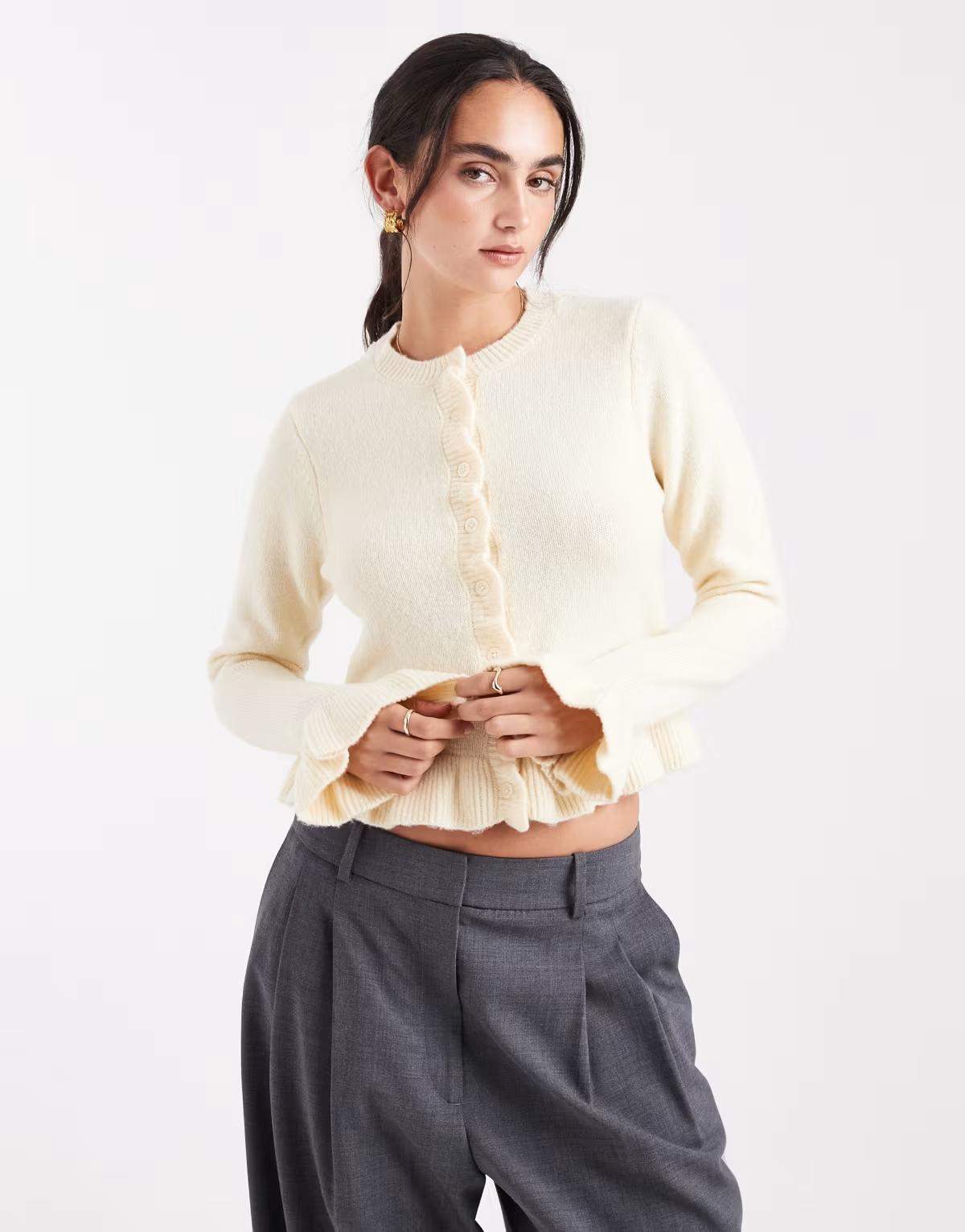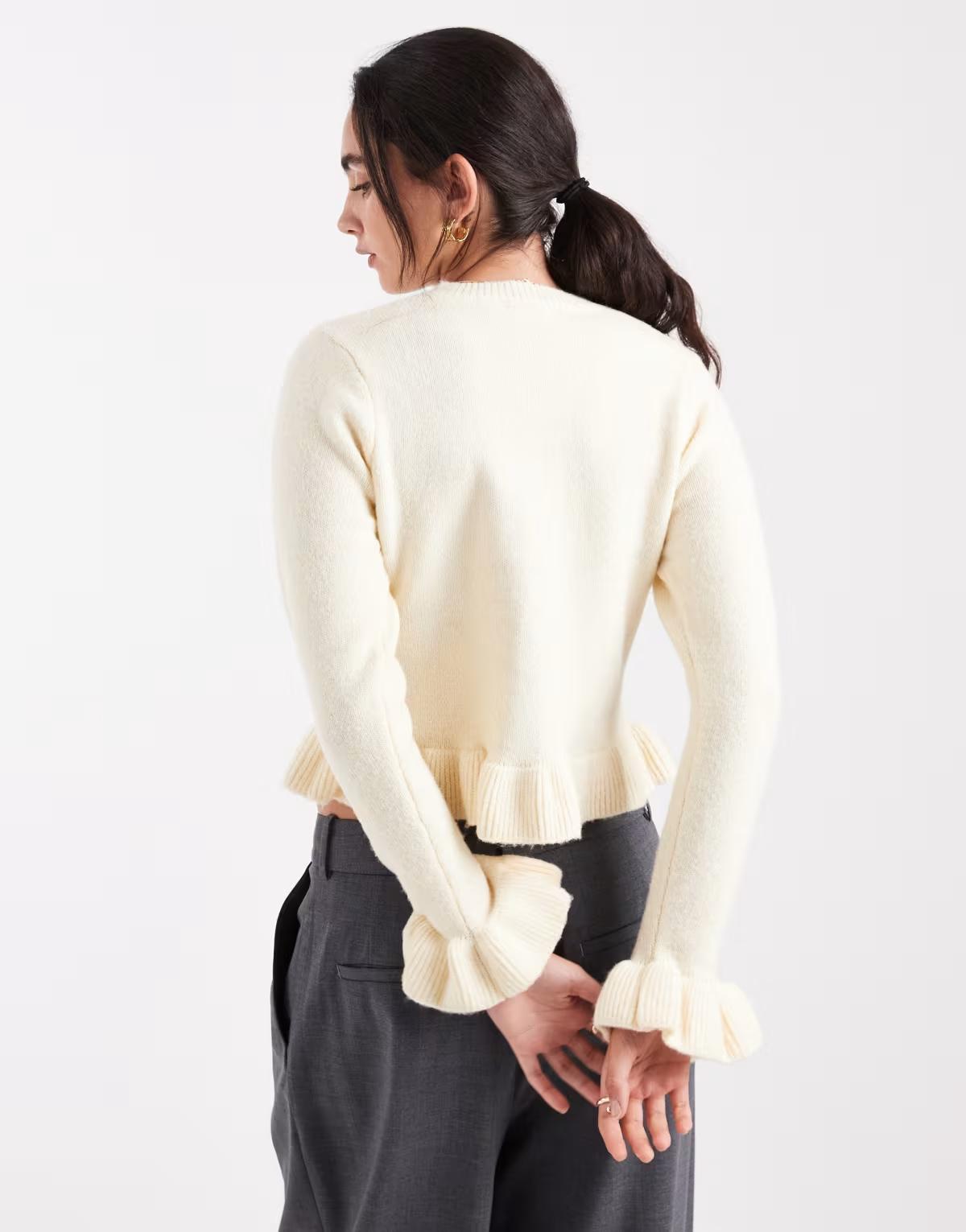 Brave Soul crew neck knitted cardigan with frill cuffs and hem in butter yellow