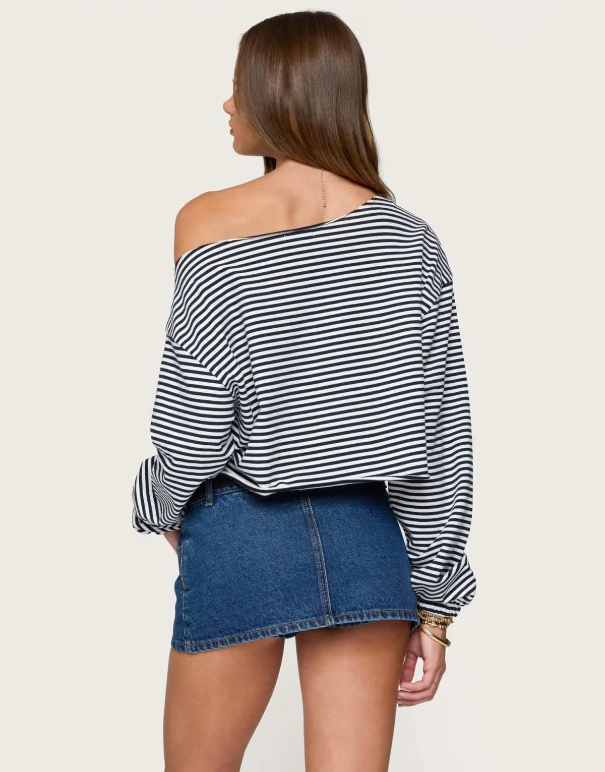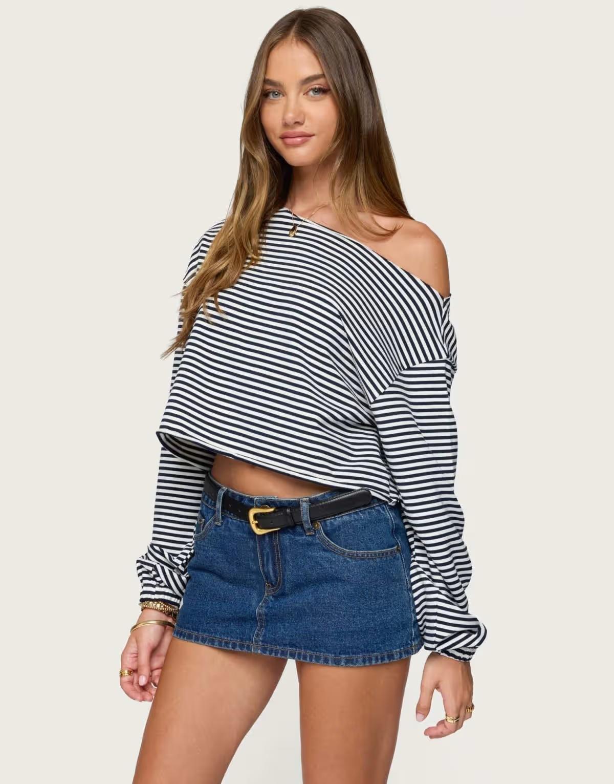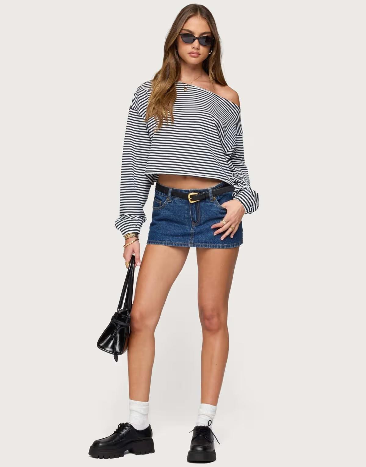 Edikted Aveline off shoulder light sweatshirt in navy and white