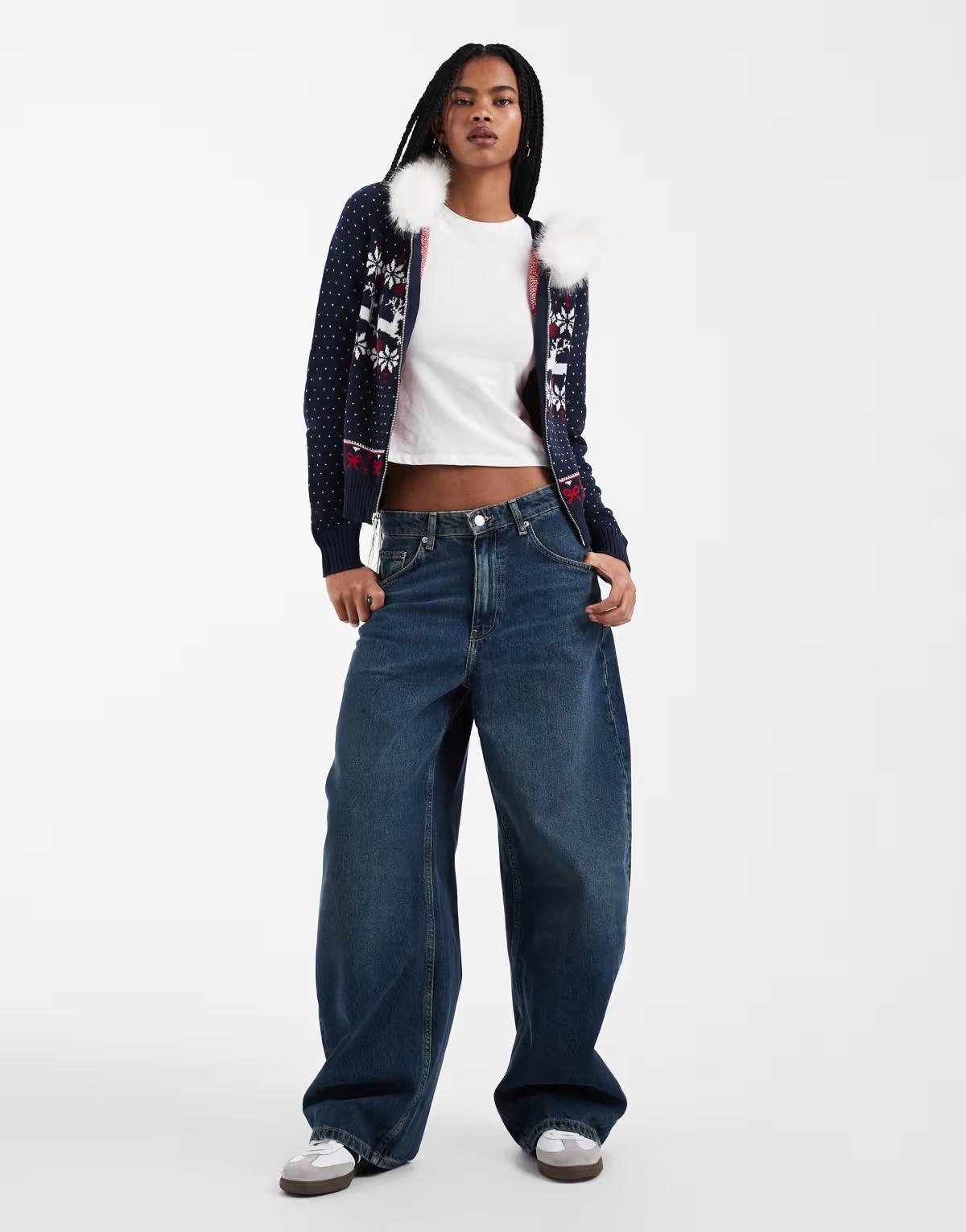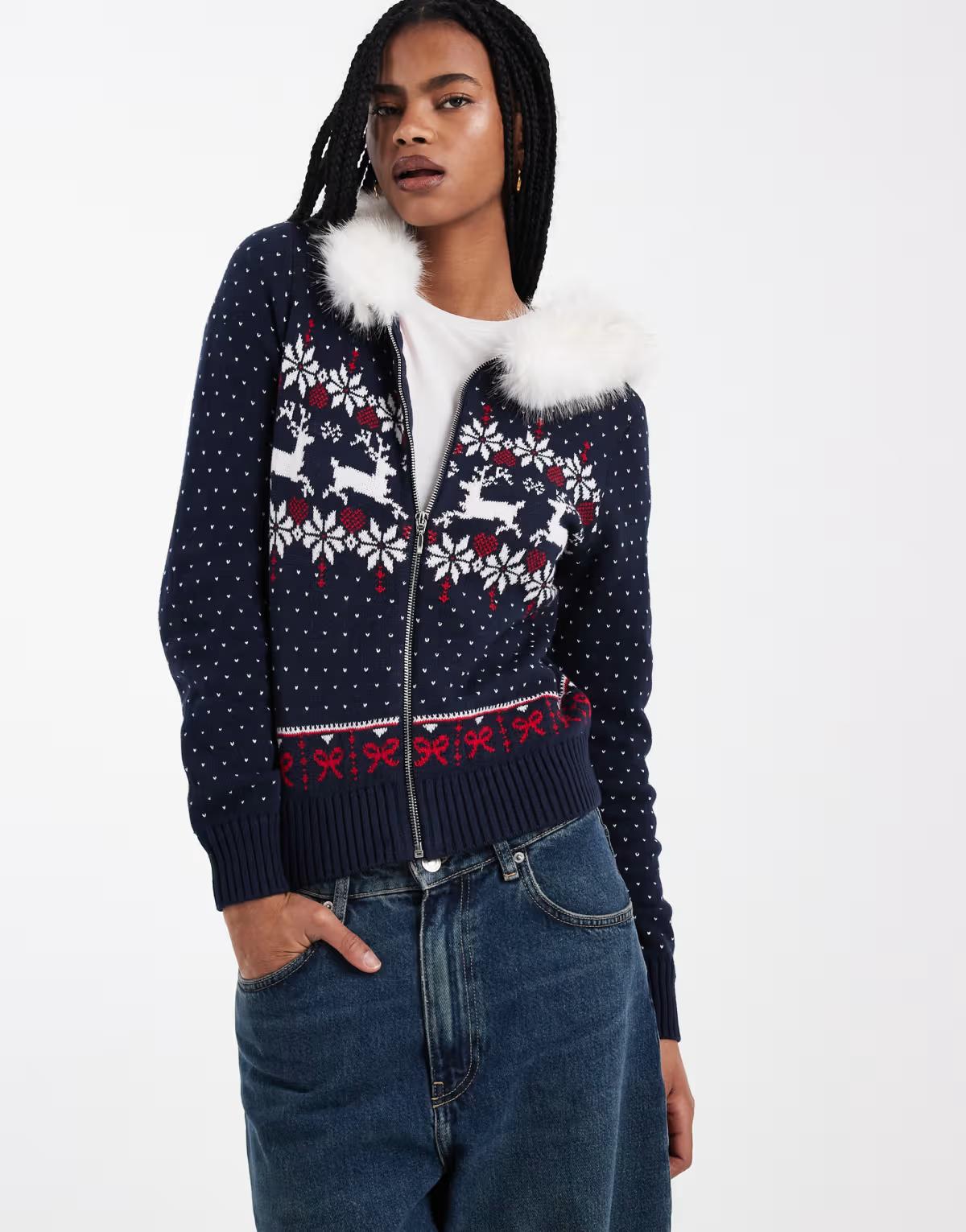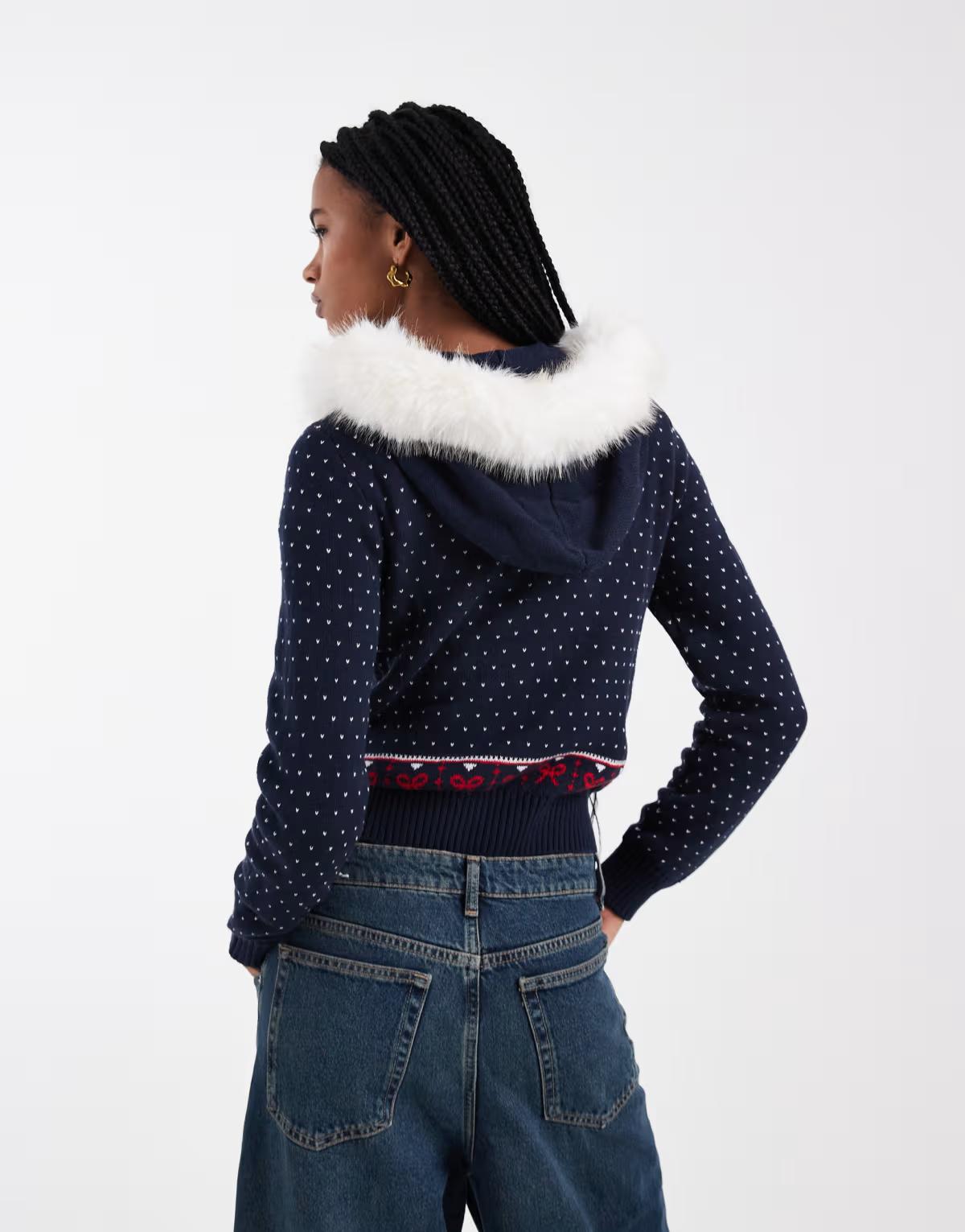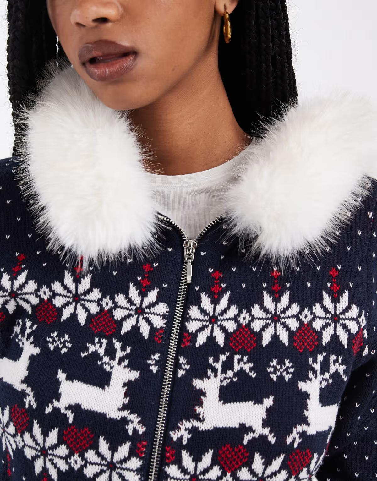 Hollister faux fur hood zip through knit jumper in navy fairisle