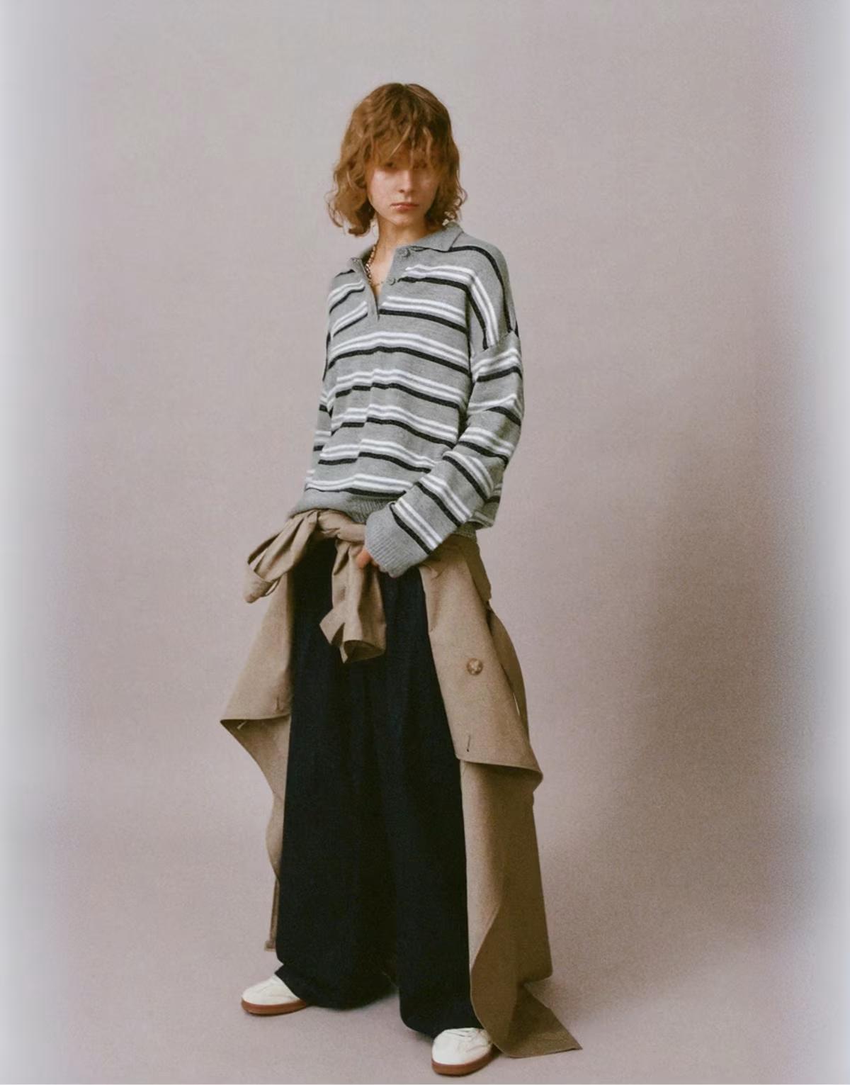 Pull&Bear Long sleeve striped polo shirt in grey marl
