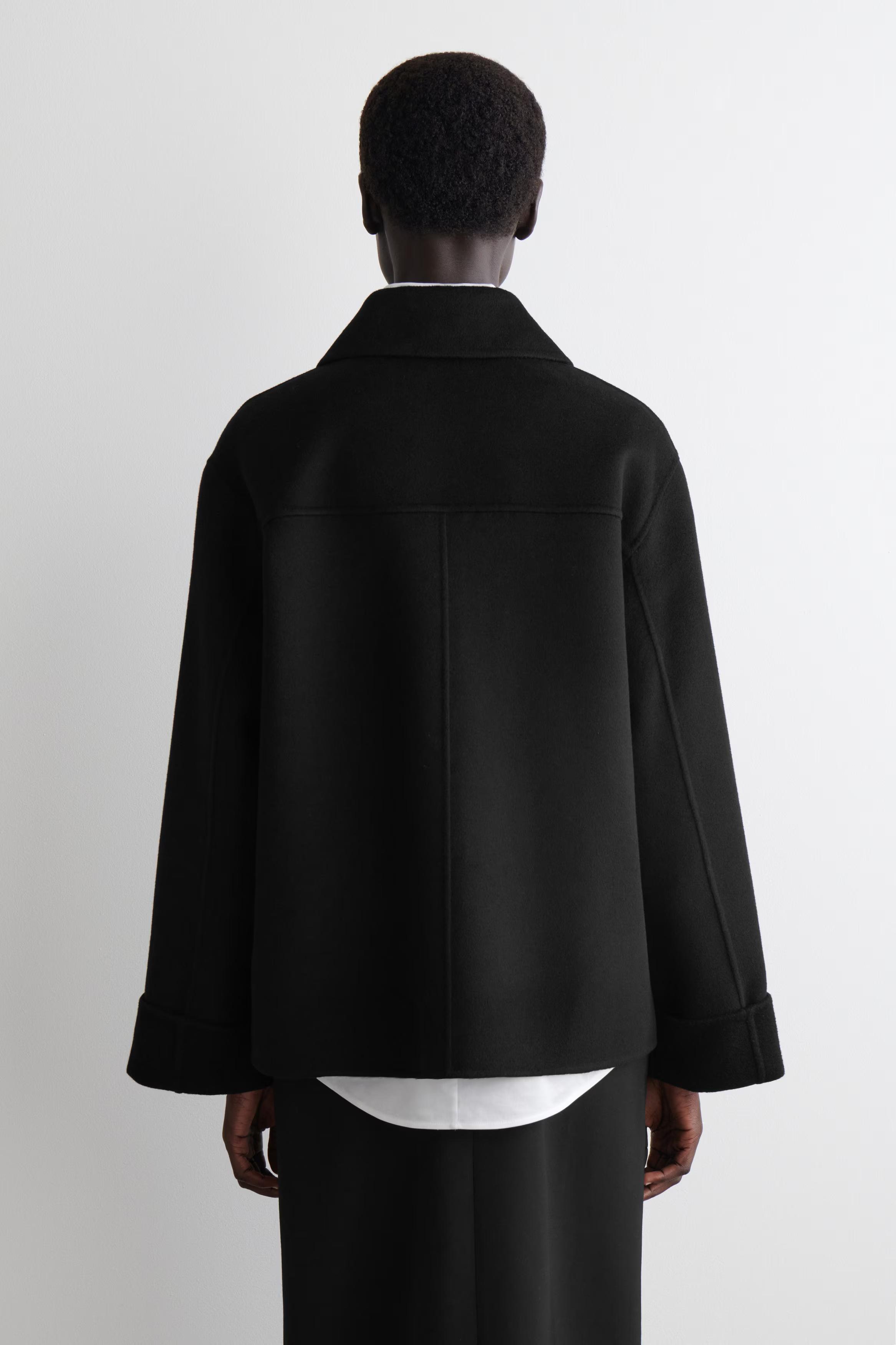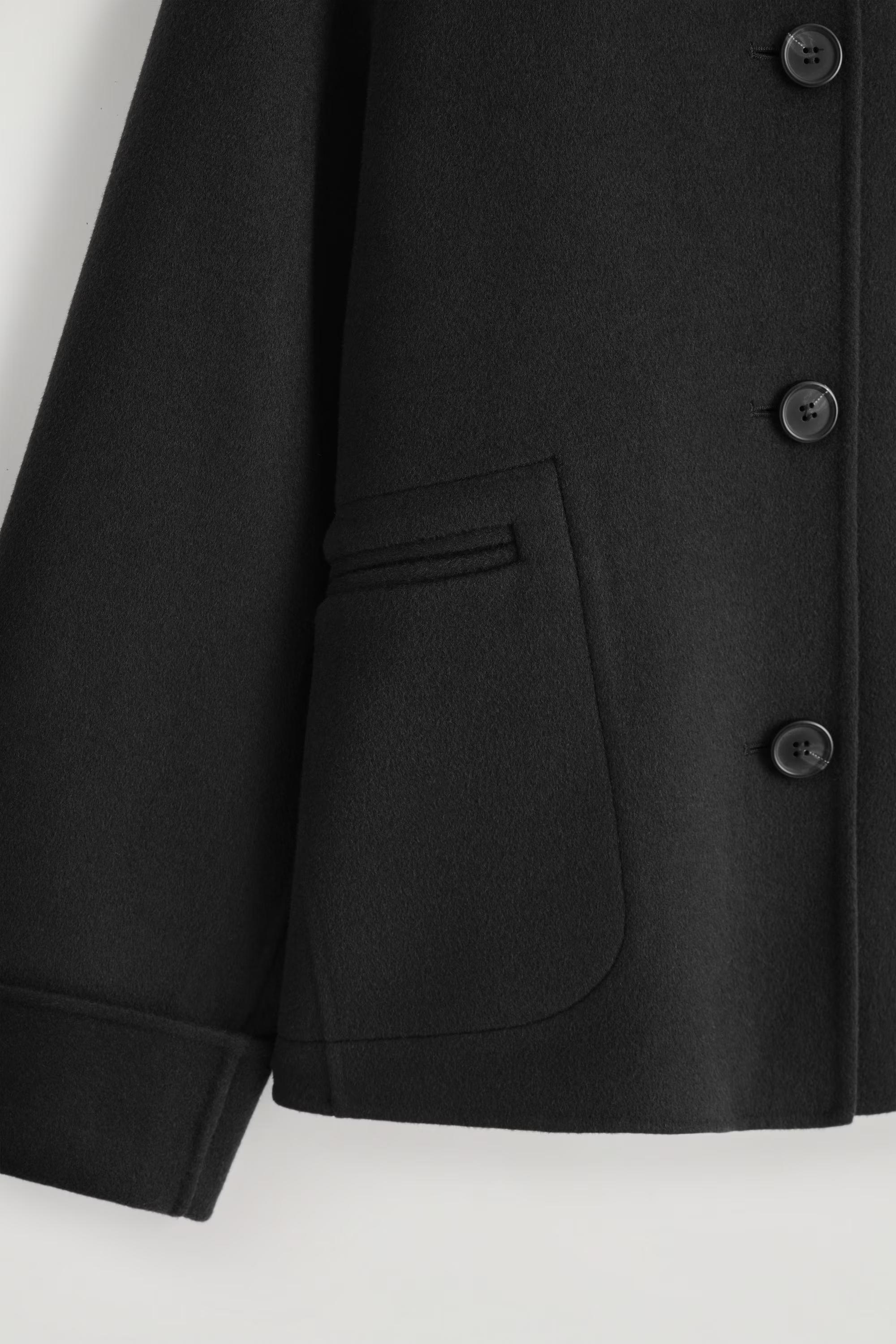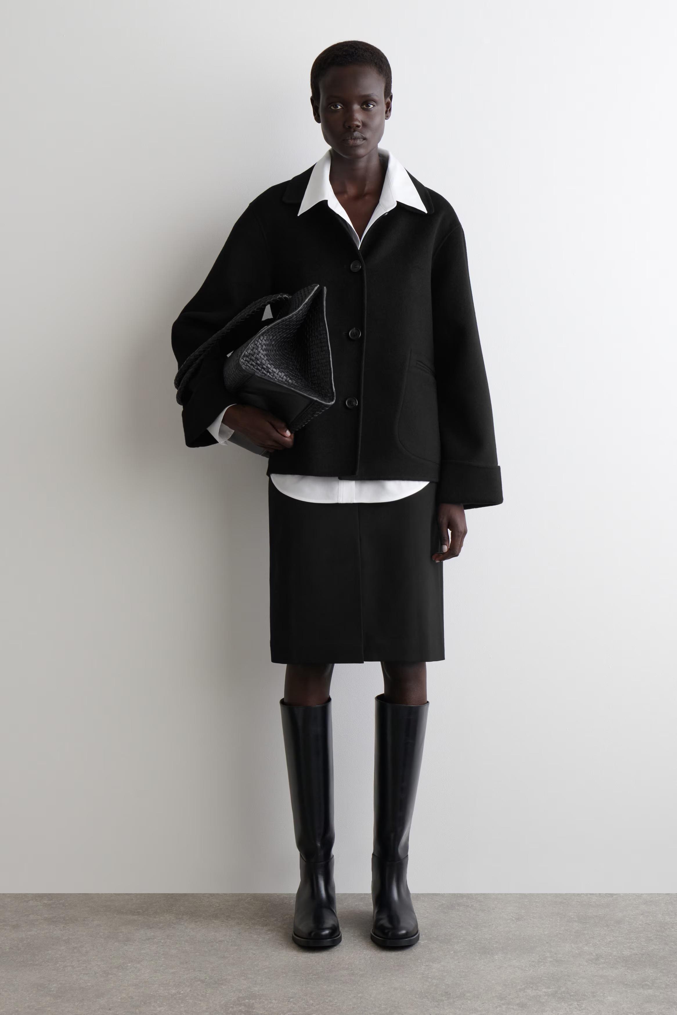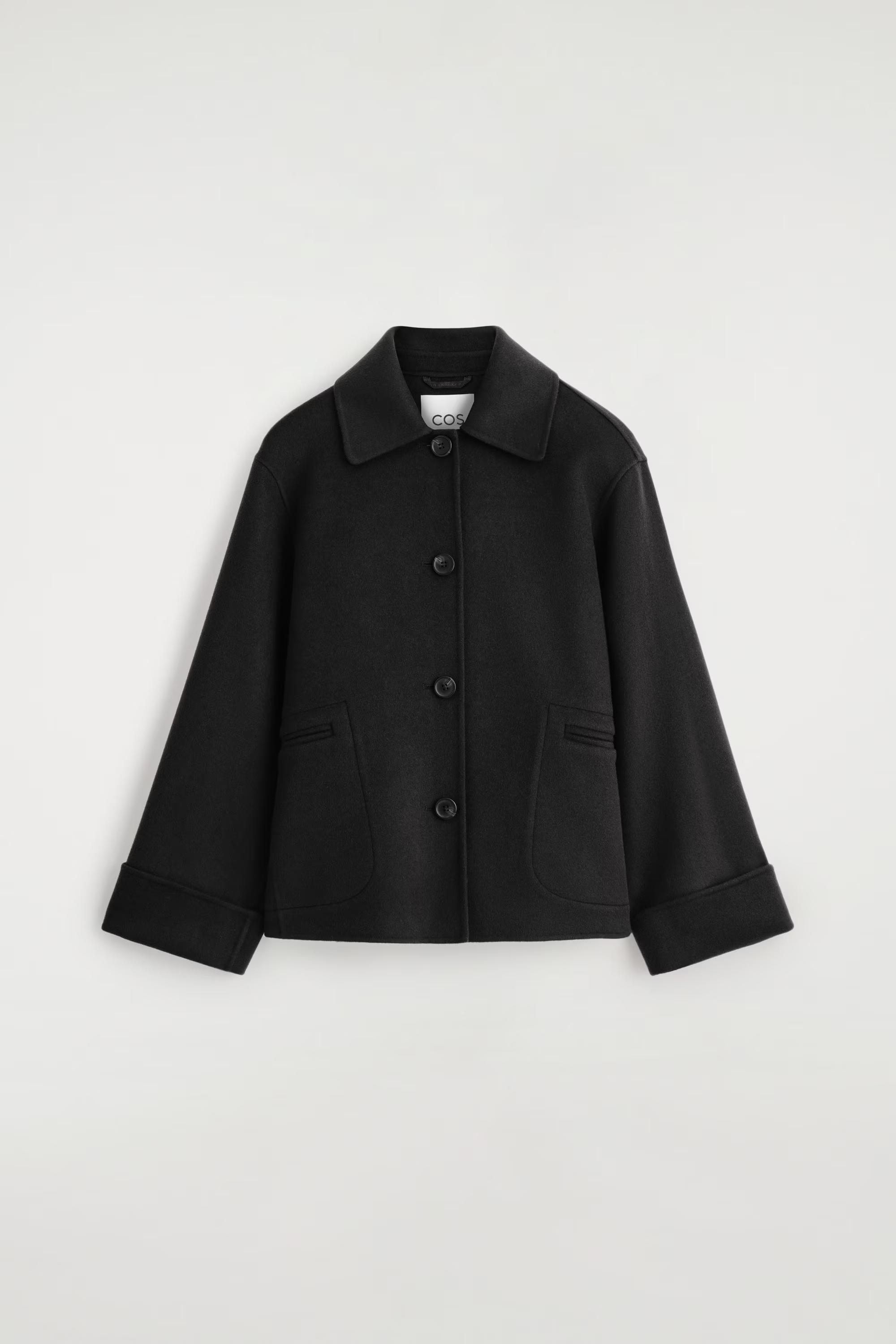 The classic wool jacket is a pillar of the COS wardrobe. Rendered in a rich espresso tone, this piece is crafted from RWS wool and TENCEL\u0026trade; Lyocell that's double-faced for a premium finish and features a pointed collar and front welt pockets.\u0026nbsp;Relaxed fitButton closureThis item runs large to size, we recommend taking a size downThis product contains Responsible Wool Standard TE-00047206 (RWS) wool fibre from farms certified to animal welfare and land-management requirements\u0026nbsp;Shell: 60% RWS Wool, 40% TENCEL\u0026trade; Lyocell. Excluding trims / Dry clean\u0026nbsp;Back length of size S is 64.3cm / Model wears a size S