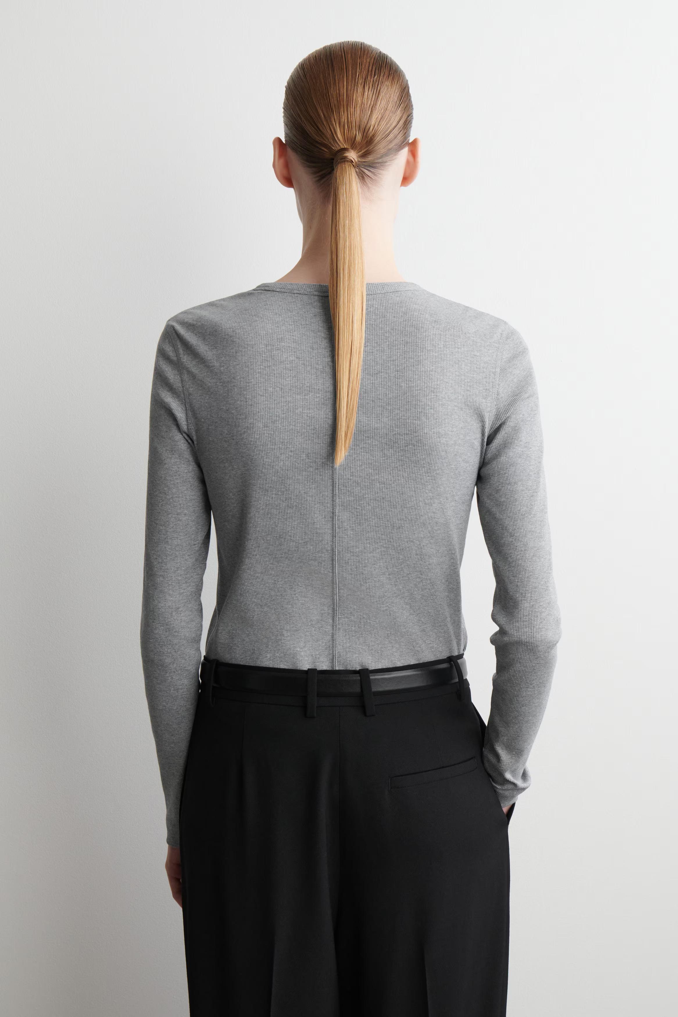 Offered in versatile black, this staple ribbed top is crafted from soft cotton-jersey and has a classic round neck and long sleeves. An exposed overstitched seam runs along the back for a neat finish.\u0026nbsp;Regular fit\u0026nbsp;Shell: 97% Cotton, 3% Elastane. Excluding trims / Machine wash\u0026nbsp;Back length of size S is 64.8cm / Model wears a size S