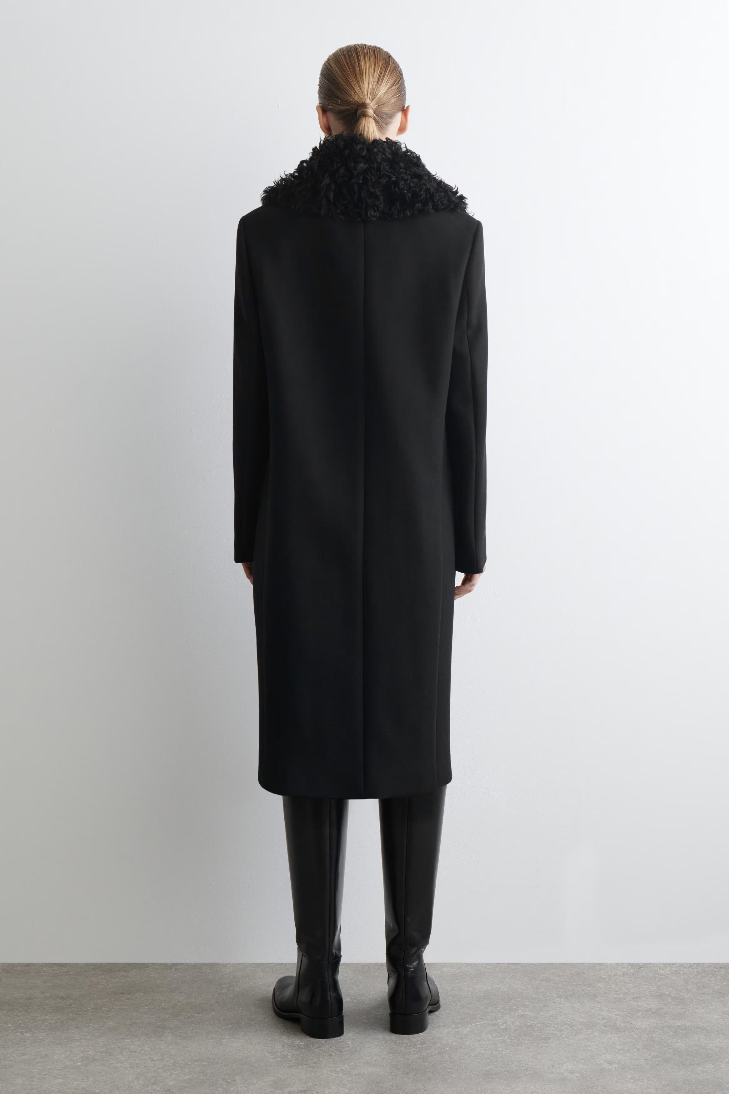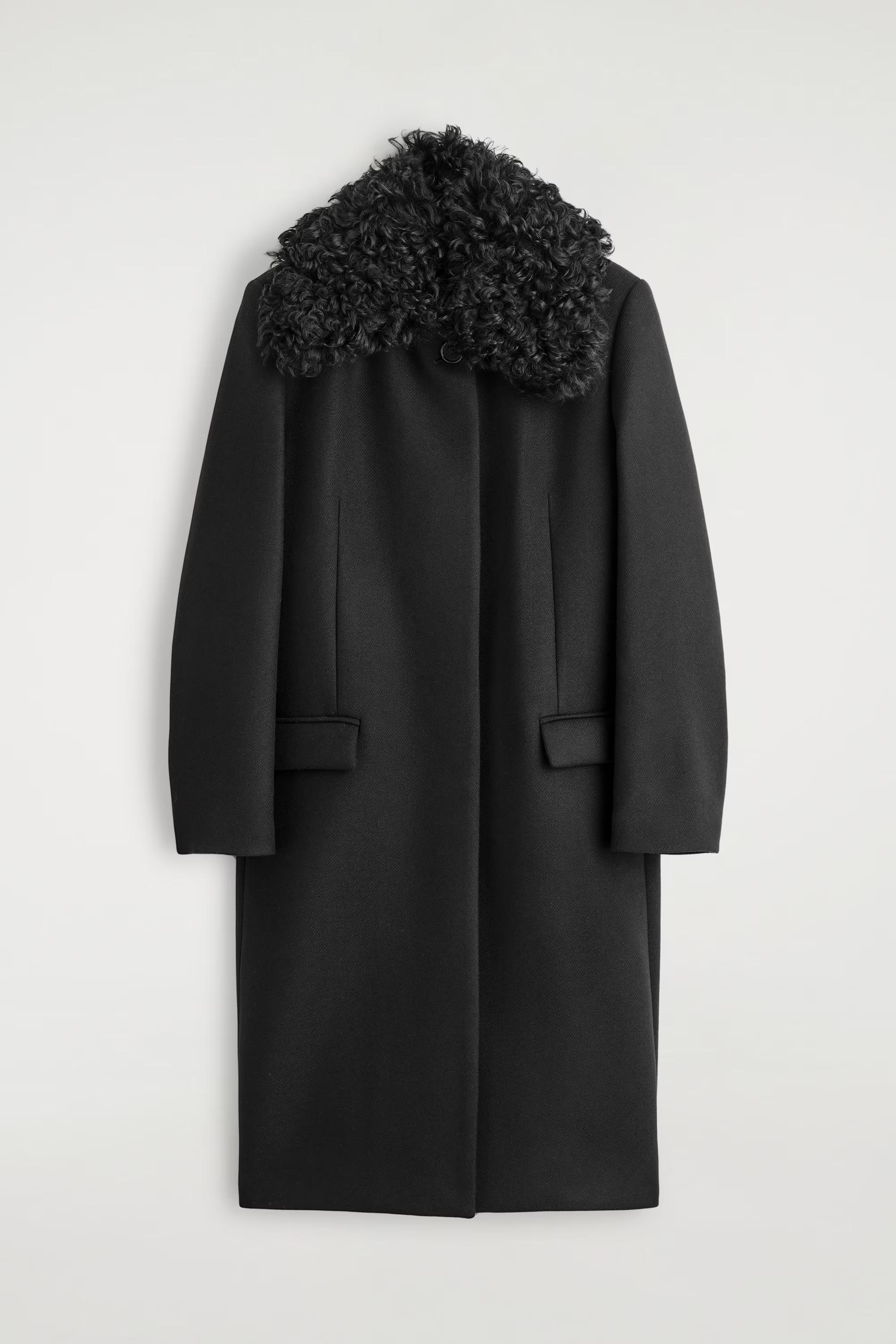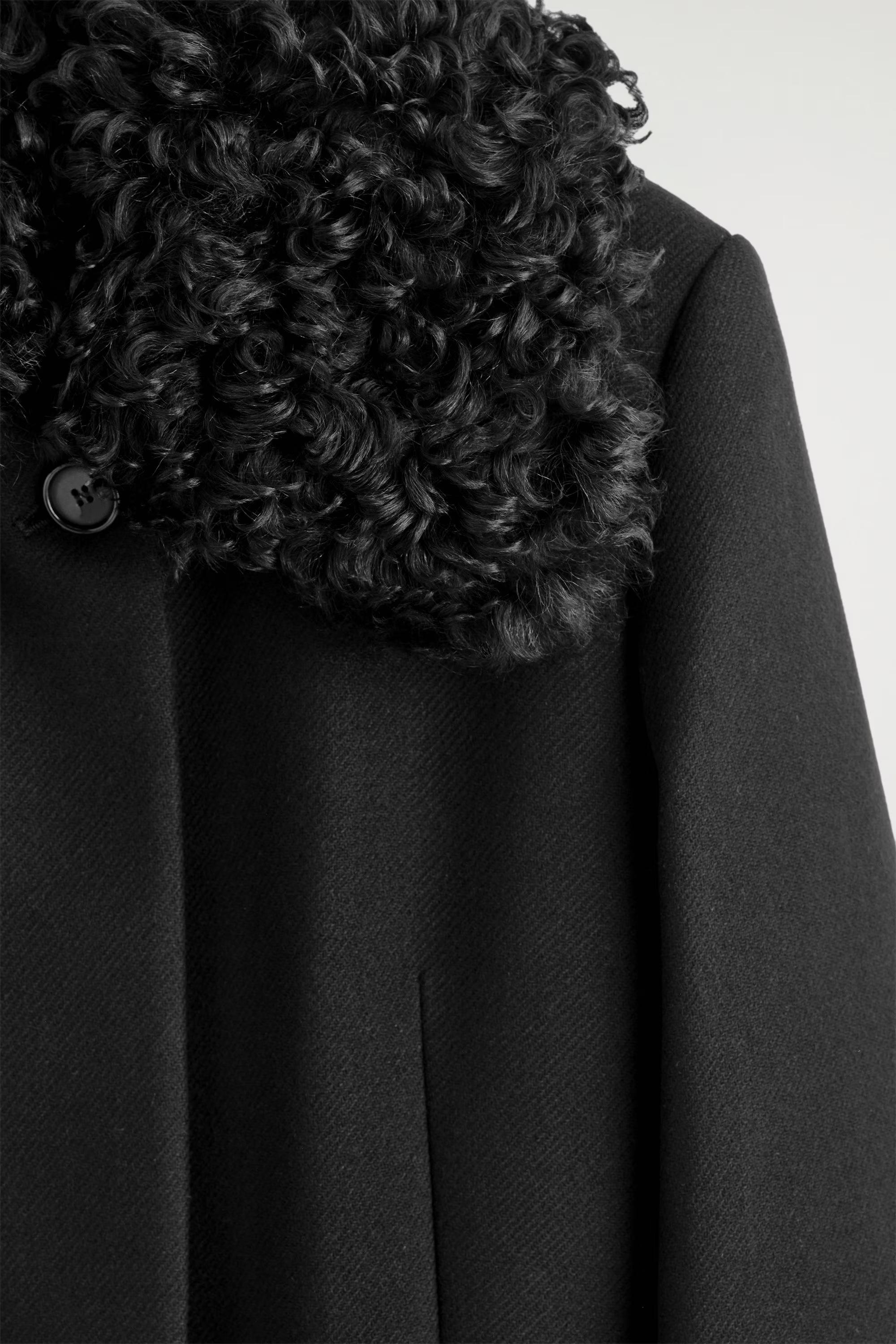 This season's outerwear collection is defined by quality craftsmanship and unexpected design details. A standout piece, this striking coat is crafted with premium wool sourced by the Italian Manteco mill and features a tailored silhouette with an oversized curly shearling collar for a refined finish.\u0026nbsp;\u0026nbsp;Regular fitButton closureThis product contains Responsible Wool Standard TE-00047206 (RWS) wool fibre from farms certified to animal welfare and land-management requirements\u0026nbsp;Shell: 75% RWS wool, 25% polyamide. Lining: 100% Viscose. Pocket lining: 100% Cotton. Collar: 100% Lamb shearling. Excluding trims / Dry clean\u0026nbsp;Back length of size EU 36 is 105.5cm / Model wears a size EU 36