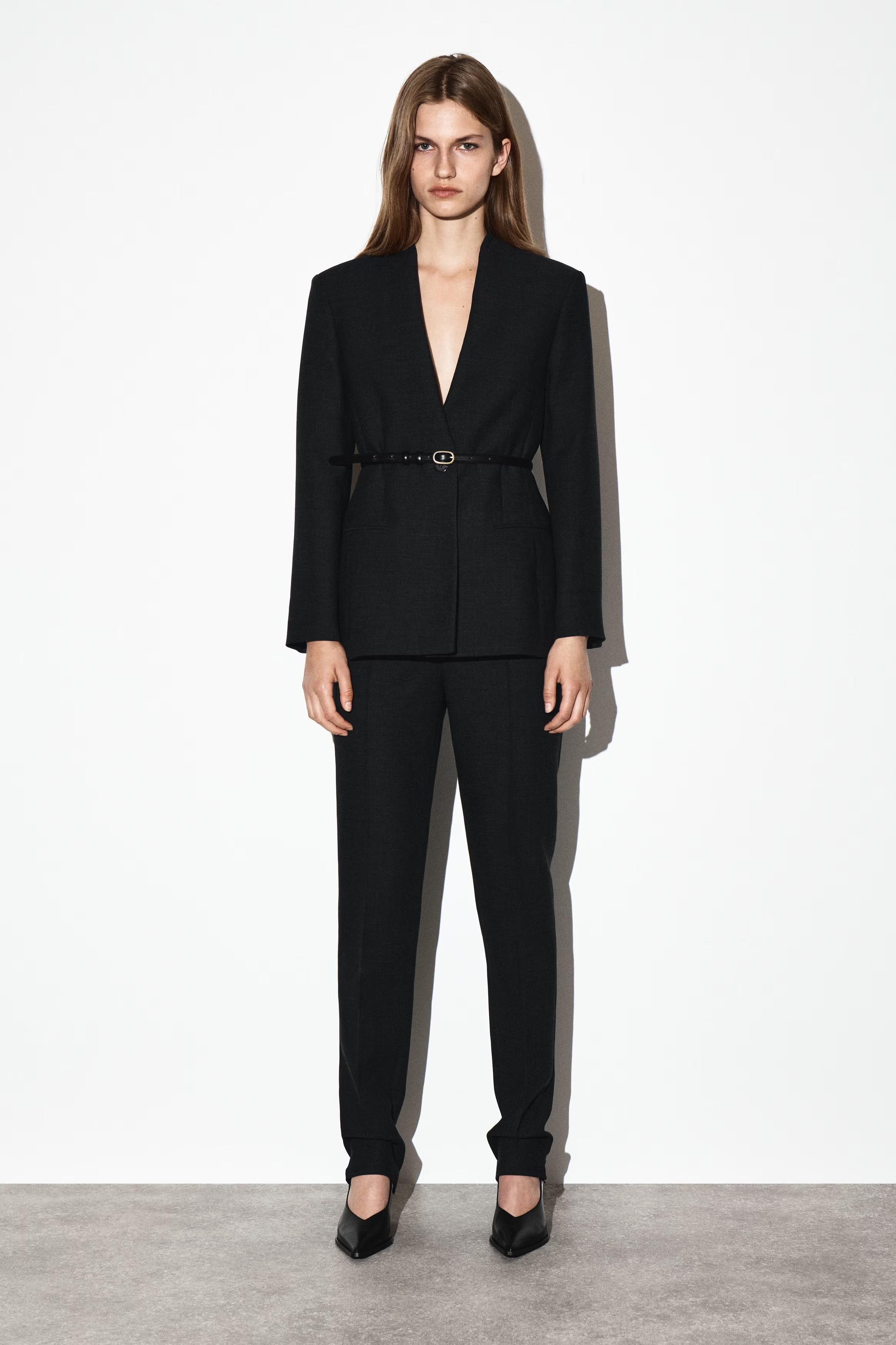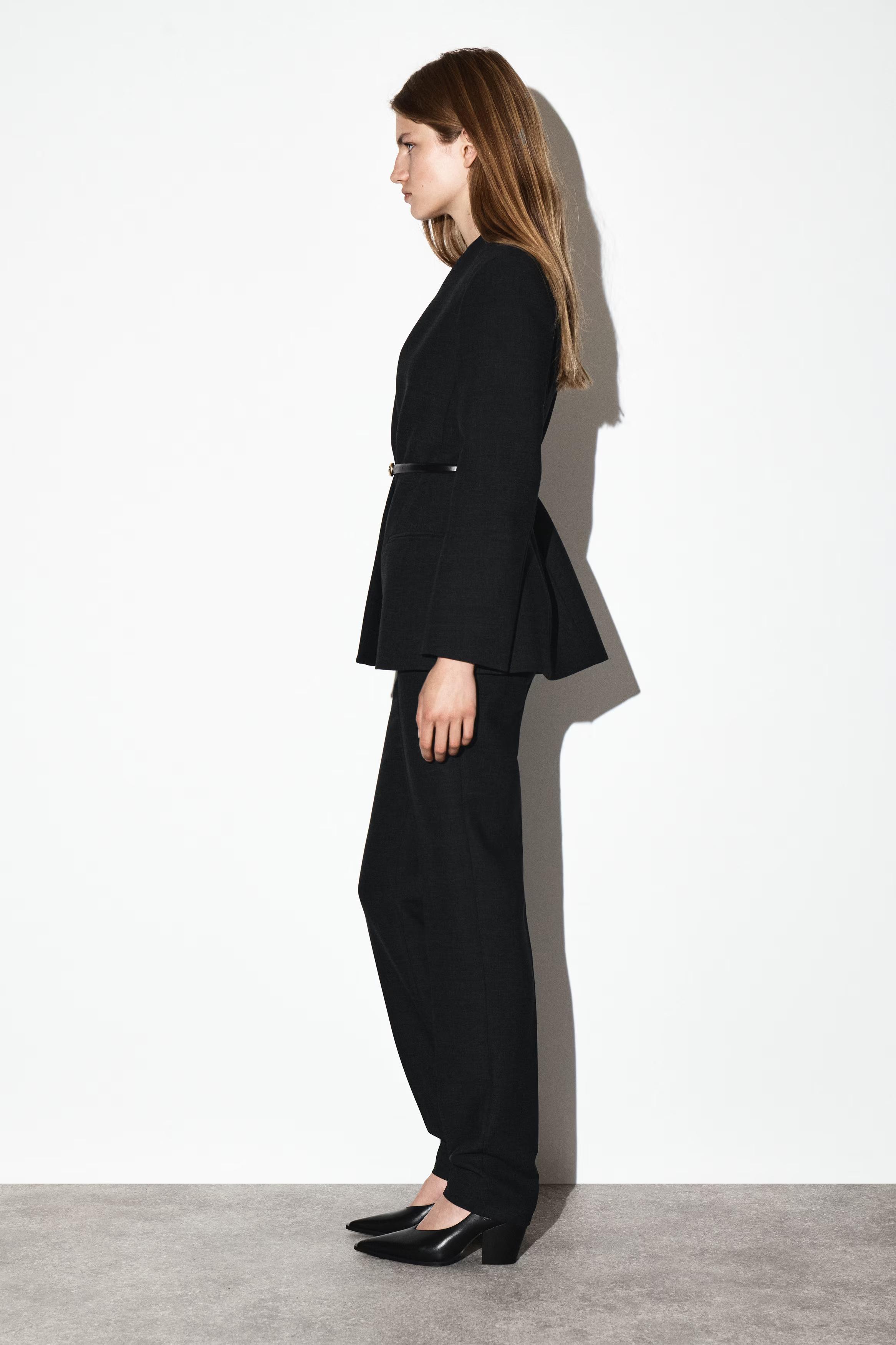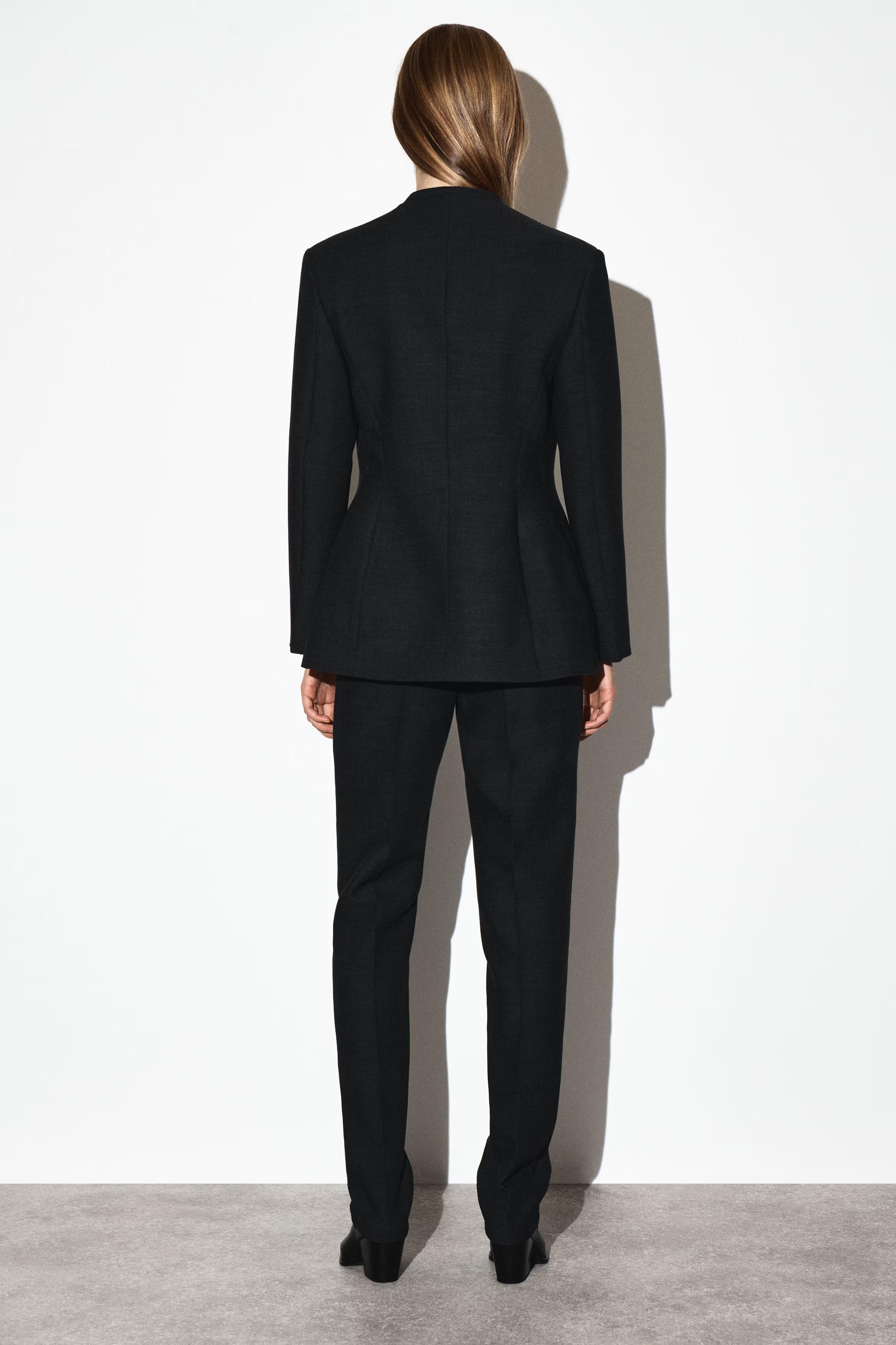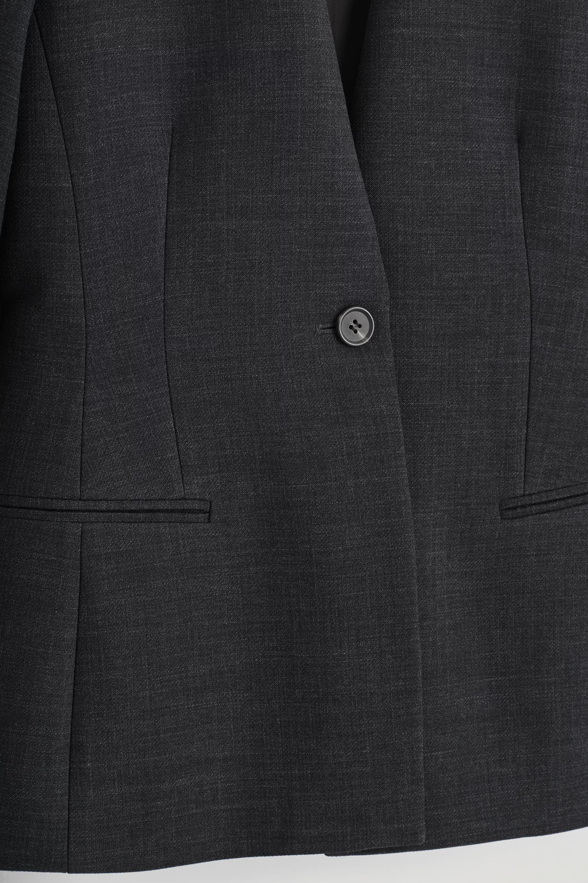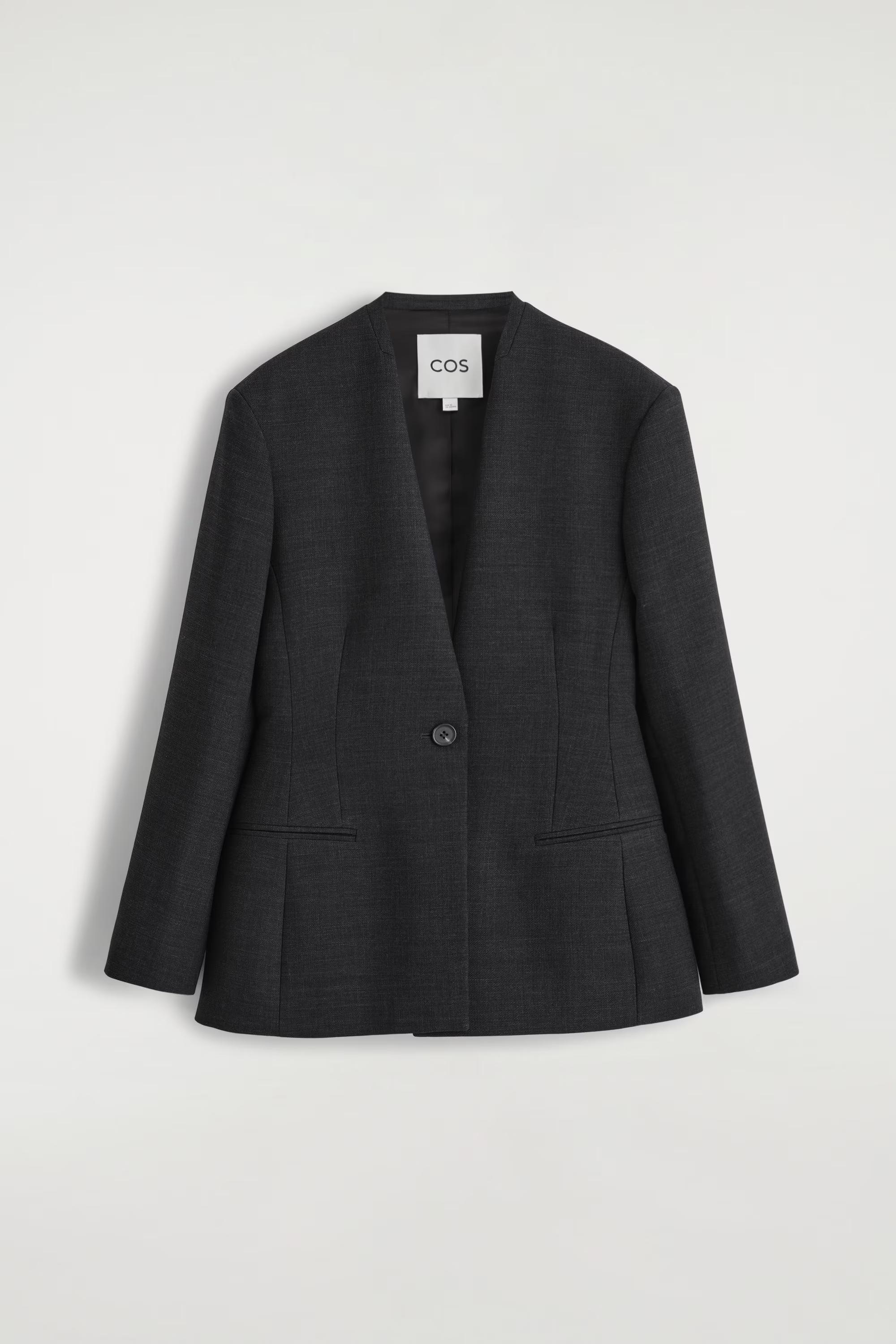 Streamlined silhouettes lead the COS tailoring collection this season. Crafted from an RWS wool blend, this refined blazer is tailored in a sculptural shape with precisely placed darts and seams to define the waist. It's finished with structured shoulders and a collarless neckline. Style it as a suit with the\u0026nbsp;matching trousers.\u0026nbsp;Regular fitButton closureRecycled polyester is polyester made from PET bottles or end-of-life textile waste. The PET bottles or textile waste is mechanically recycled and processed into new yarn\u0026nbsp;Shell: 53% Recycled polyester, 43% RWS wool, 4% Elastane. Lining: 100% Viscose. Pocket lining: 100% Cotton. Excluding trims / Dry clean\u0026nbsp;Back length of size EU 36 is 71.6cm / Model wears a size EU 36
