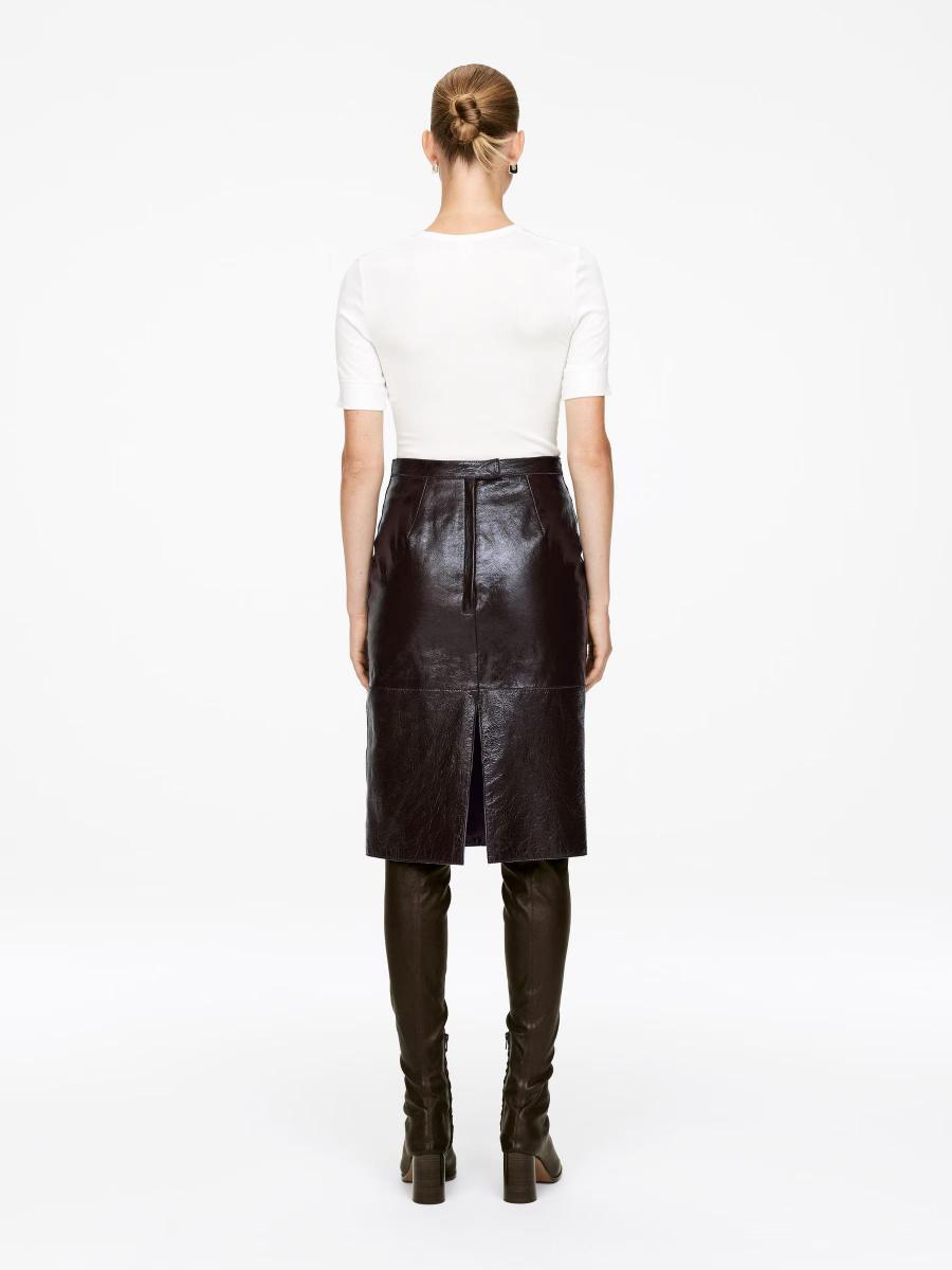 Below-the-knee skirt crafted from leather that has undergone a chrome-free tanning process. Cut in a slim fit with a high-shine surface and subtly crinkled texture for a distinctive finish. Topstitching and a centre-back slit.ARKET/