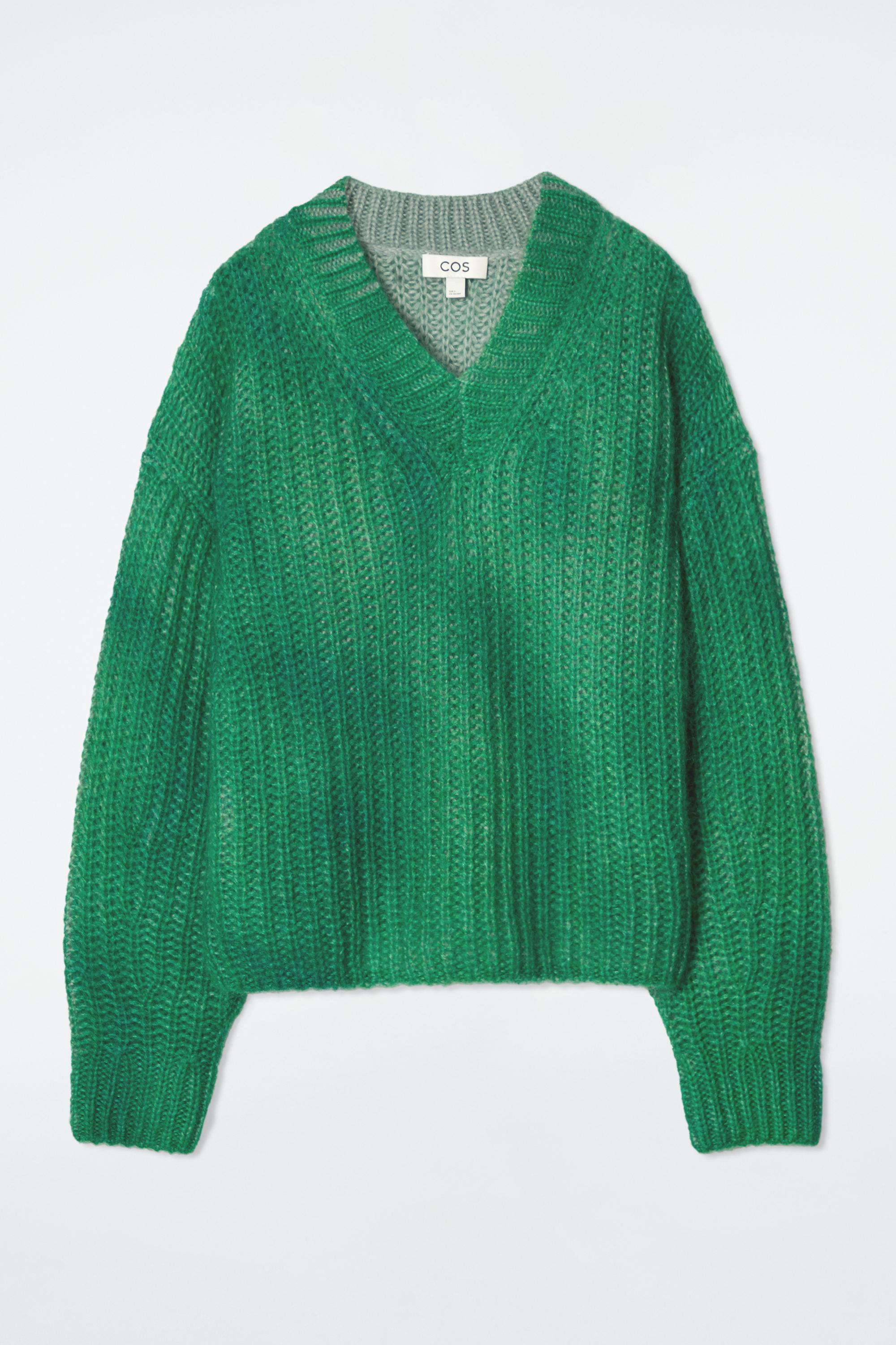 Unapologetically bold, this V-neck jumper is offered in a jade-green tone with a spray paint-effect design. It's knitted from a mohair and wool blend in a chunky half-cardigan stitch and has a rounded shape through the sleeves. Style it with classic denim.\u0026nbsp;\u0026nbsp;Relaxed fitThis product contains Responsible Mohair Standard TE-00047206 (RMS) mohair fibre from farms certified to animal welfare and land-management requirements\u0026nbsp;\u0026nbsp;Shell: 52% RMS Mohair, 33% Recycled polyamide (Recycled nylon), 15% RWS Wool. Excluding trims / Dry clean\u0026nbsp;Back length of size S is 54cm / Model wears a size S