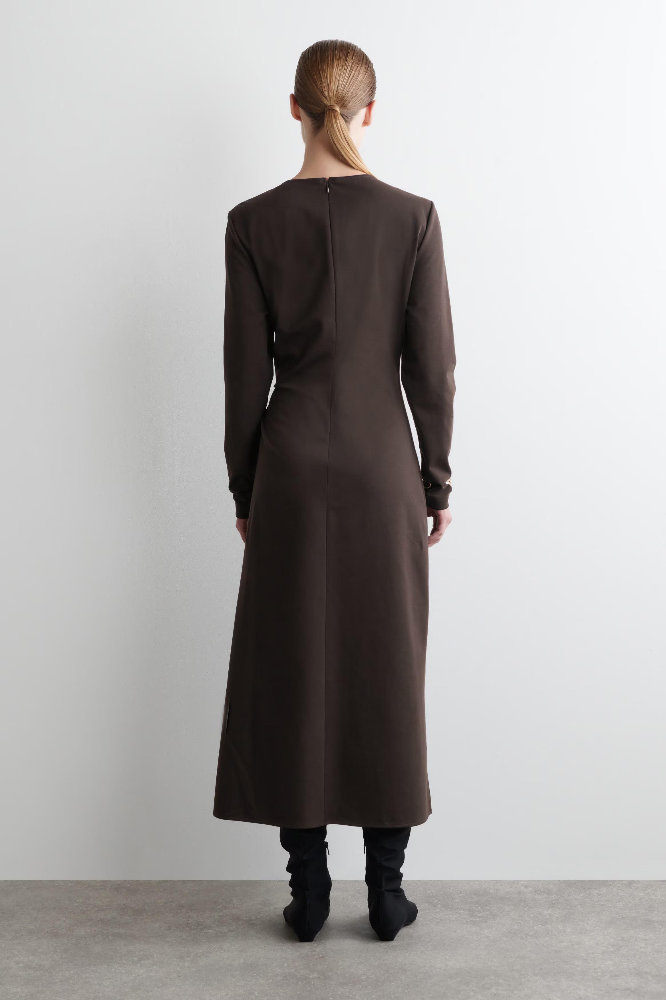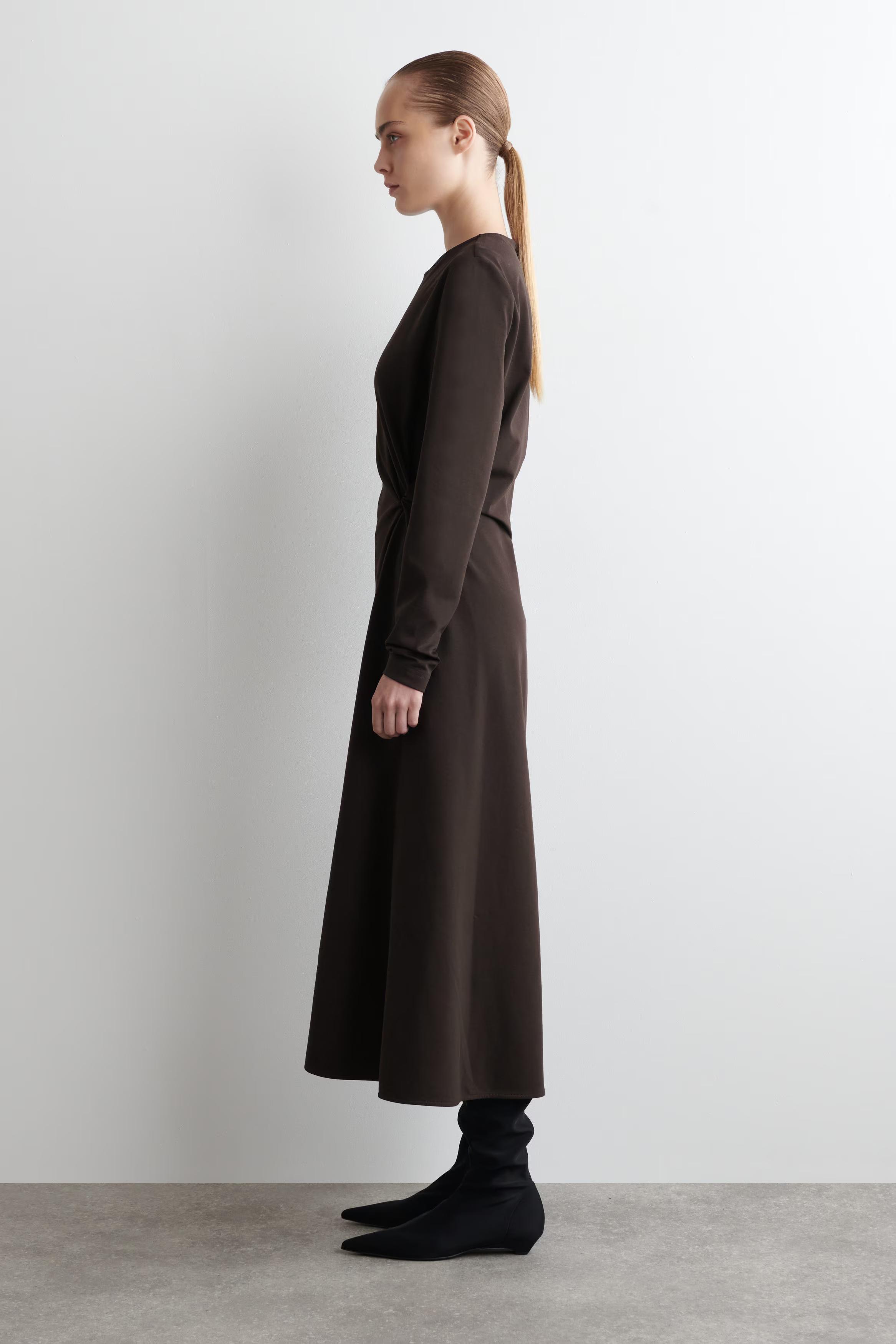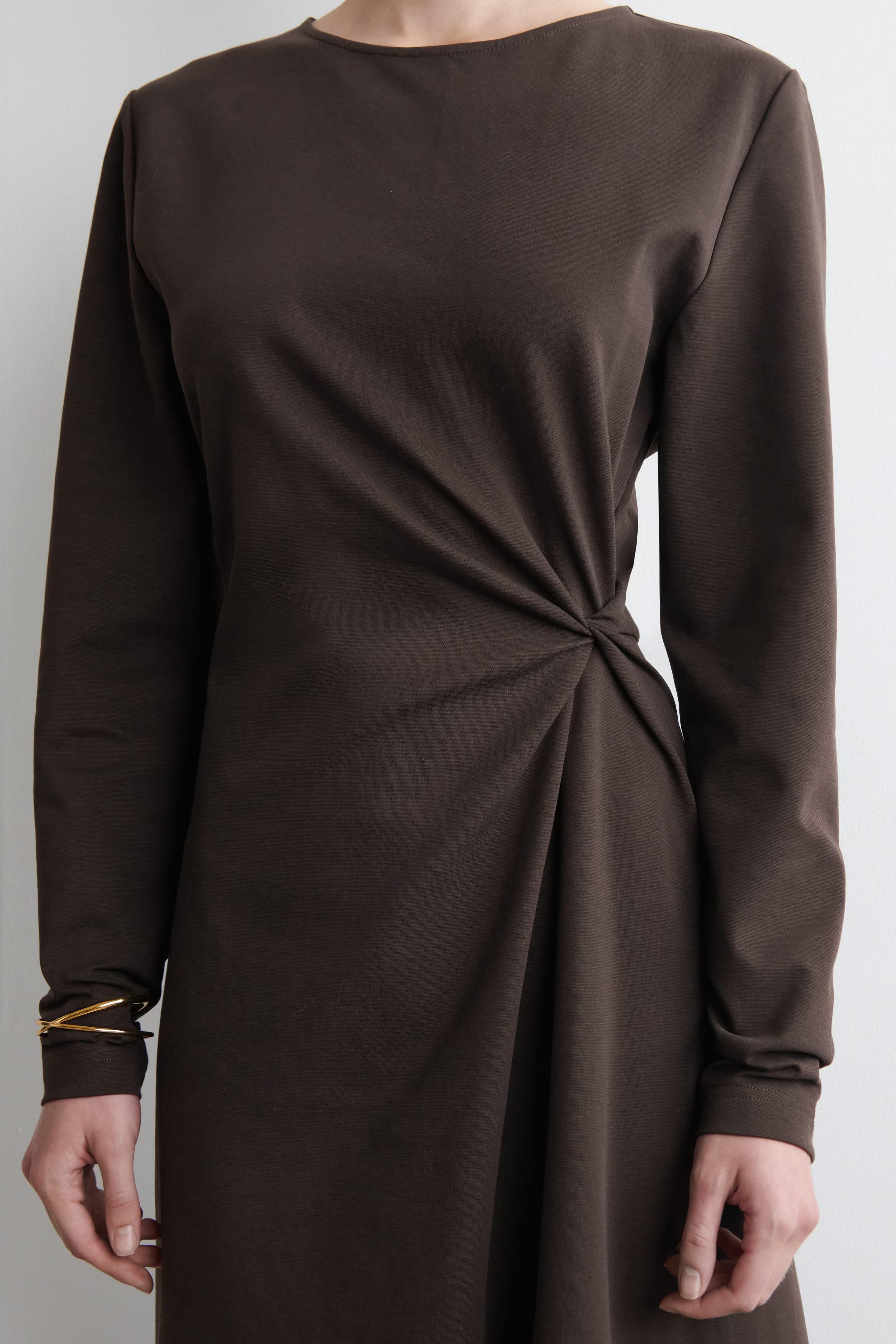 Defined by a twisted detail at the waist, this sophisticated dress is crafted from a soft cotton blend in a rich espresso tone. It has a long-sleeved silhouette and softly flared hem.\u0026nbsp;Regular fitHook-and-bar and zip closure\u0026nbsp;Shell: 65% Cotton, 28% Polyamide (Nylon), 7% Elastane. Binding: 100% Cotton. Excluding trims / Machine wash\u0026nbsp;Back length of size S is 123cm / Model wears a size S