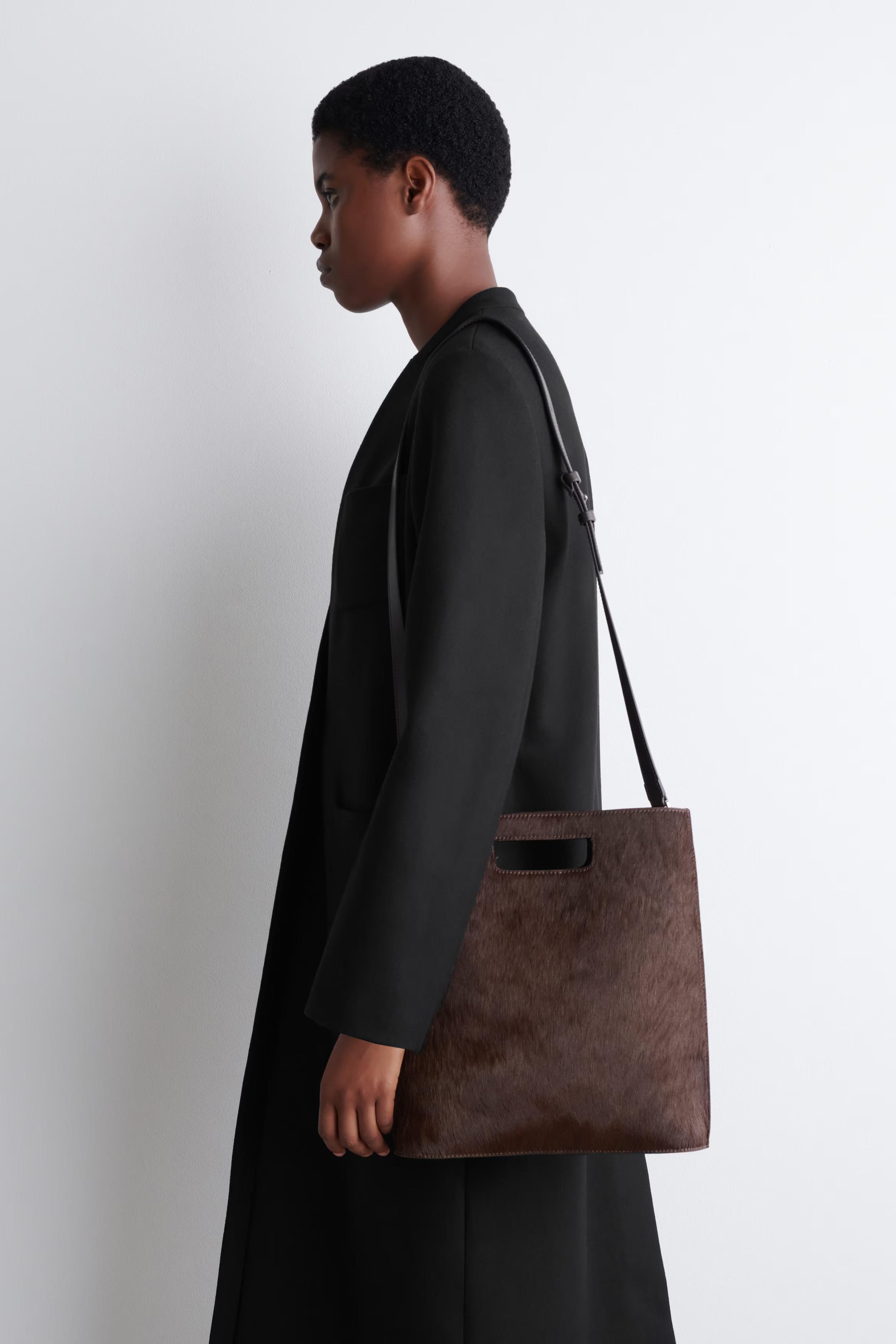 Introducing the Folio bag: revisited from the COS archive, renewed for the upcoming season. It's crafted from tactile pony hair-effect leather and retains its distinctive, slim silhouette with angular sides and an oval-shaped base. Style it across the body or carry it by the cutout handle.\u0026nbsp;Magnetic closureDetachable crossbody strapCOS supports responsible manufacturing via the Leather Working Group\u0026nbsp;Shell and lining: 100% Leather. Excluding trims\u0026nbsp;Height: 32cm, Width: 28cm, Depth: 10cm