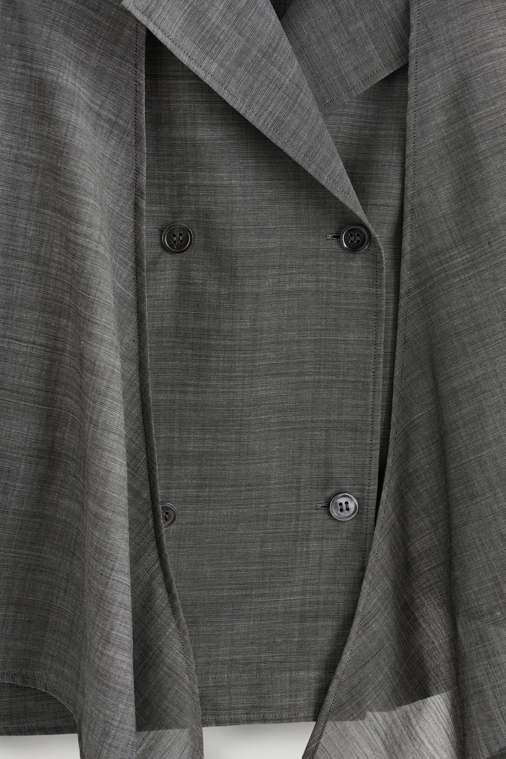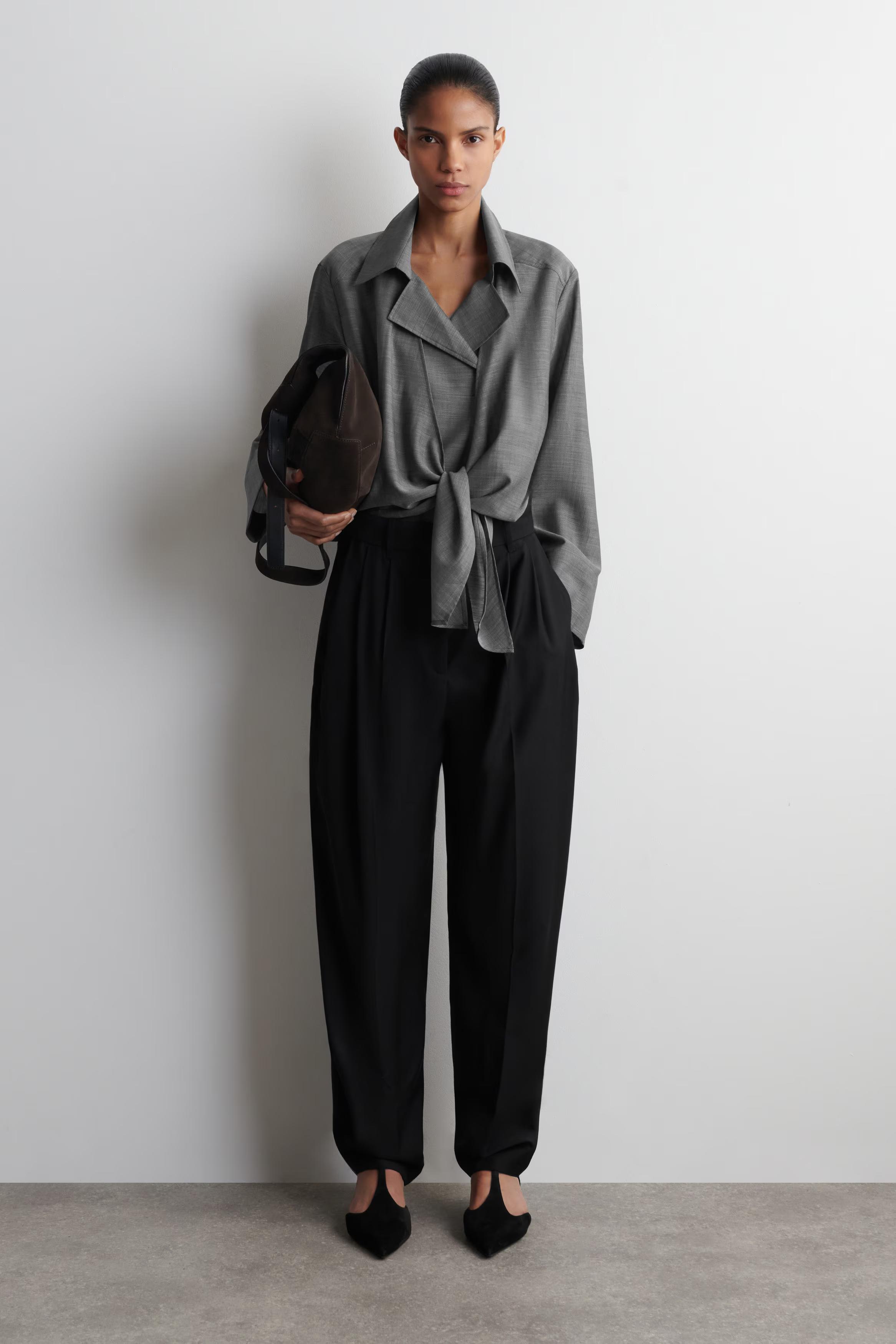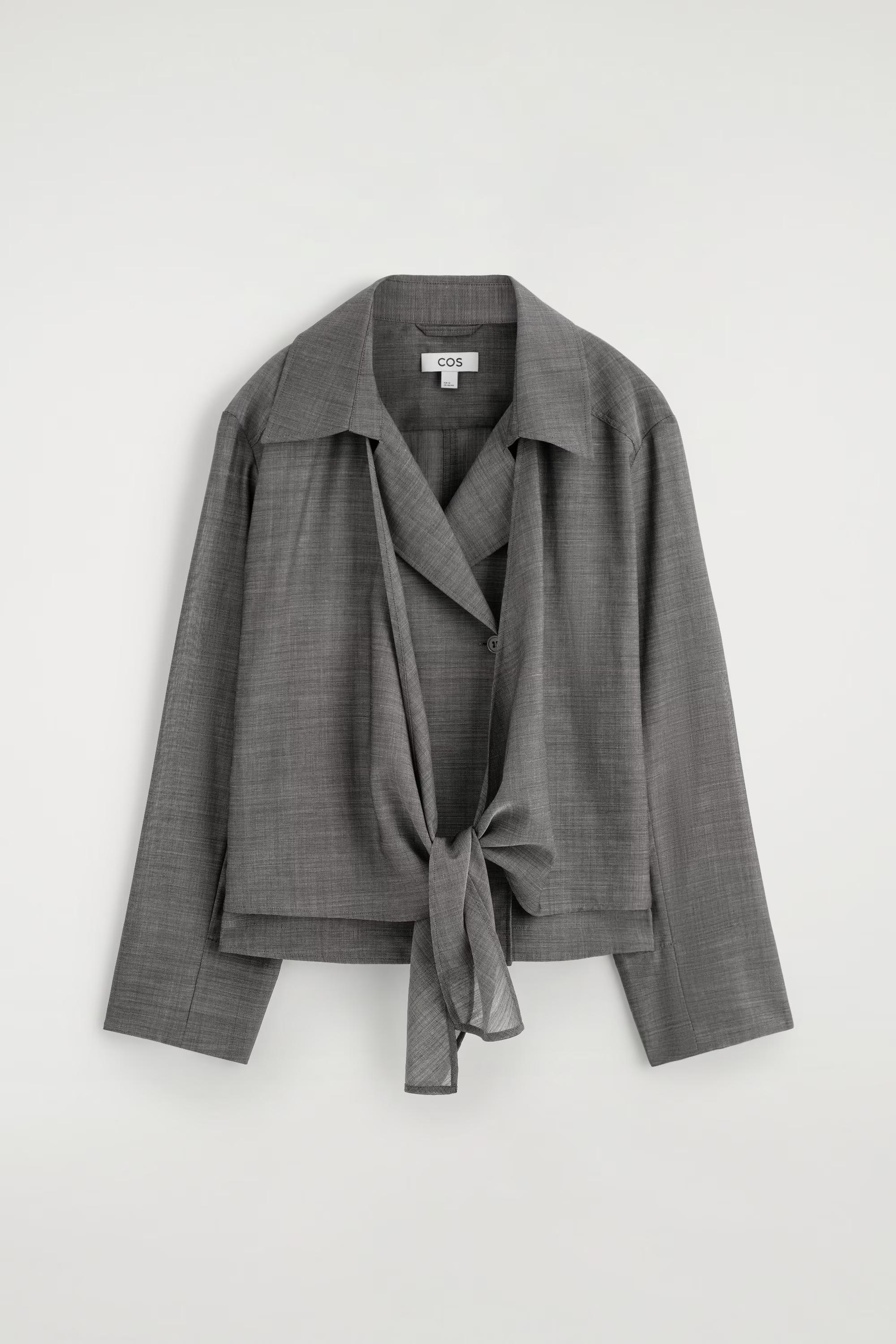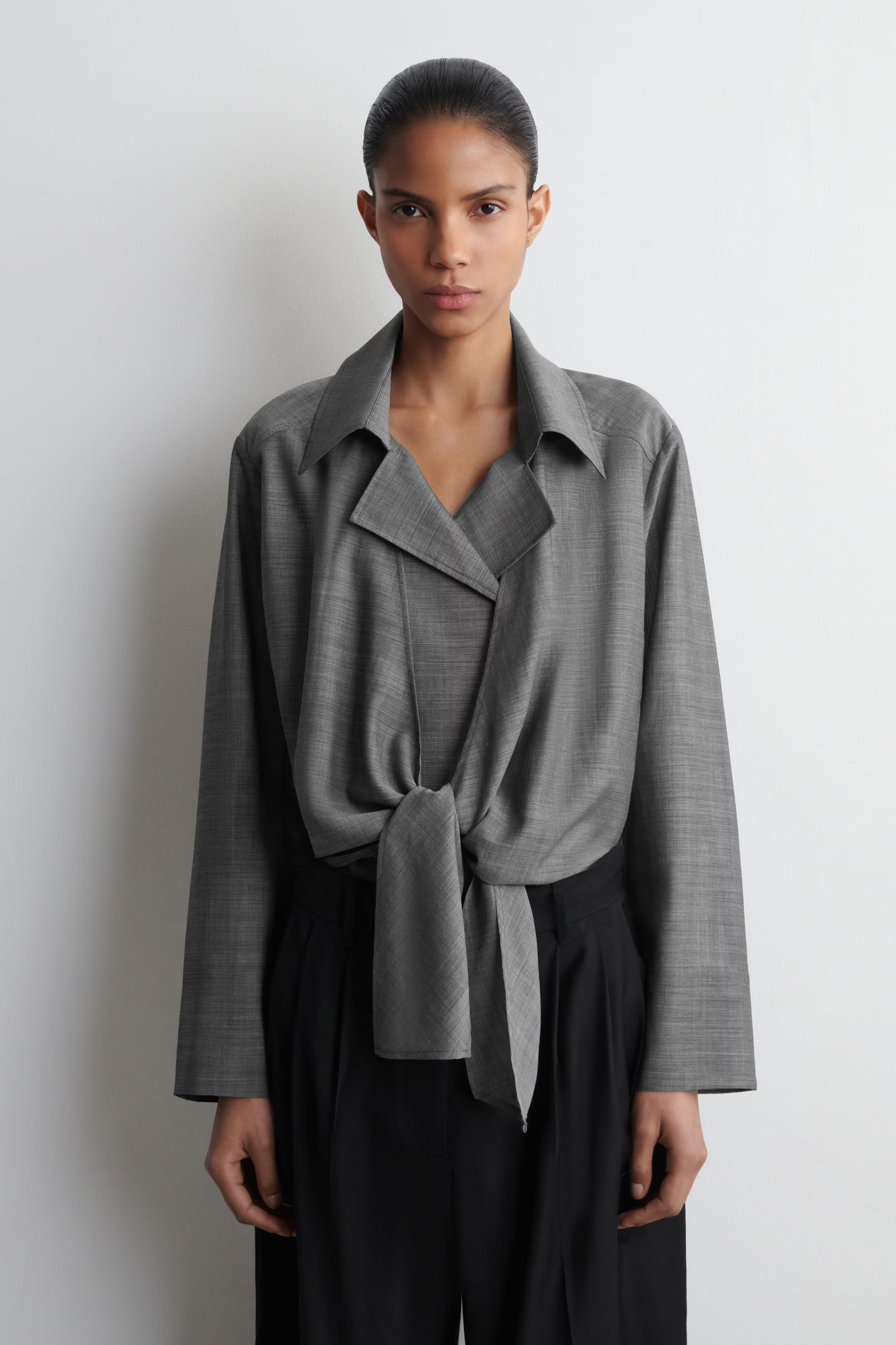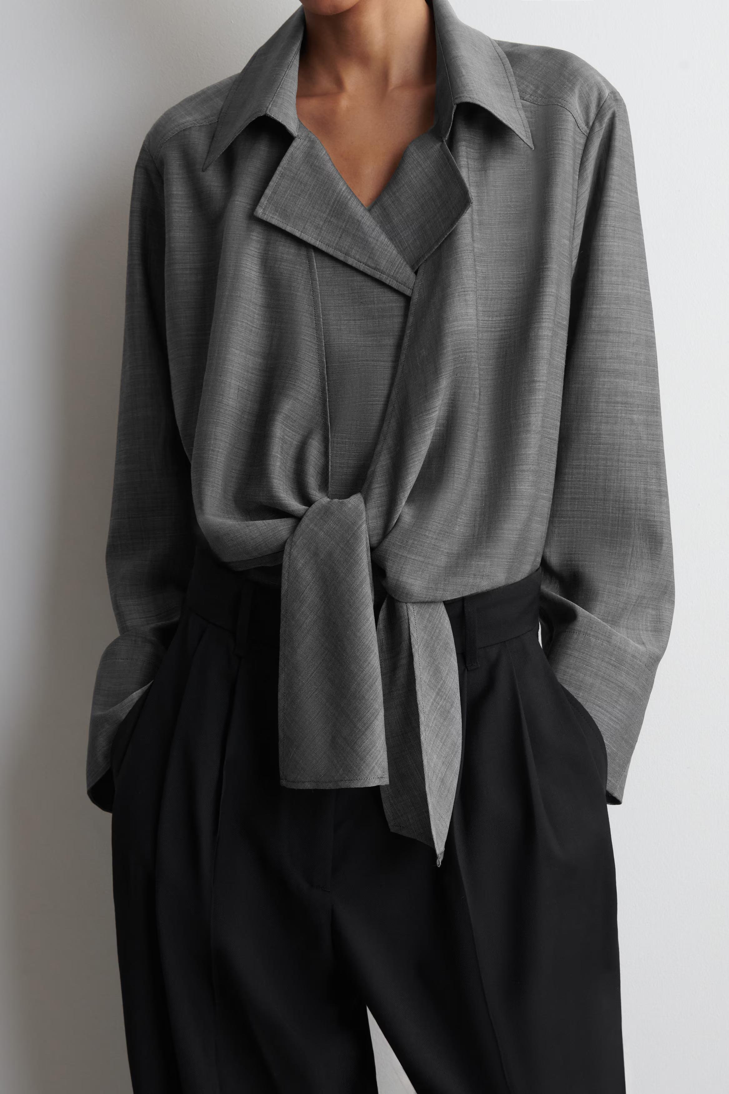 The COS tailoring collection taps into an '80s sensibility this season. Rendered in classic heathered grey, this shirt is made from a sheer wool and ramie blend and designed with an open collar and tie front.\u0026nbsp;\u0026nbsp;Relaxed fitButton closureDry clean\u0026nbsp;Back length of size EU 36 is 58.5cm / Model wears a size EU 36