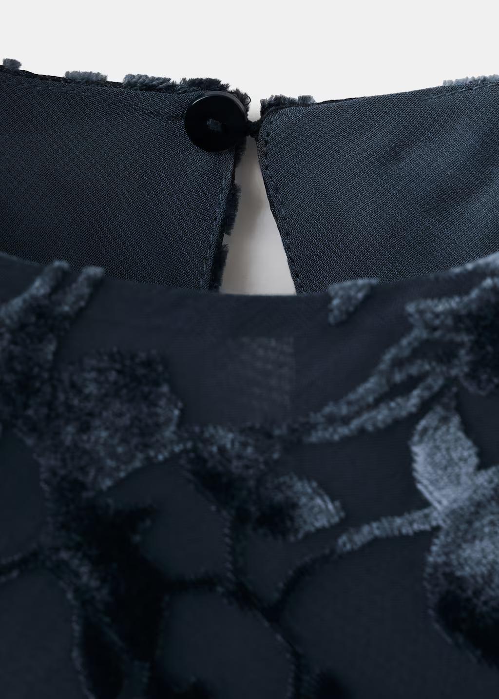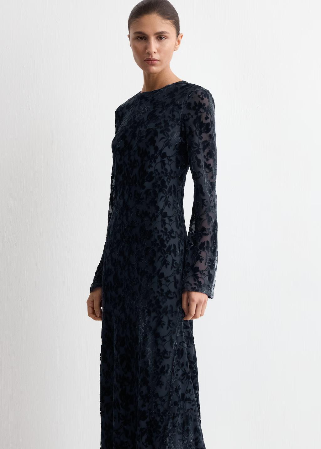 Tejido devoré. Diseño largo. Diseño entallado. Estampado floral. Cuello redondo. Manga larga. Cierre de cremallera en la parte posterior. Forro interior. Esta prenda pertenece a nuestra colección de fiesta y evento, diseñada para elevar tus looks en ocasiones especiales