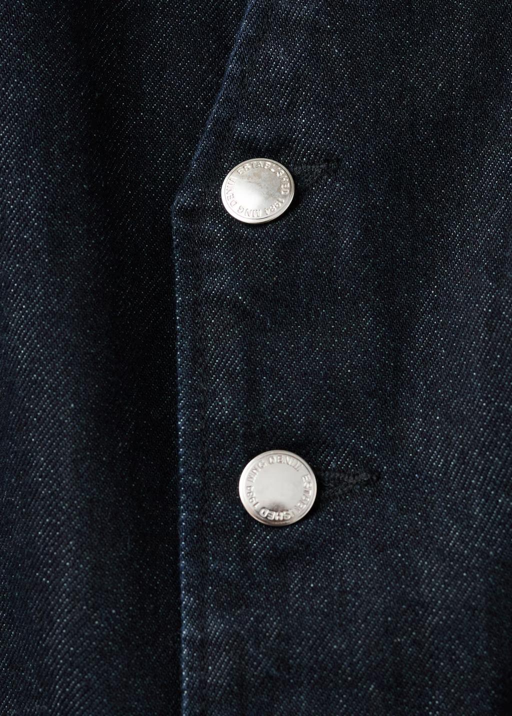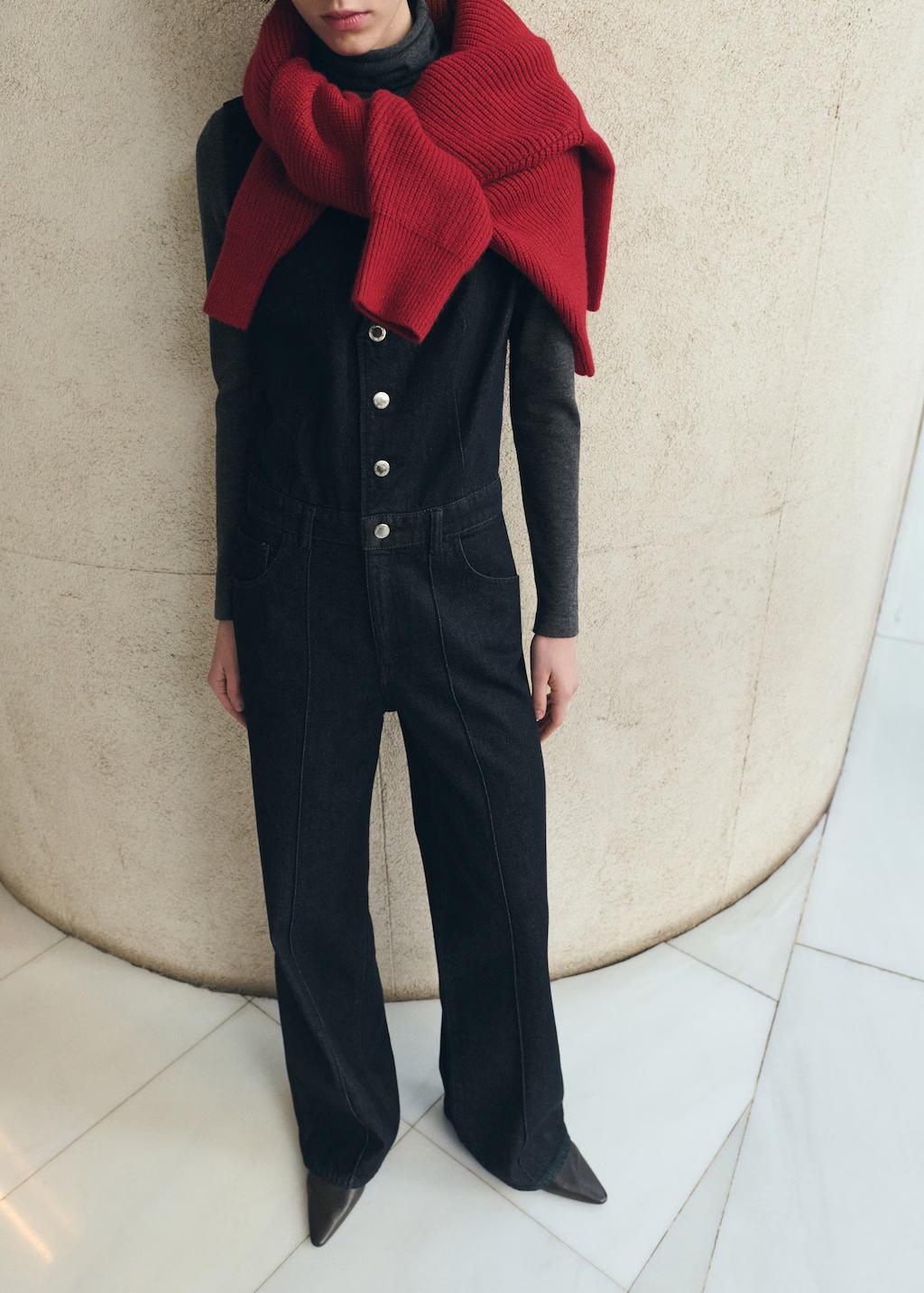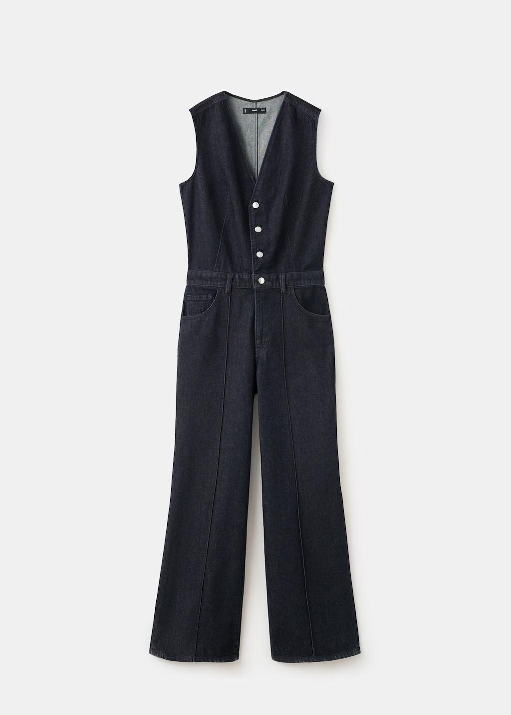 Tejido de algodón estilo tejano vaquero. Diseño largo. Diseño recto. Cuello pico. Sin mangas. Tirantes anchos. Trabillas. Cinco bolsillos. Cierre delantero con botones