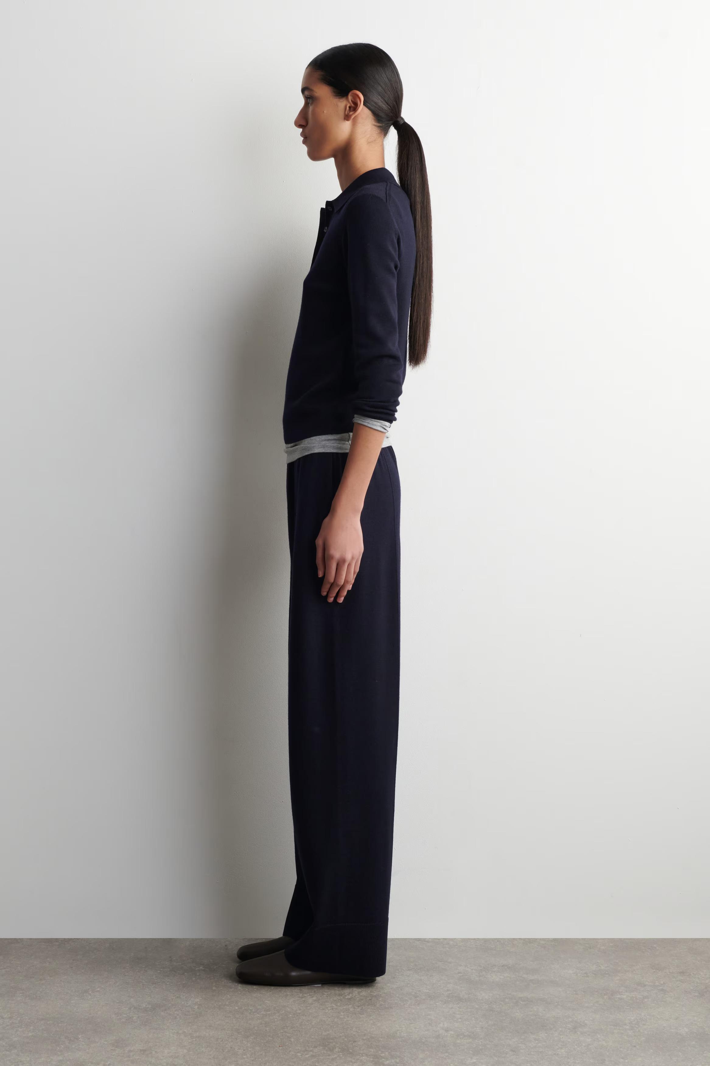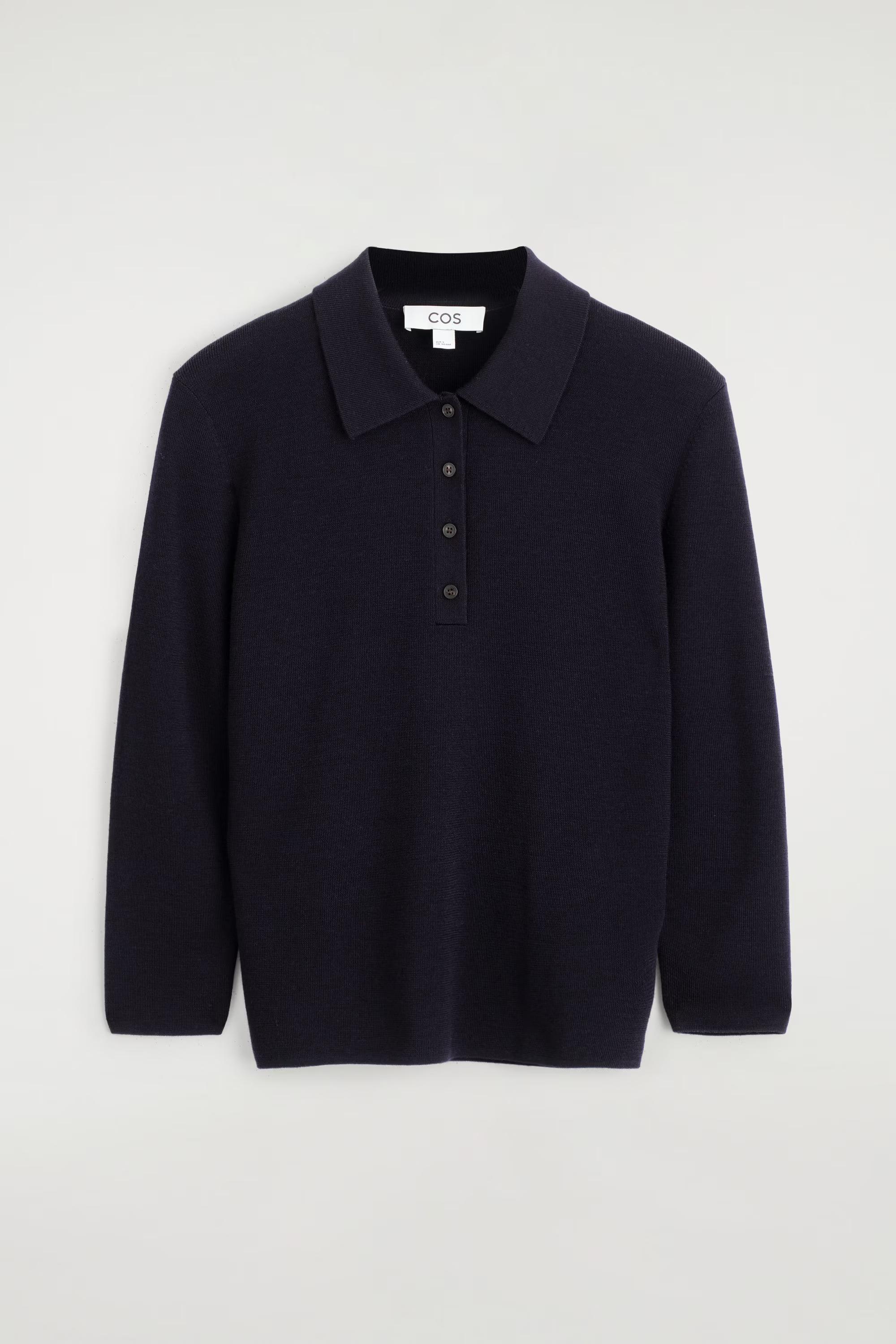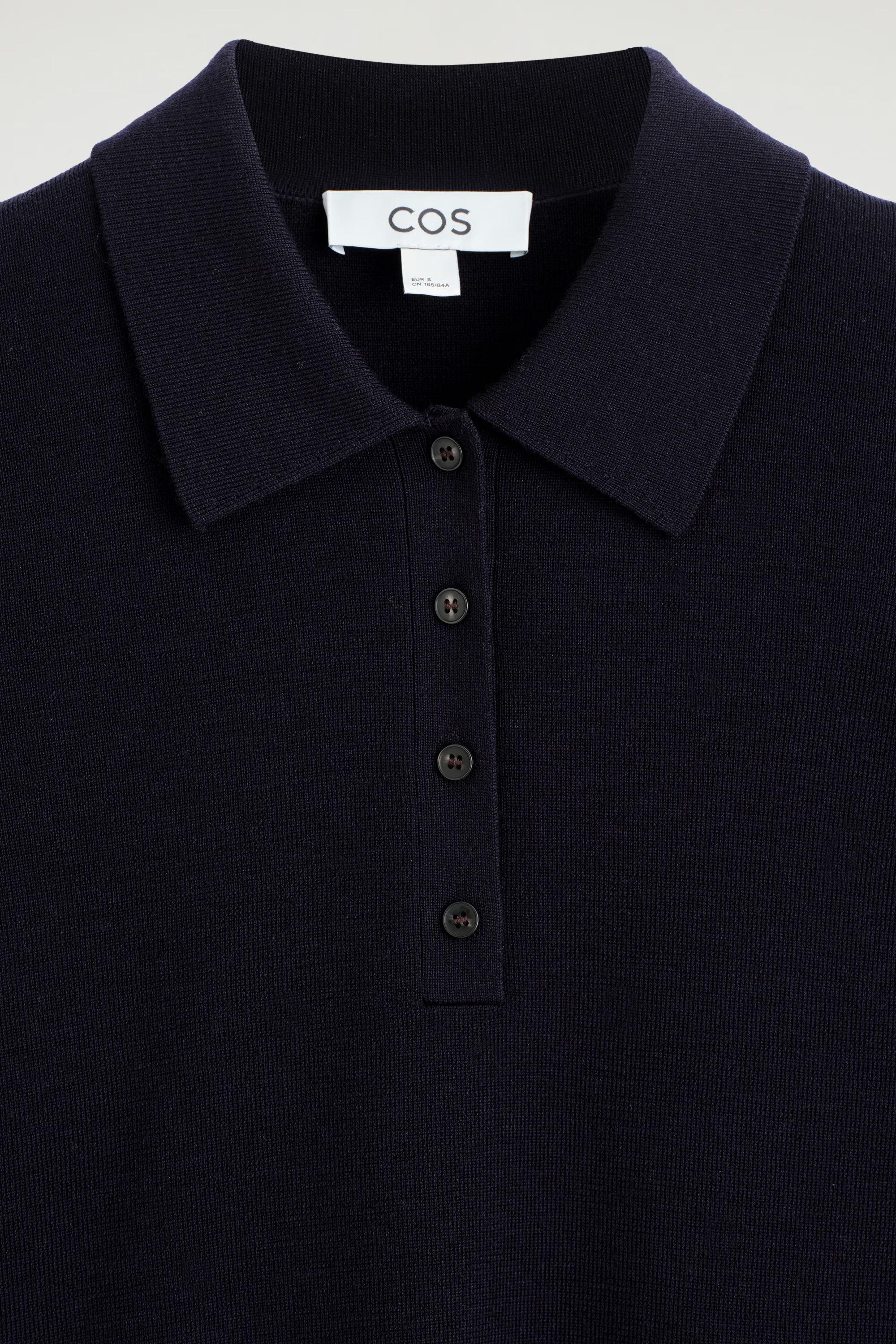 A considered wardrobe staple, this polo shirt is knitted from ultra-soft merino wool and rendered in an enduring navy tone. It's designed with a classic collar, buttoned half-placket and three-quarter-length sleeves. Style it as a set with the matching skirt.\u0026nbsp;Regular fitButton closure\u0026nbsp;Shell: 100% Merino wool. Excluding trims / Machine wash\u0026nbsp;Back length of size S is 54cm / Model wears a size S