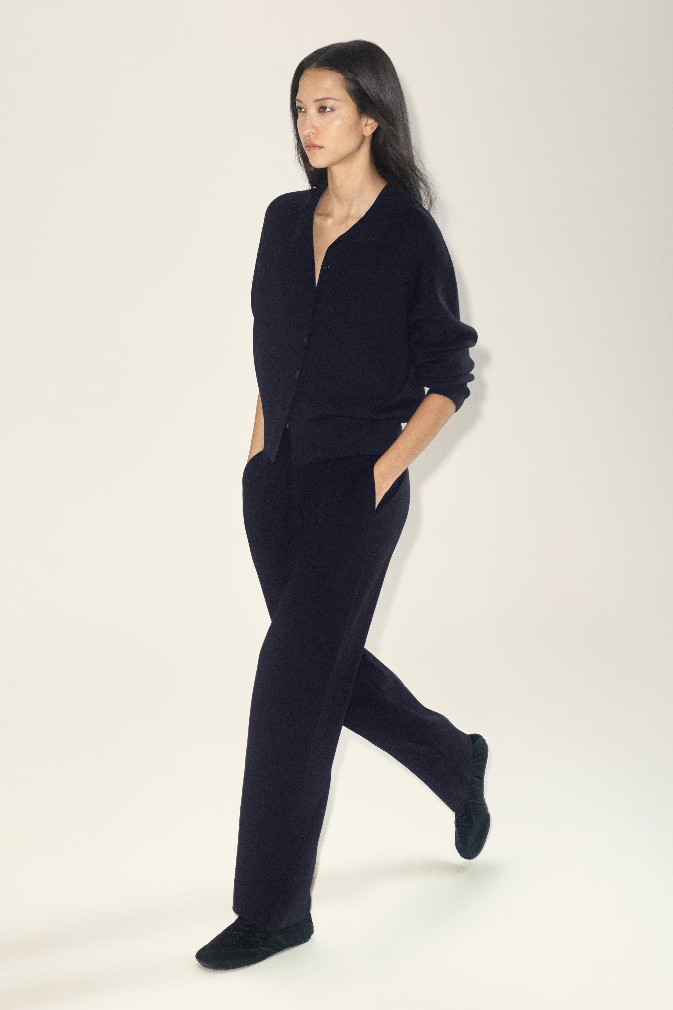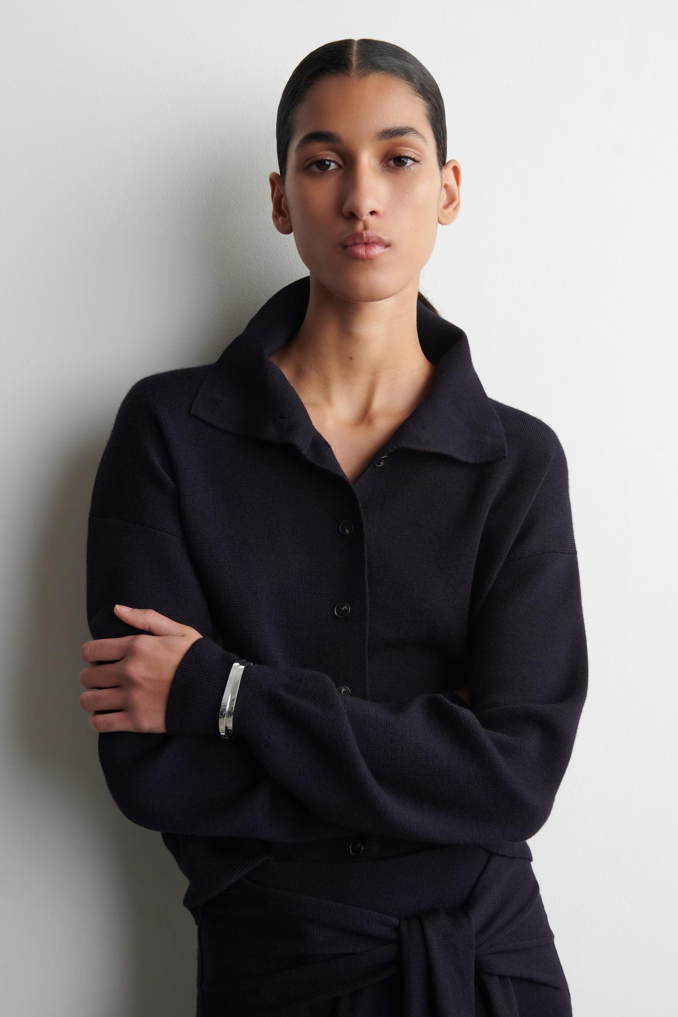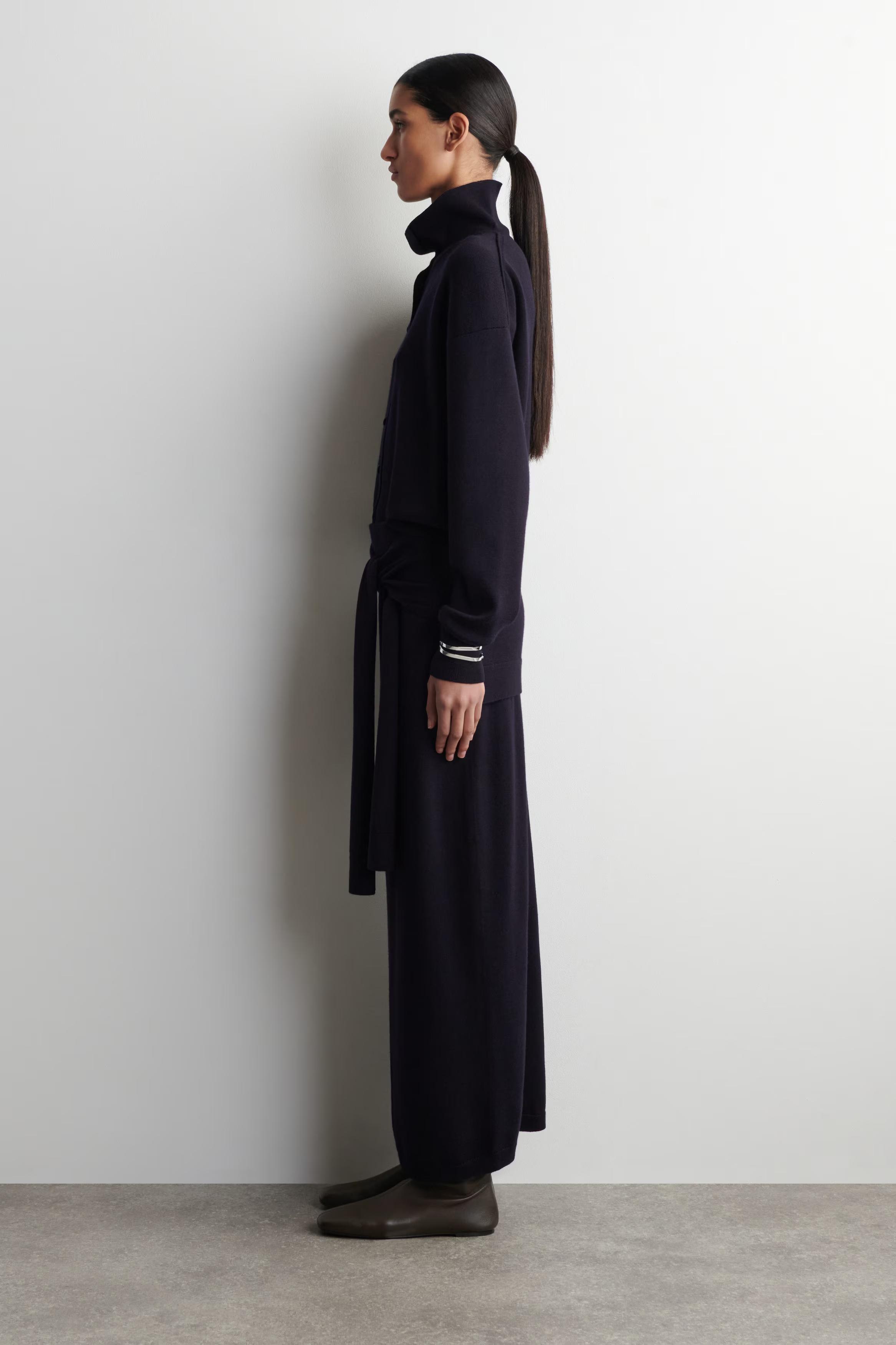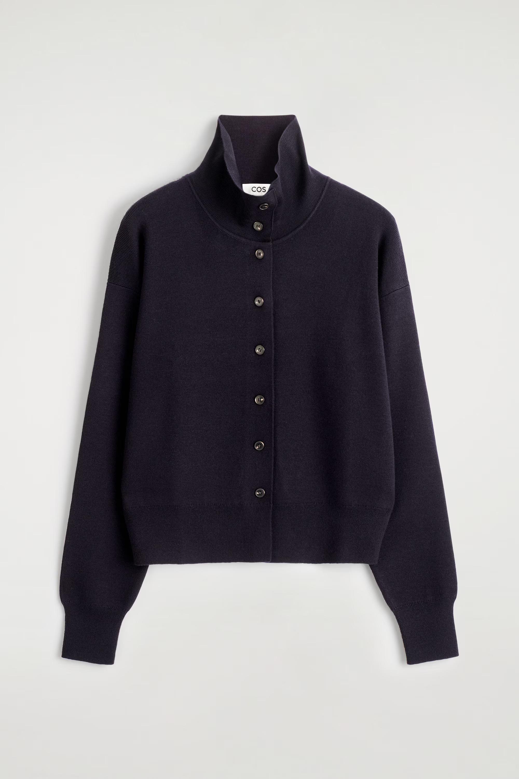 This season, the classic cardigan is renewed with a refined sensibility. This piece is knitted from ultra-soft, fine merino wool and designed with a versatile neckline \u0026ndash; wear it as a funnel neck or effortlessly unbuttoned. Style it as a coord with the matching trousers.\u0026nbsp;Regular fitButton closureMachine wash\u0026nbsp;Back length of size S is 52cm / Model wears a size S