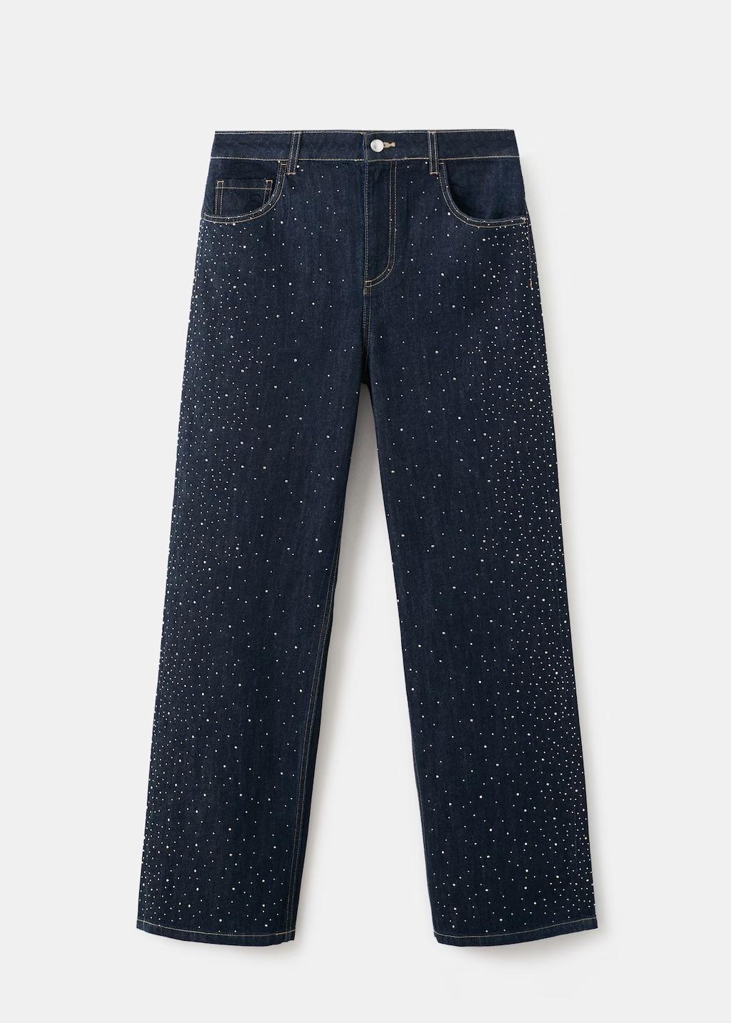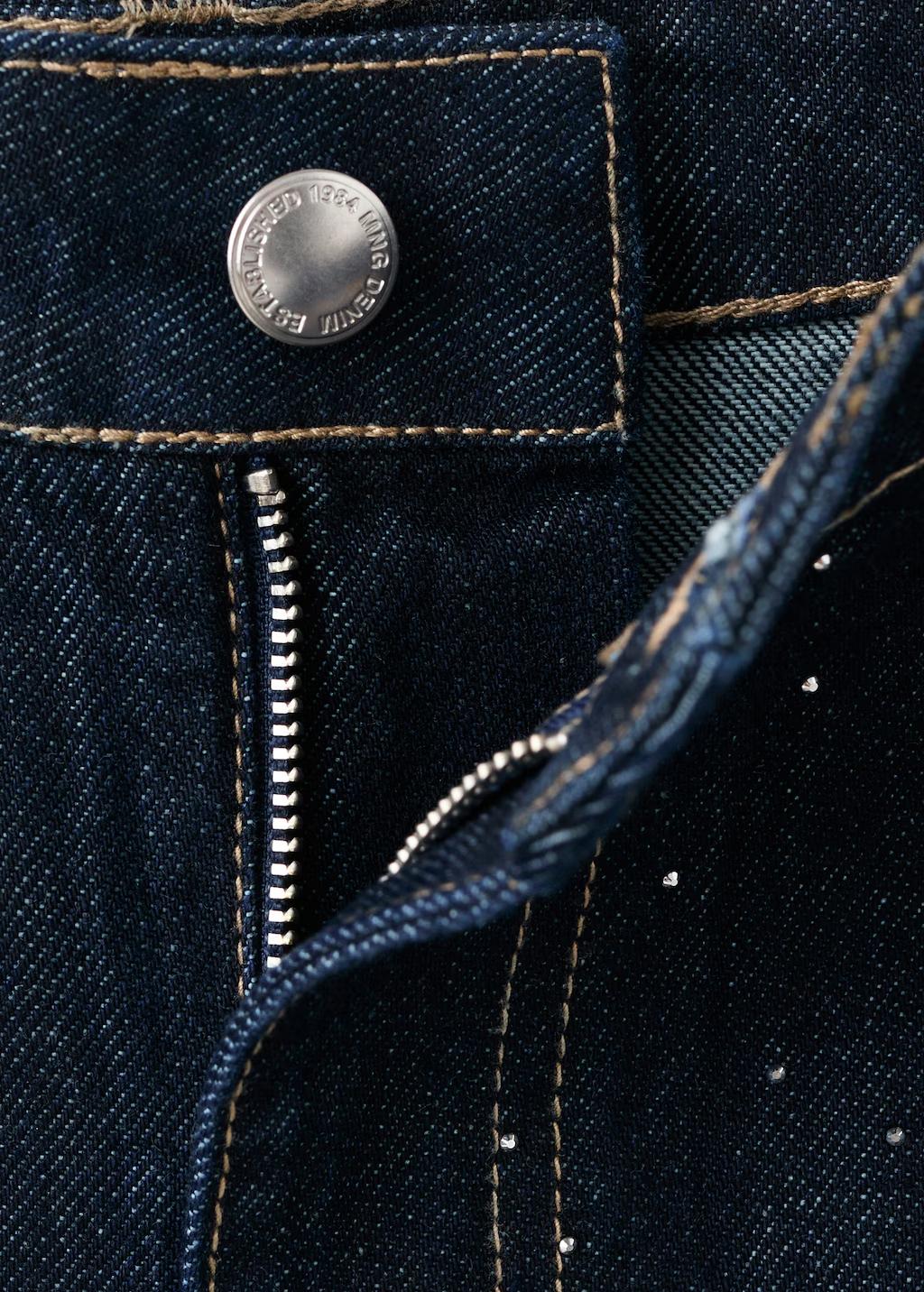 Producto en rebajas. Tejido de algodón estilo tejano vaquero. Diseño largo. Diseño recto. Detalle de strass. Tiro medio. Trabillas. Cinco bolsillos. Cierre de botón y cremallera. Esta prenda pertenece a nuestra colección de fiesta y evento, diseñada para elevar tus looks en ocasiones especiales