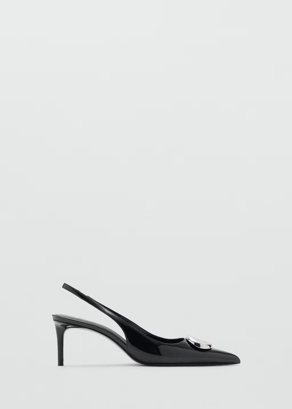 Efecto charol. Diseño destalonado. Con punta. Pieza metálica redonda decorativa. Tacón de aguja. Sin cierre. El tacón mide 6 cm