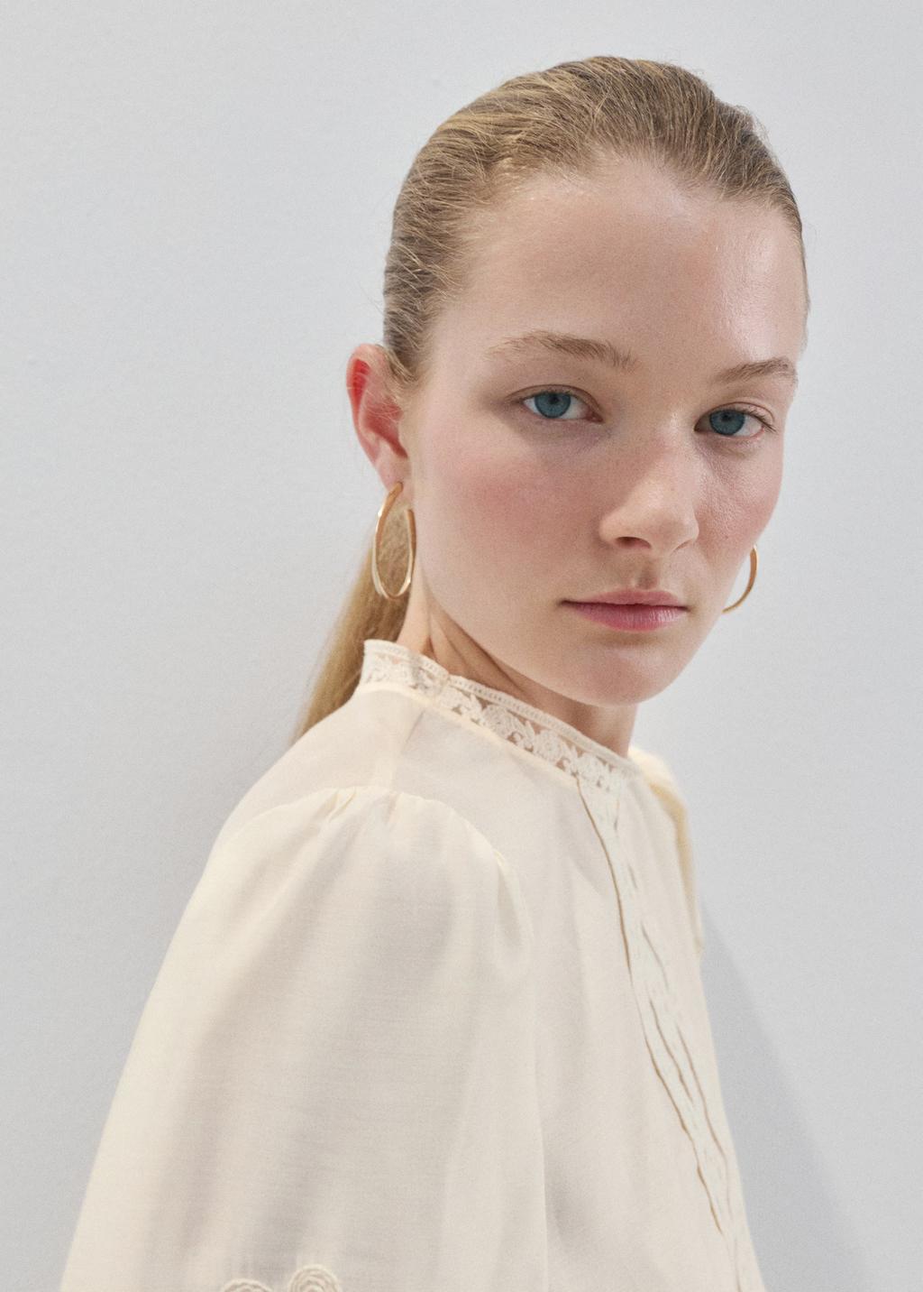Tejido de algodón. Diseño recto. Estampado floral. Cuello redondo. Manga larga con puños abotonados. Cierre de botones en el cuello