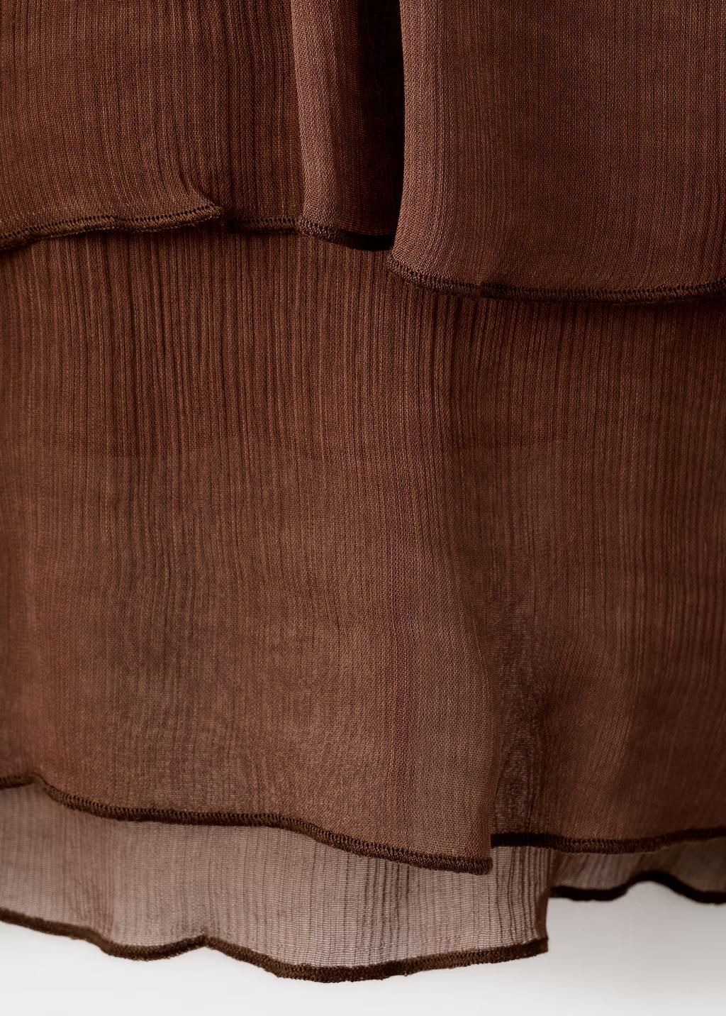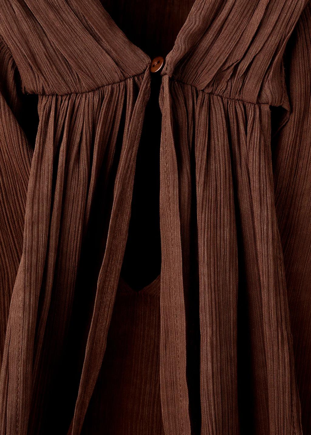 Diseño recto. Detalle de volantes. Cuello alto. Manga larga. Cierre trasero