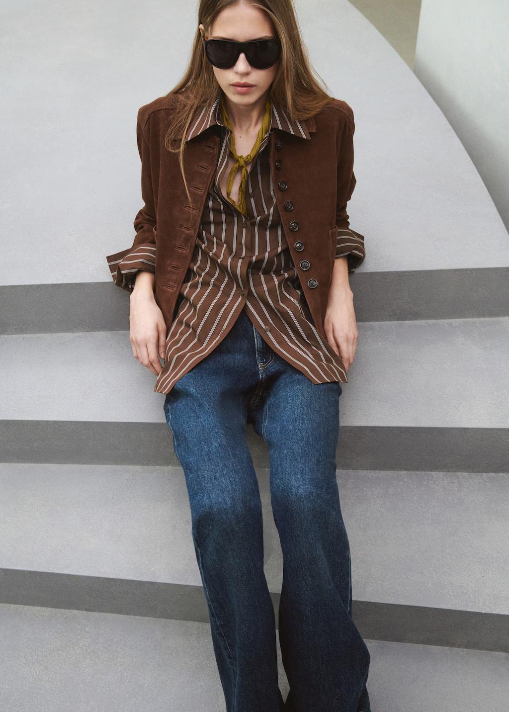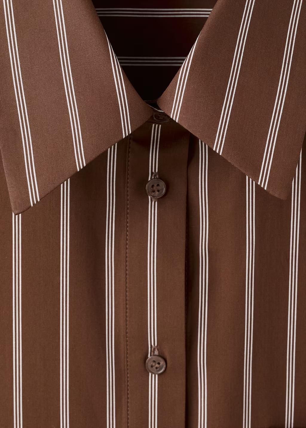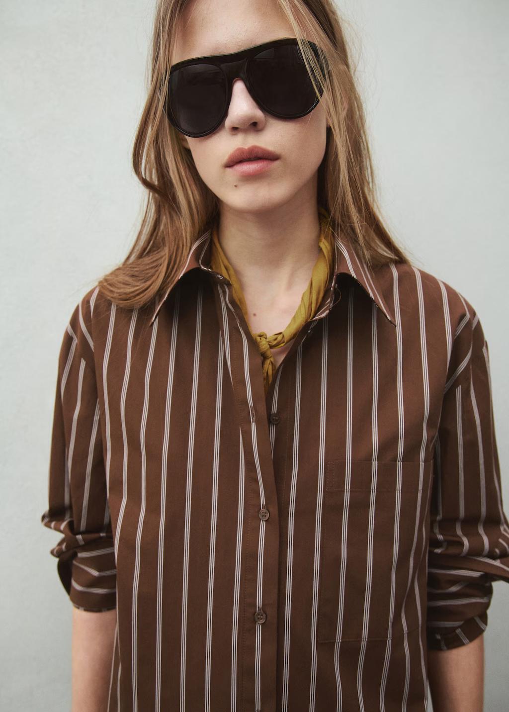 Tejido de algodón. Diseño recto. Estampado de rayas. Manga larga con puños abotonados. Bolsillo de parche en el pecho. Cierre de botones en la parte delantera. Total look