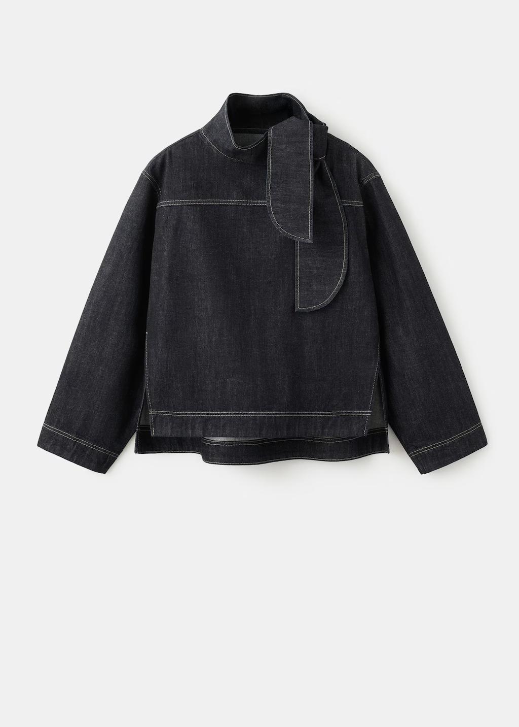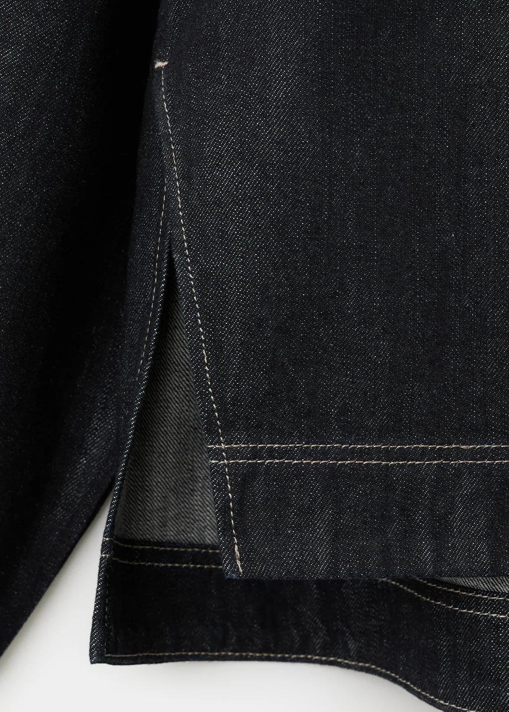 Tejido de algodón estilo tejano vaquero. Diseño recto. Nudo en el cuello. Manga larga. Costuras en contraste. Sin cierre. Aberturas laterales. Total look