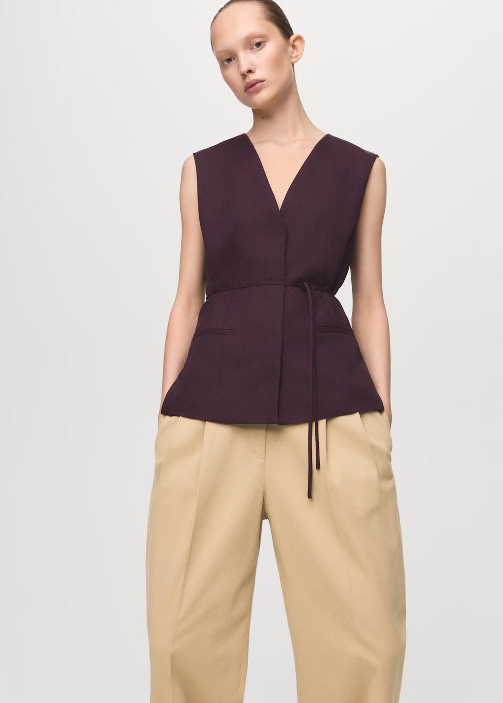 Esta blusa está confeccionada con un tejido con mezcla de lyocell. Con un diseño entallado, cuello pico y tirantes anchos. Incluye dos bolsillos de ribete frontales y un lazo ajustable en la cintura. El cierre es mediante botones delanteros ocultos. Cuenta con un pantalón de estilo traje a conjunto para formar un 'total look'. Exclusivo Online