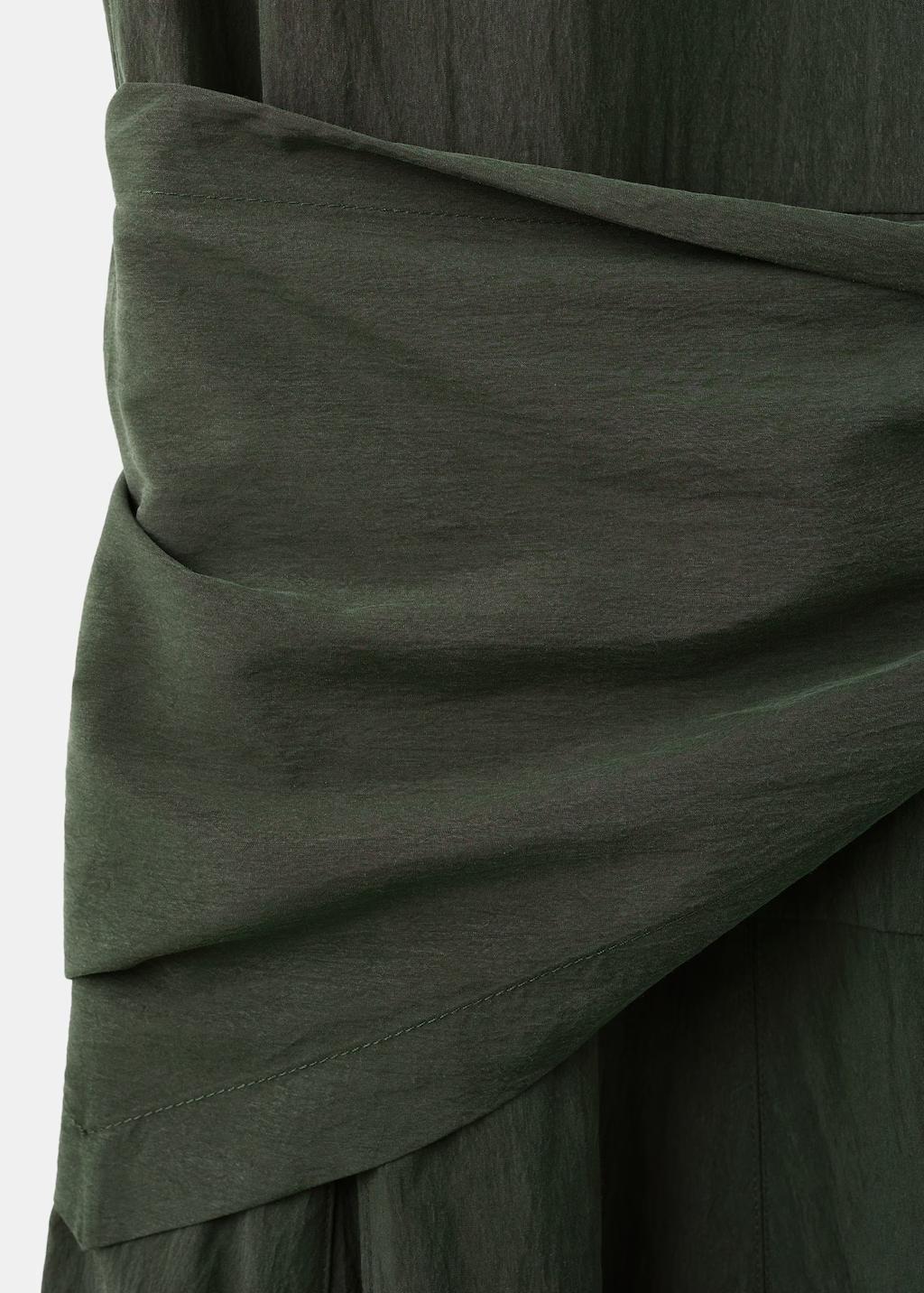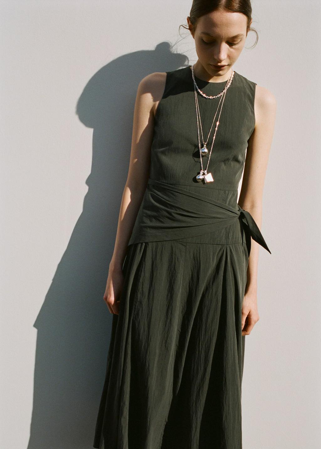 Tejido mezcla lyocell. Diseño midi. Diseño evasé. Cuello redondo. Sin mangas. Tirante ancho. Detalle de pañuelo en la cintura. Cierre de cremallera lateral. Disponible Plus