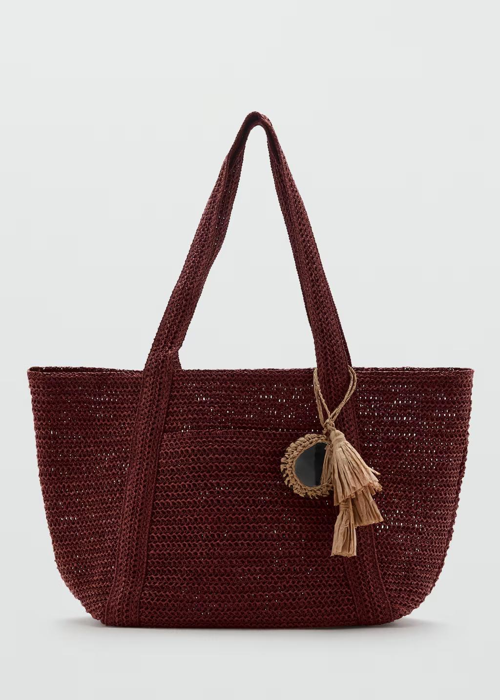 Tejido de fibra natural. Diseño tote. Dos asas largas de hombro. Detalle de charm. Sin cierre. 54.0x32.0x18.0 cm (Largo x Alto x Ancho)