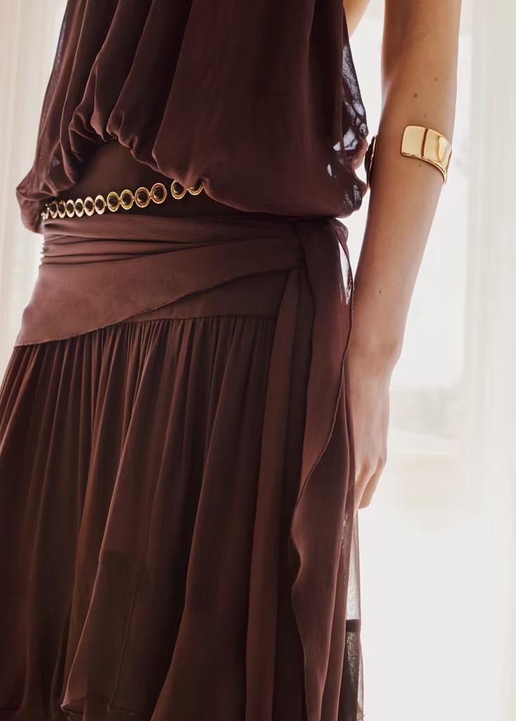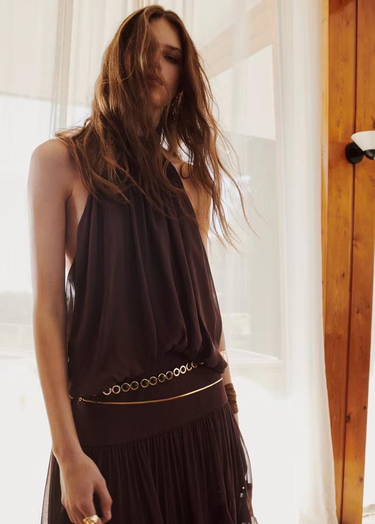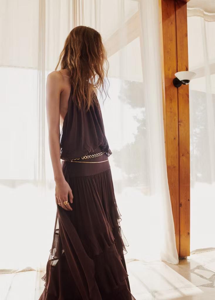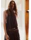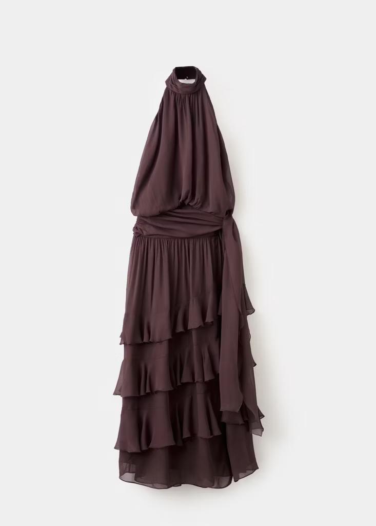 Diseño recto. Diseño largo. Detalle de volantes. Detalles fruncidos. Cuello halter. Sin mangas. Pañuelo extraible. Cierre de botón en el cuello. Exclusivo Online