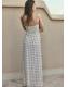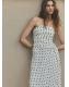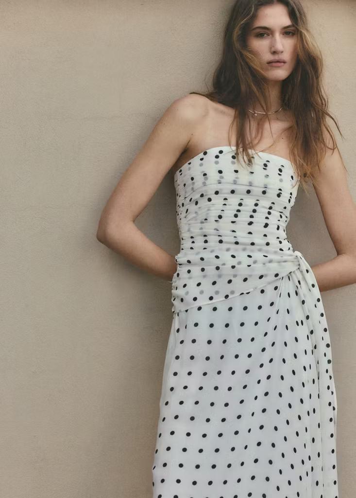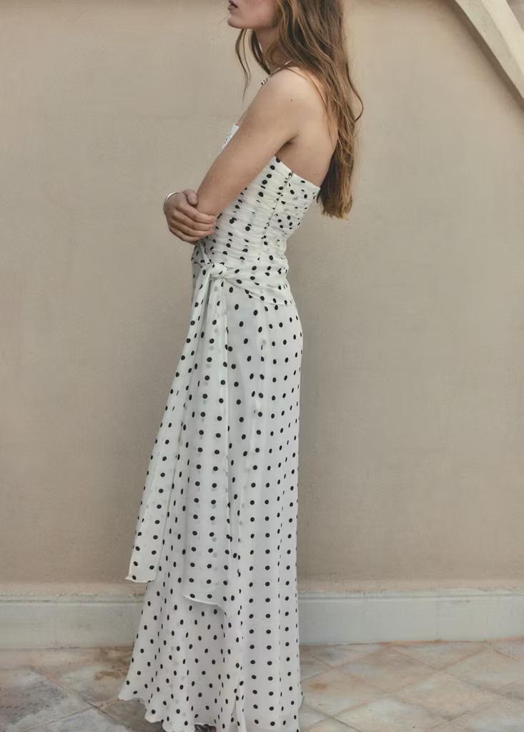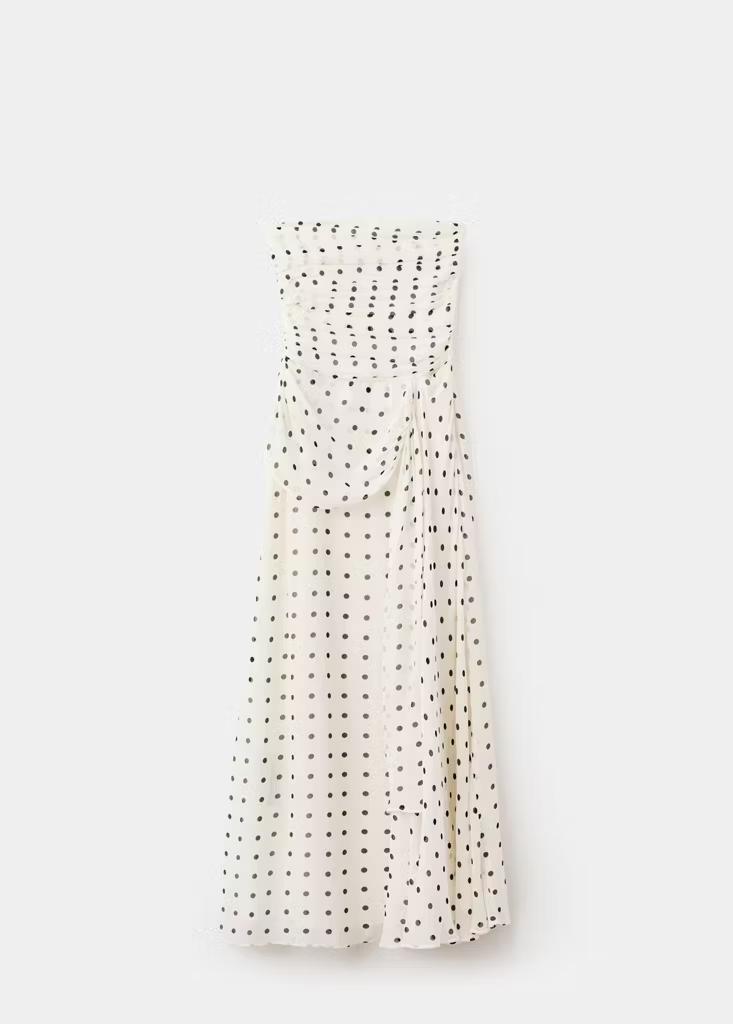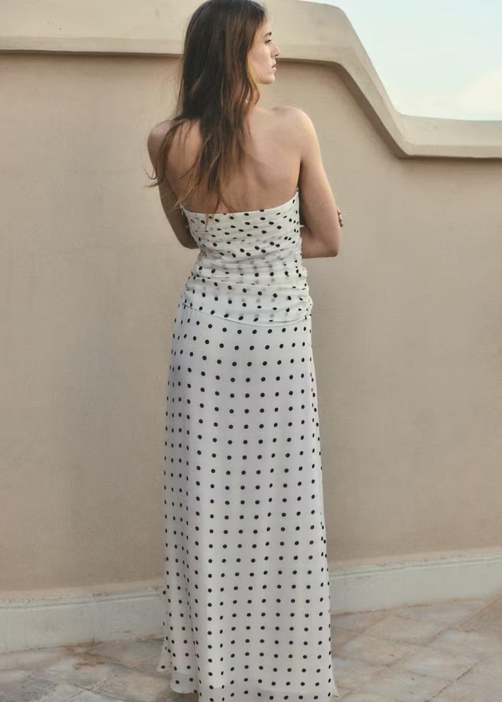 Diseño largo. Diseño evasé. Estampado de lunares. Palabra de honor. Abertura lateral. Forro interior. Cierre de cremallera lateral. Exclusivo Online