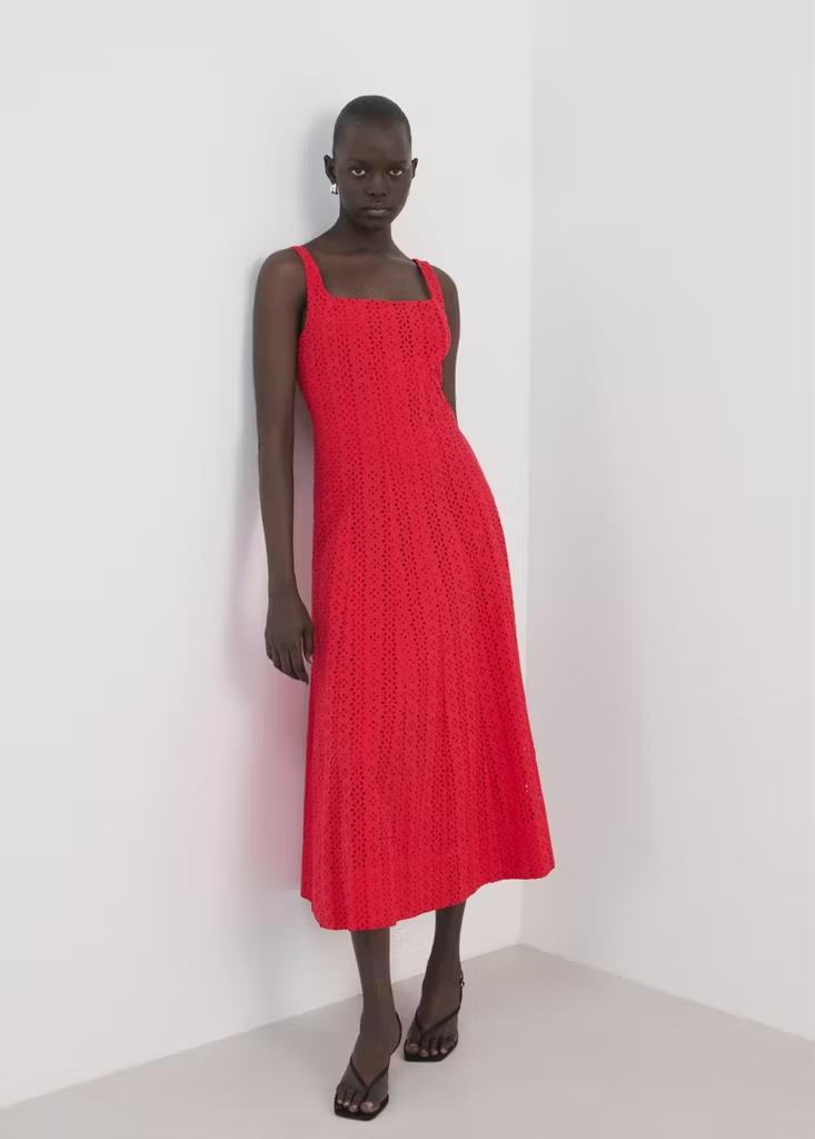 Tejido 100% algodón. Diseño midi. Diseño evasé. Detalles bordados calados. Escote recto. Sin mangas. Tirante fino. Cierre de cremallera lateral. Forro interior. El color negro es exclusivo online