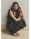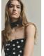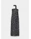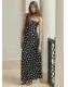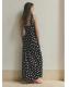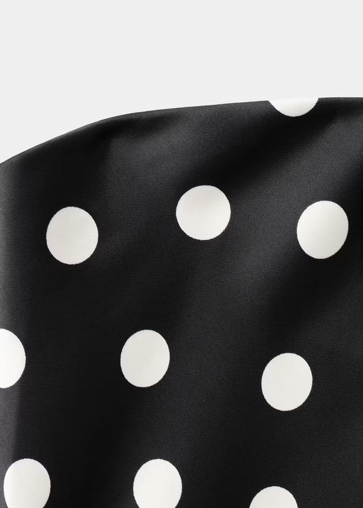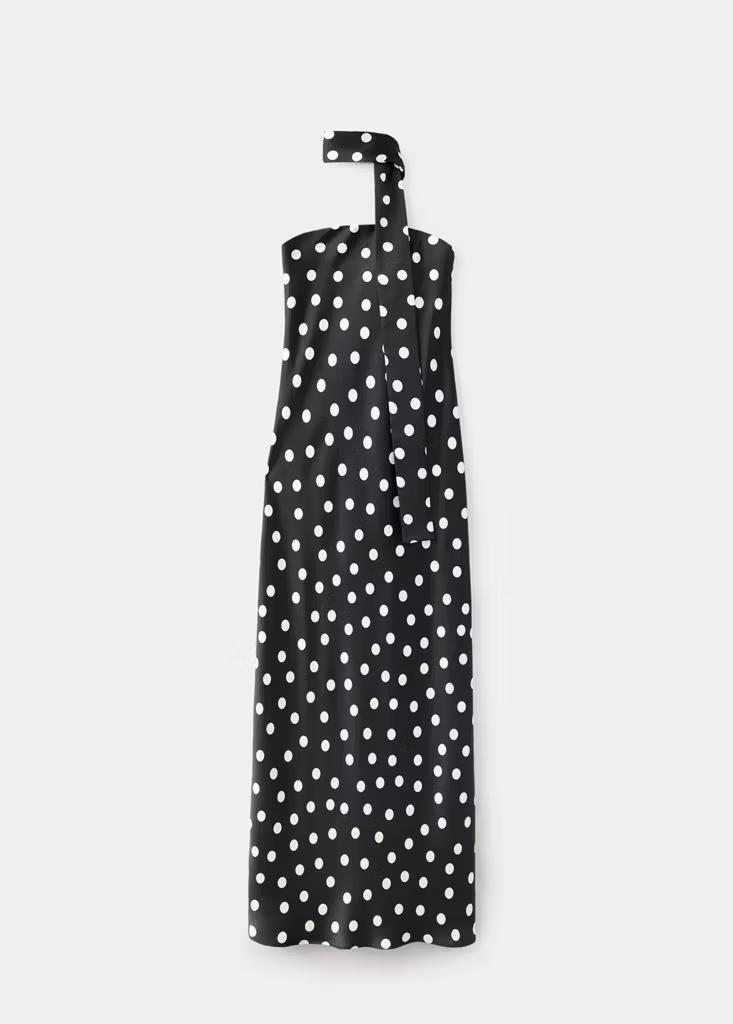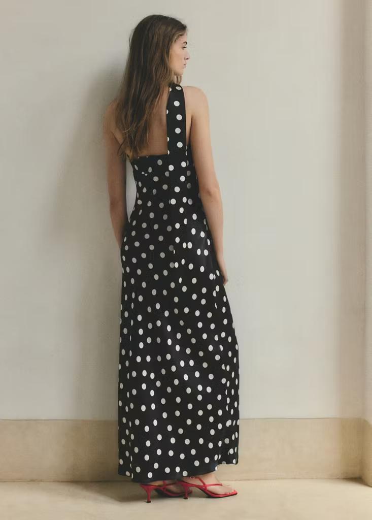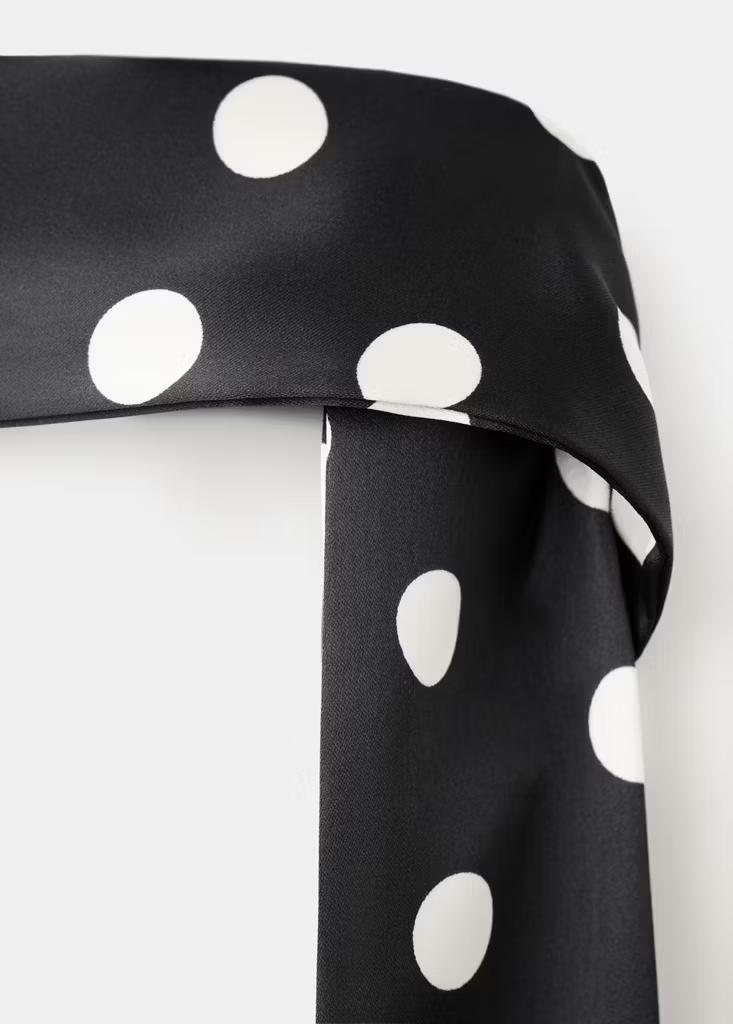 Tejido fluido. Diseño largo. Estampado de lunares. Palabra de honor. Adorno de fular en el cuello