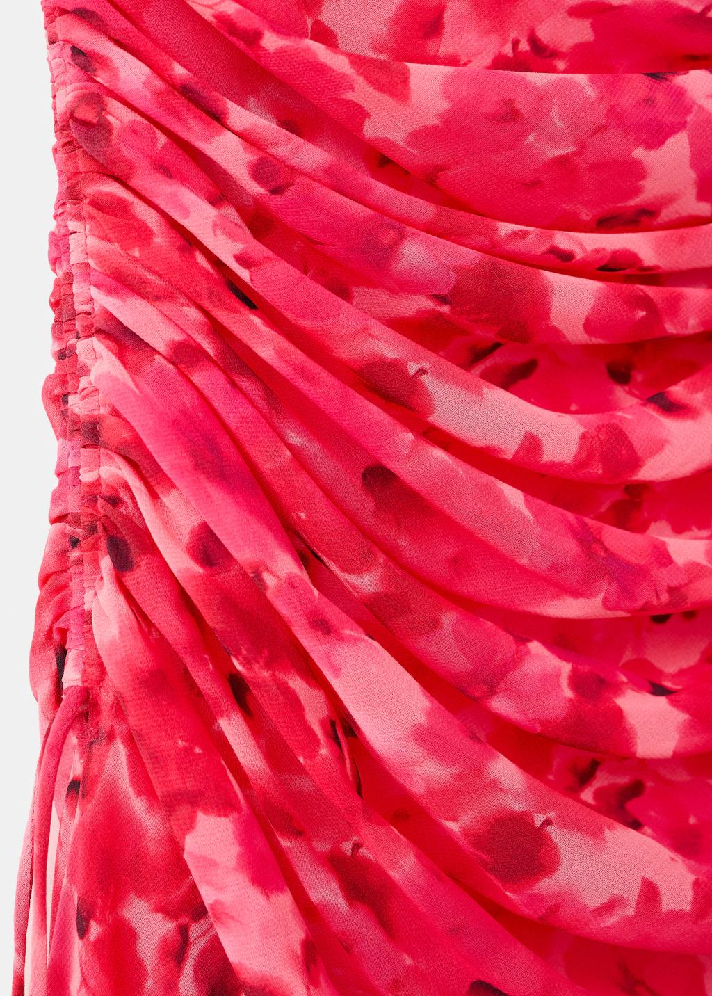 Diseño midi. Diseño asimétrico. Estampado de flores. Panel fruncido en la cintura. Cierre de cremallera lateral. Esta prenda pertenece a nuestra colección de fiesta y evento, diseñada para elevar tus looks en ocasiones especiales