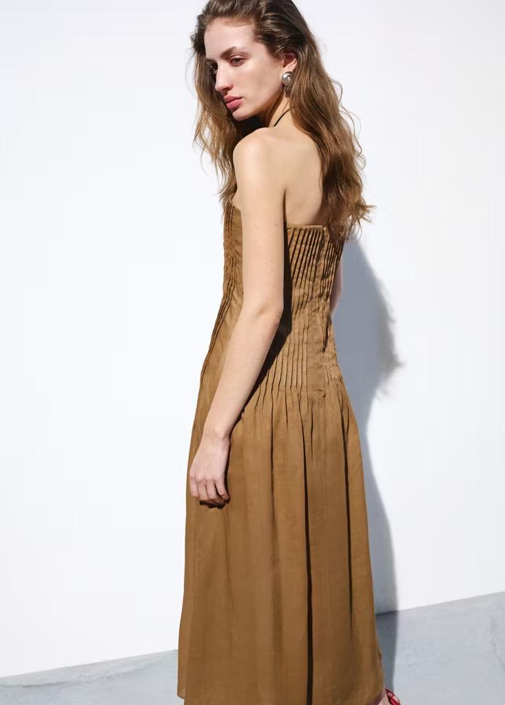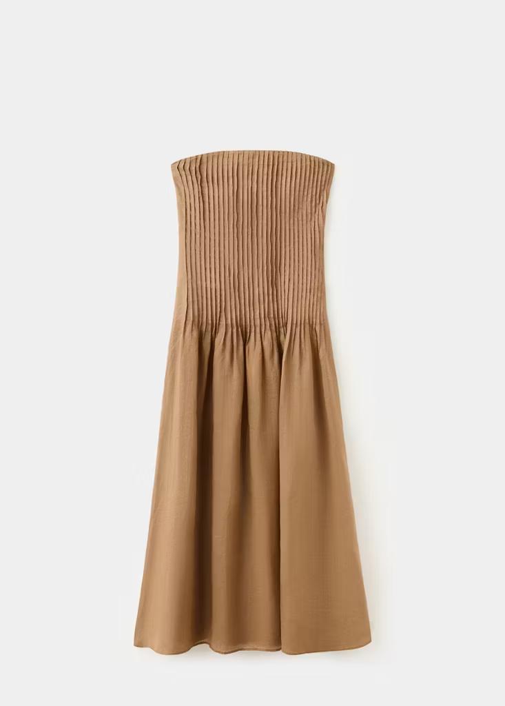 Tejido 100% ramio. Diseño largo. Diseño evasé. Diseño plisado. Diseño combinado. Palabra de honor. Cierre de cremallera en la parte posterior. Forro interior. Colección Selection. Una selección de prendas refinadas, confeccionadas con tejidos de calidad para construir un armario femenino y contemporáneo