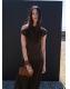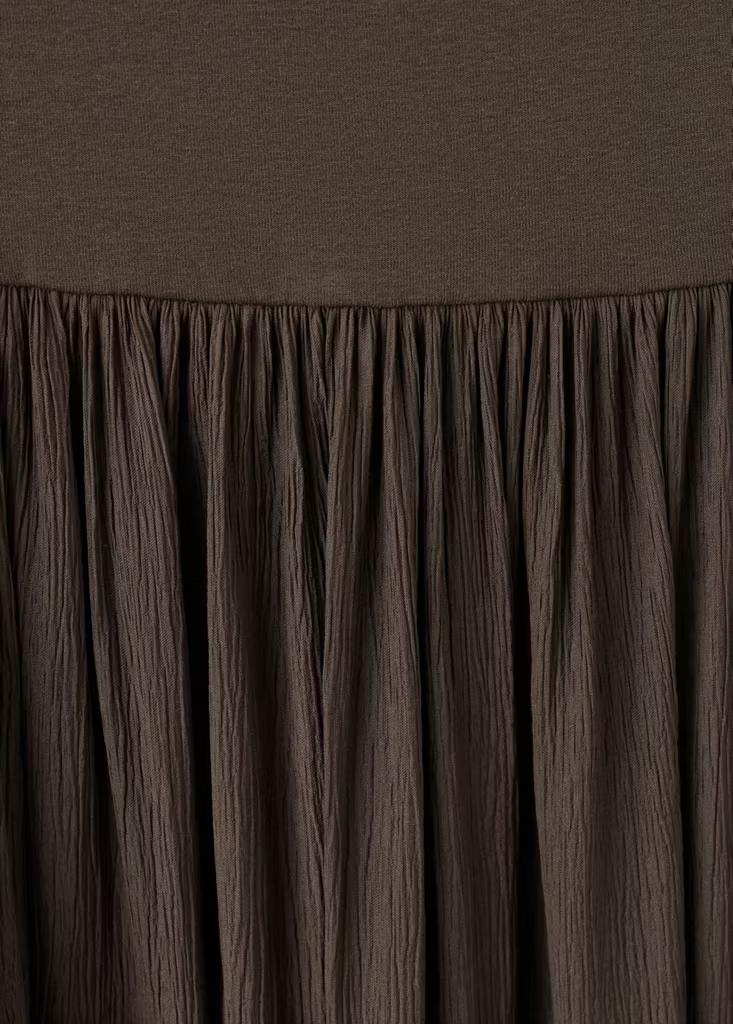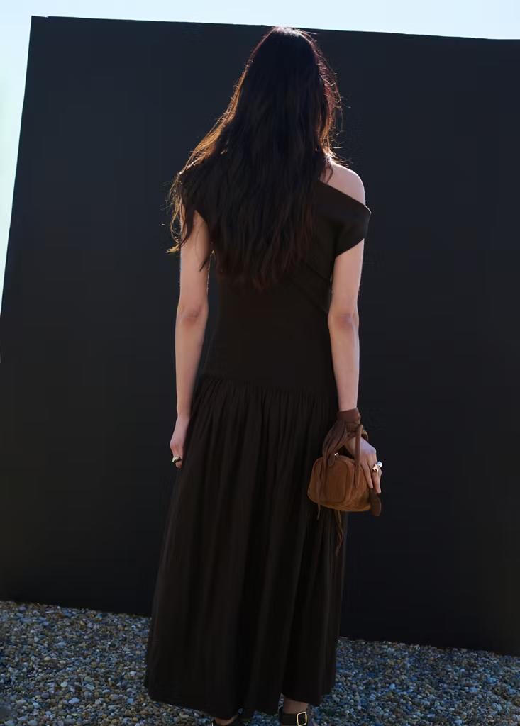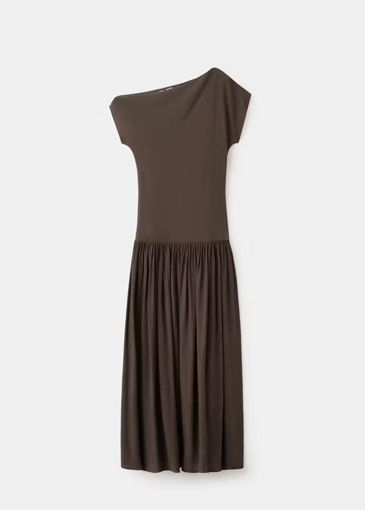 Tejido de algodón. Diseño asimétrico. Diseño evasé. Diseño largo. Cuello barco. Manga corta. Forro interior