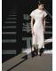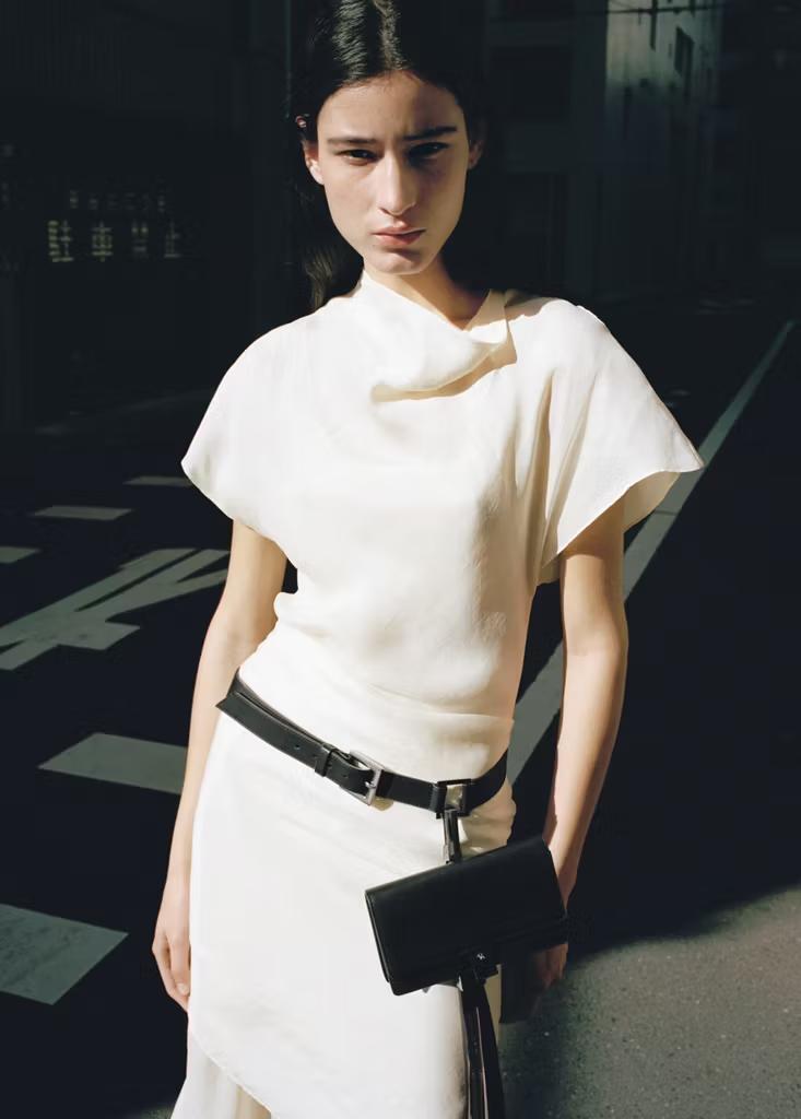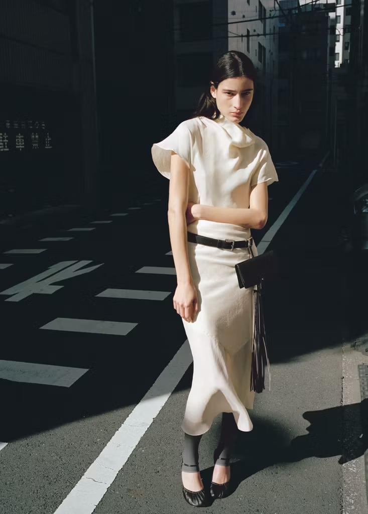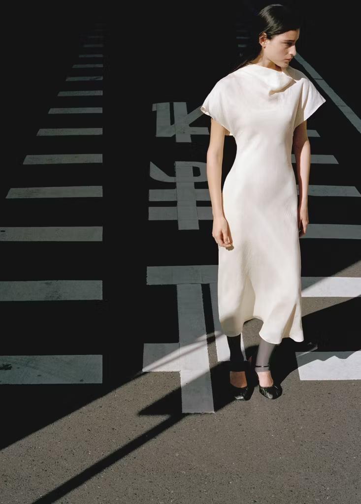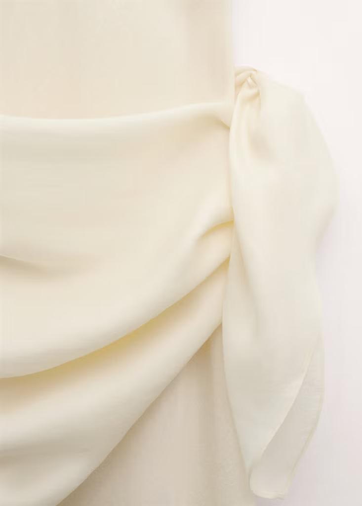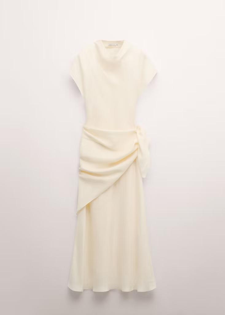 Tejido de lyocell. Diseño combinado. Diseño largo. Diseño evasé. Cuello drapeado. Manga corta. Detalle de nudo en la cintura. Cierre de cremallera lateral. Colección Selection. Una selección de prendas refinadas, confeccionadas con tejidos de calidad para construir un armario femenino y contemporáneo
