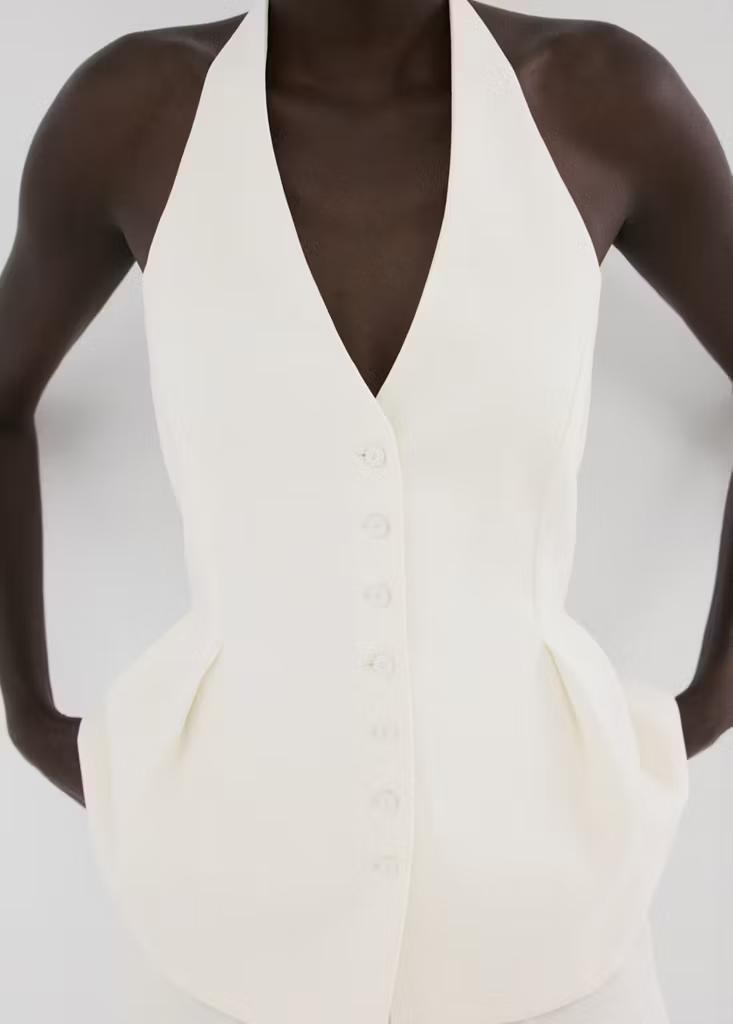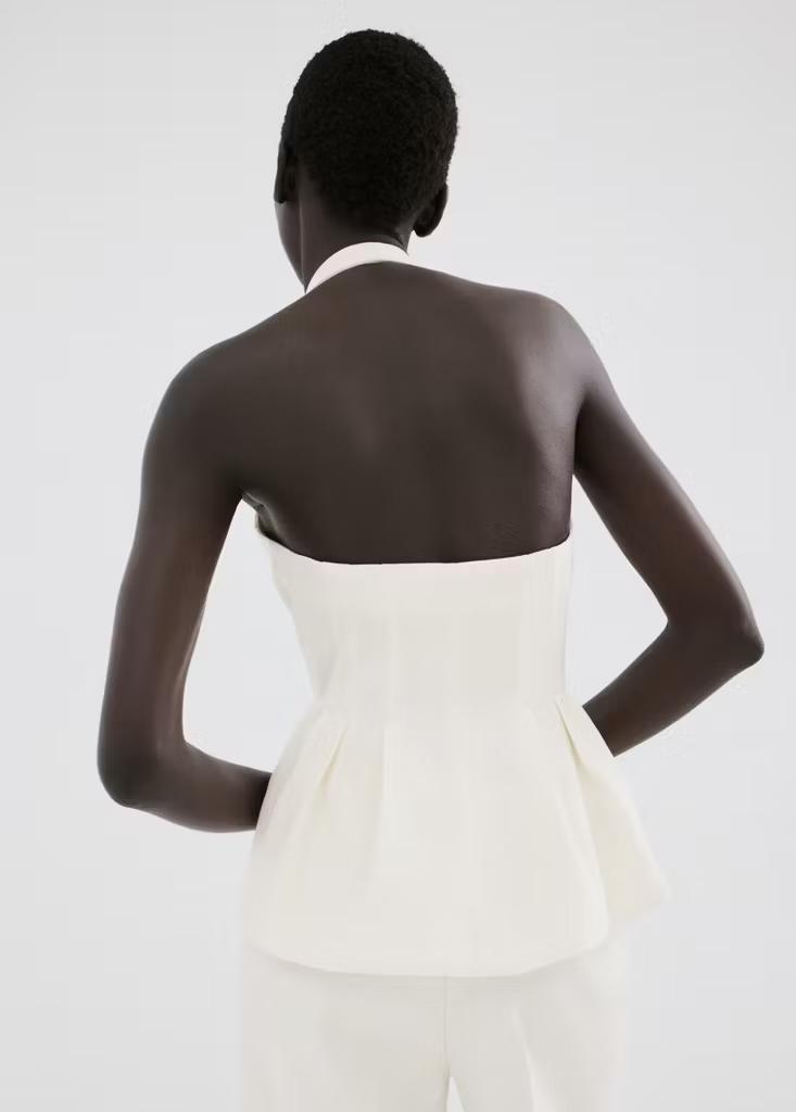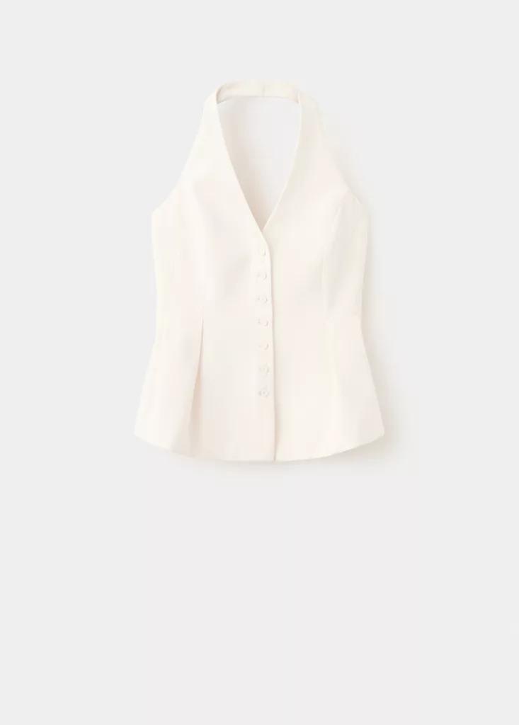 Diseño entallado. Corte peplum. Cierre delantero con botones. Escote de pico. Cuello halter. Sin mangas. Tirantes finos. Total look. Disponible Plus