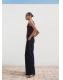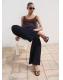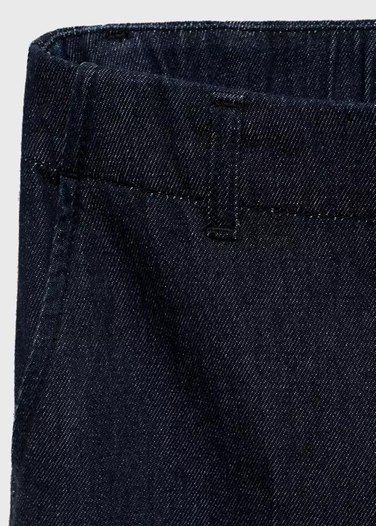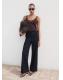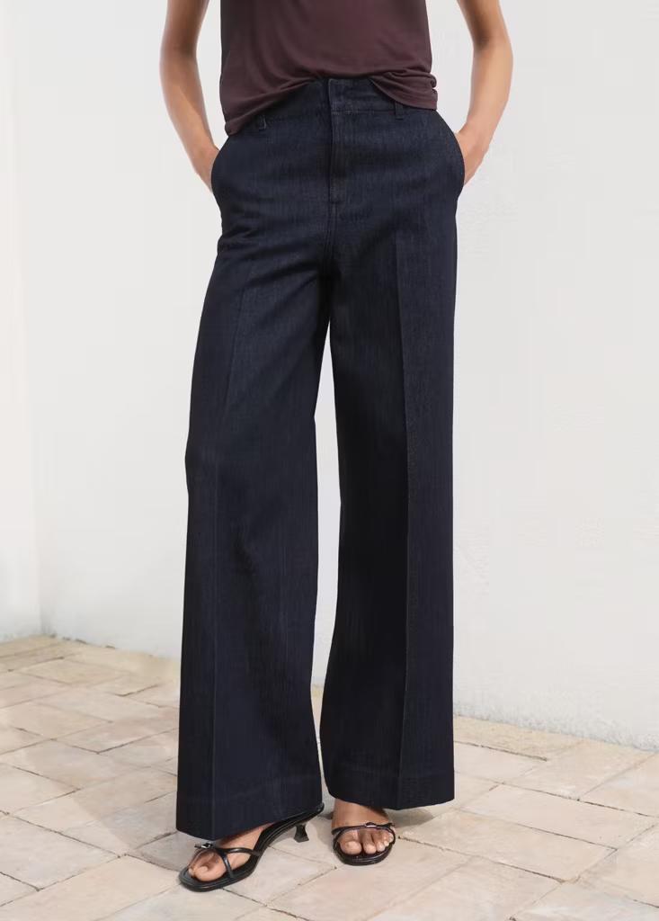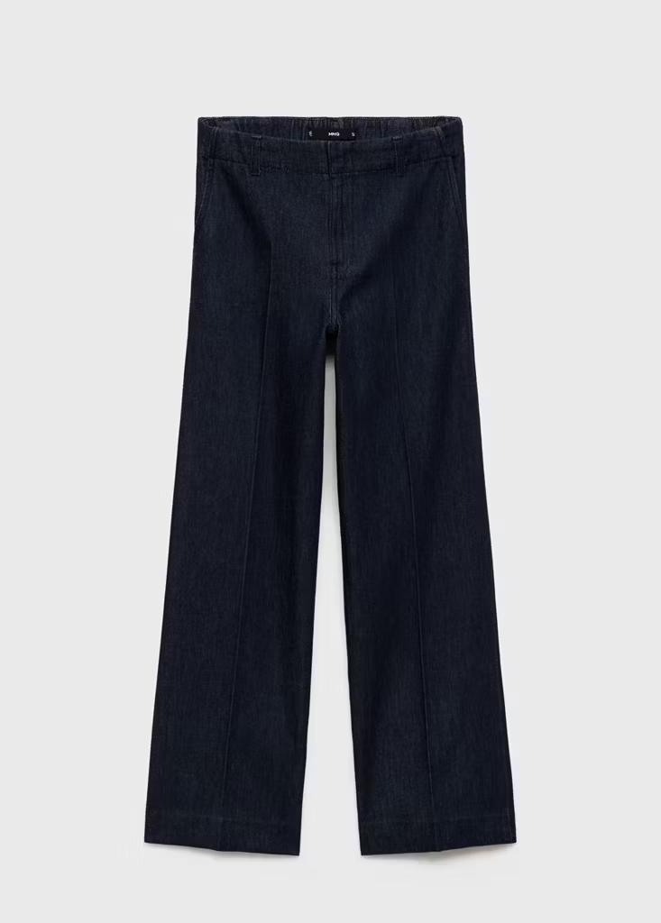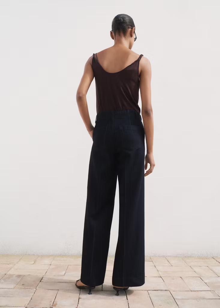 Tejido de algodón estilo tejano vaquero. Diseño largo. Diseño wideleg. Tiro alto. Trabillas. Cuatro bolsillos. Terminaciones sin costuras. Cierre oculto de botón, gancho y cremallera. Forro interior