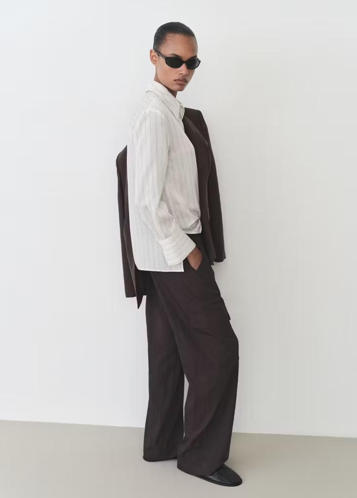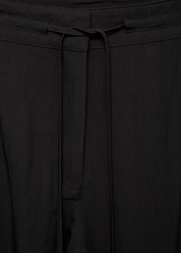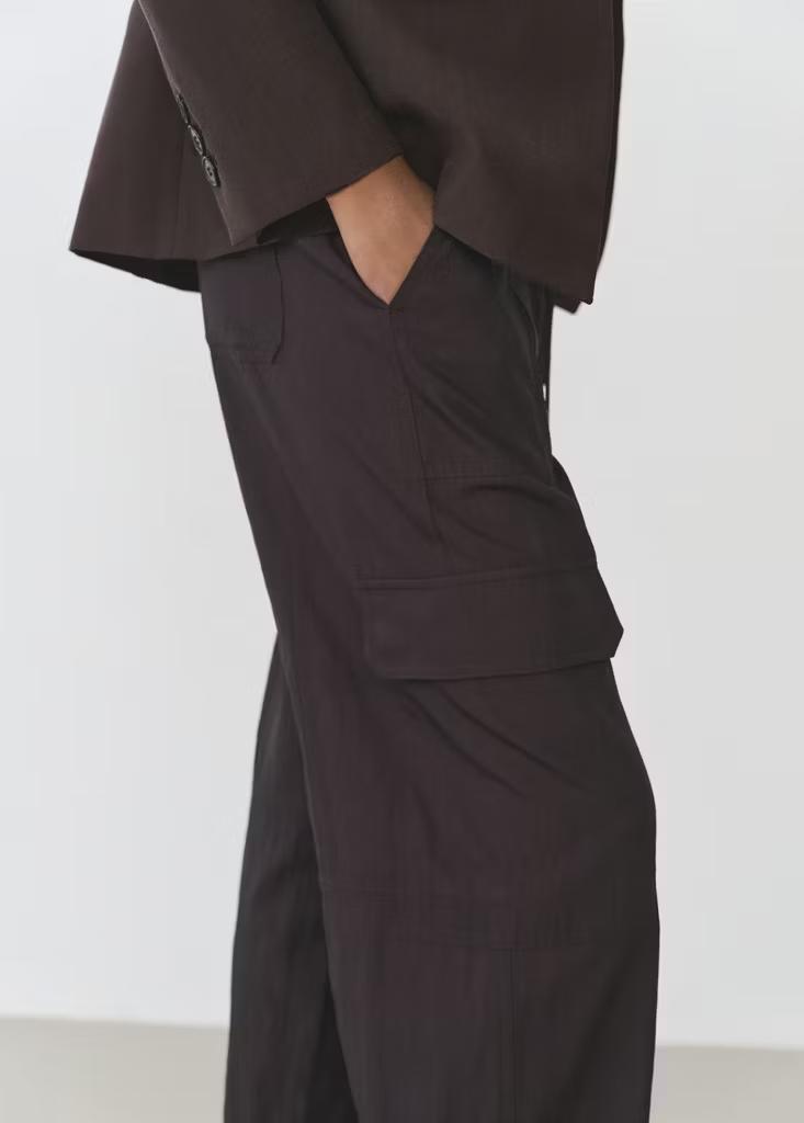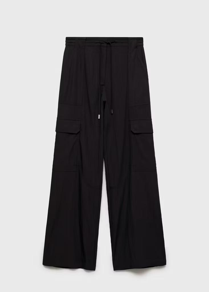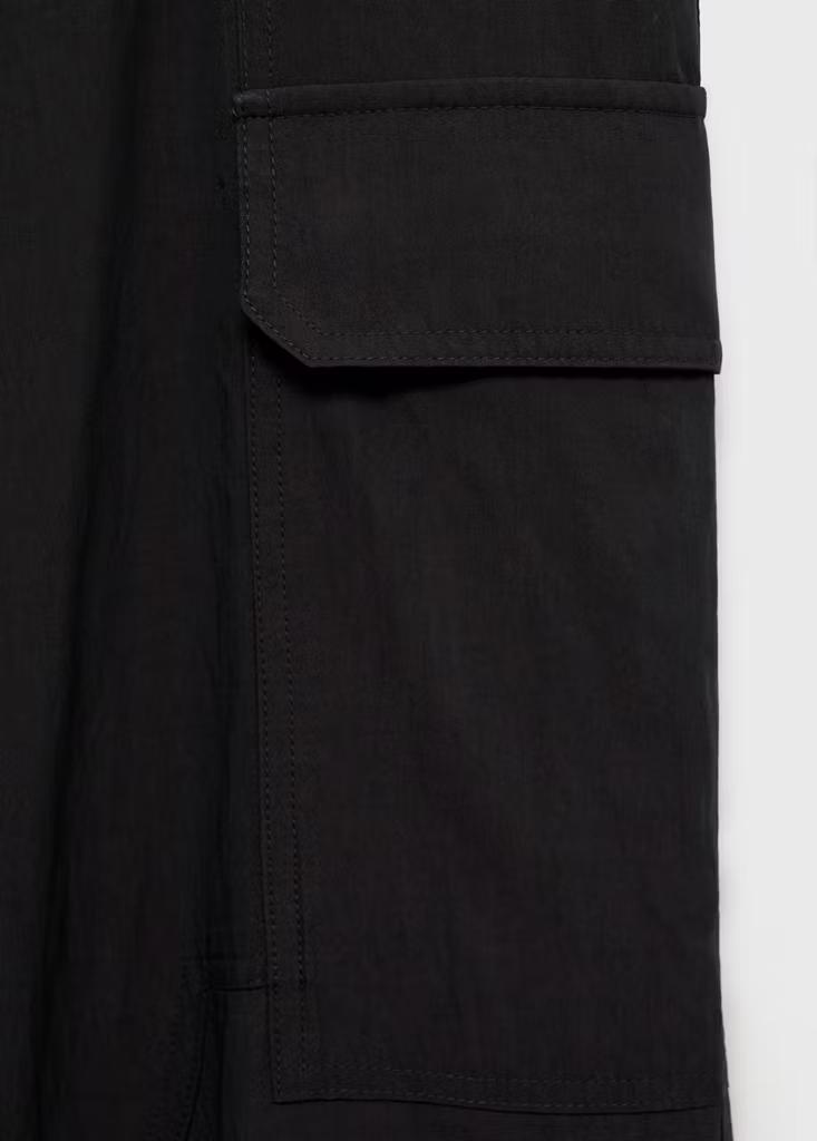 Tejido fluido. Diseño recto. Diseño cargo. Tiro medio. Trabillas. Cintura con goma elástica. Dos bolsillos laterales. Dos bolsillos de parche y solapa en la pierna. Sin cierre