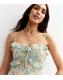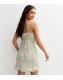 Design: floral print, frilly trims, back waist ties